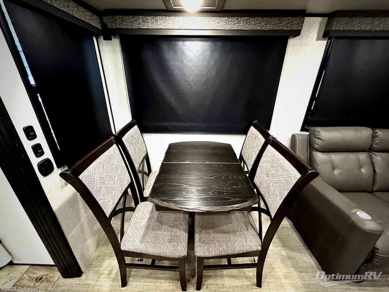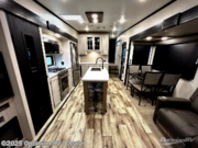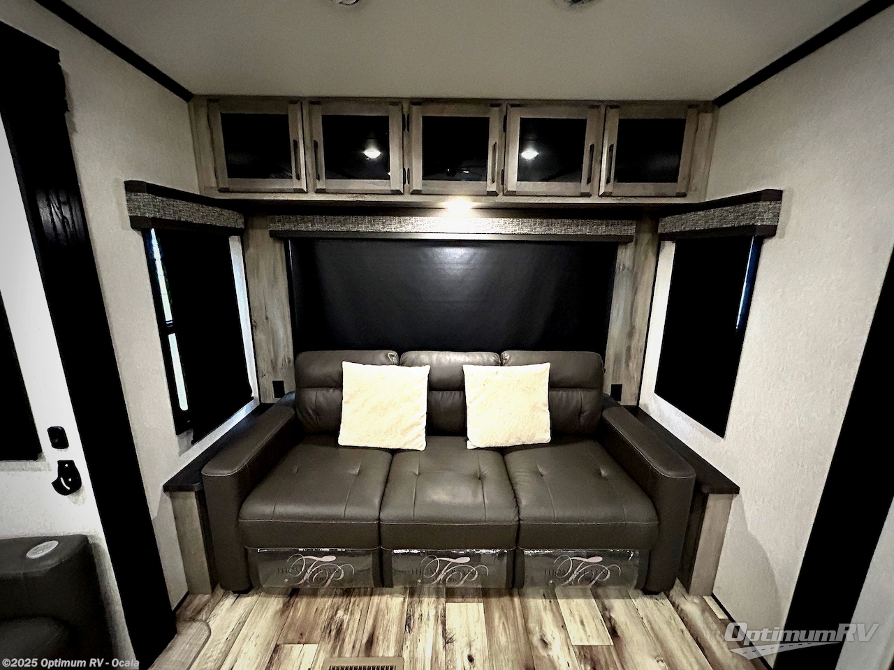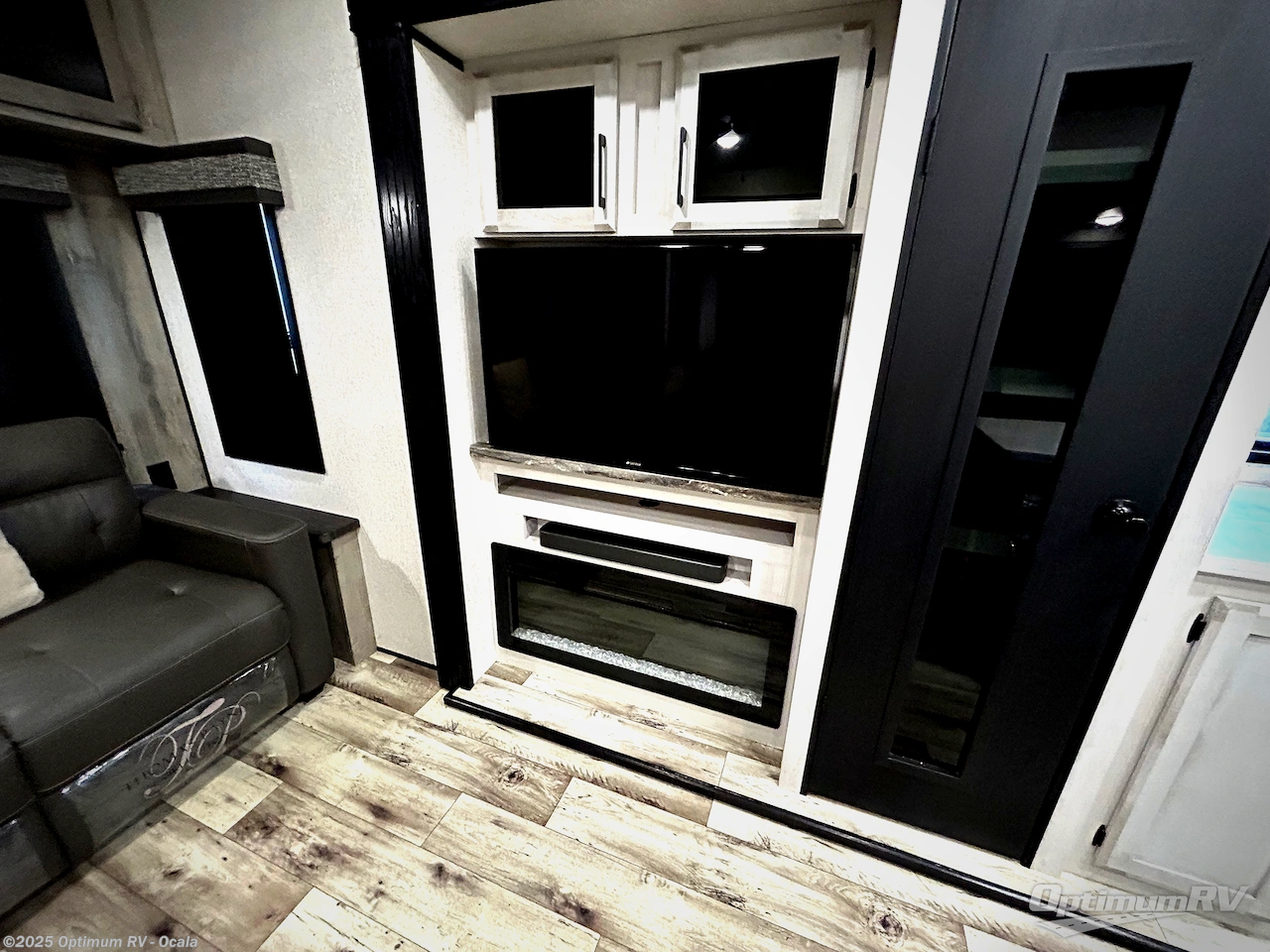 Don't pass up your chance to camp in true luxury with this fifth wheel! There is a kitchen island with two bar stools for others to help prepare dinner which can be either cooked on the four burner range or inside the 24" oven. The hutch can store your dishes and the large pantry can store your favorite snacks/canned goods. After a fun day at the beach, rinse the sand out in the 48" x 30" residential shower with a seat in the full bathroom, plus it has a dual sink vanity for two to get ready at once in the morning. When it's time to relax either lay down on the king bed slide in the front private bedroom or head to the rear living area where you can lay on the hide-a-bed sofa or sit in the theater seating with USB charging across from the entertainment center with a 40" fireplace and 50" smart LED TV to watch a movie!