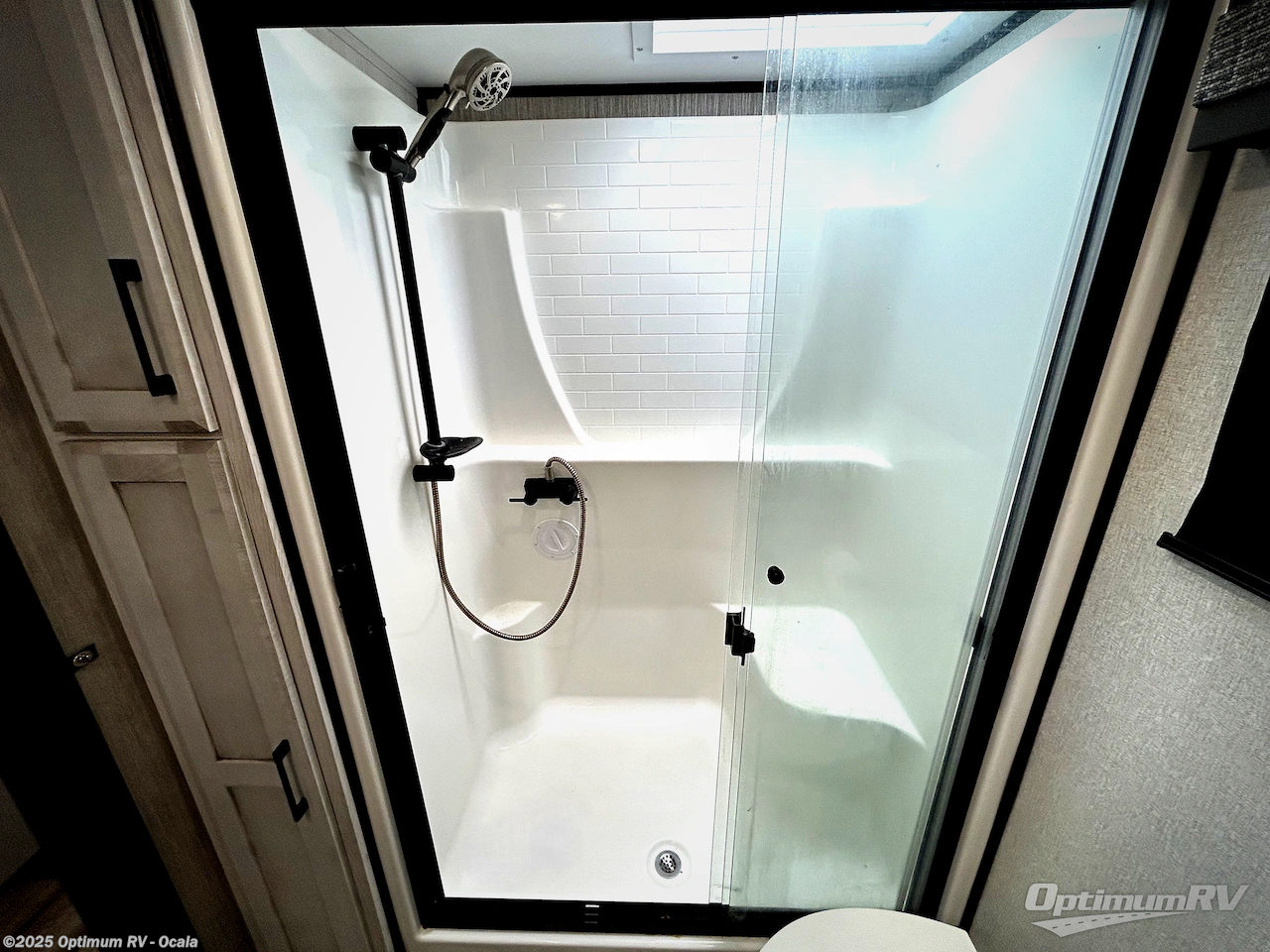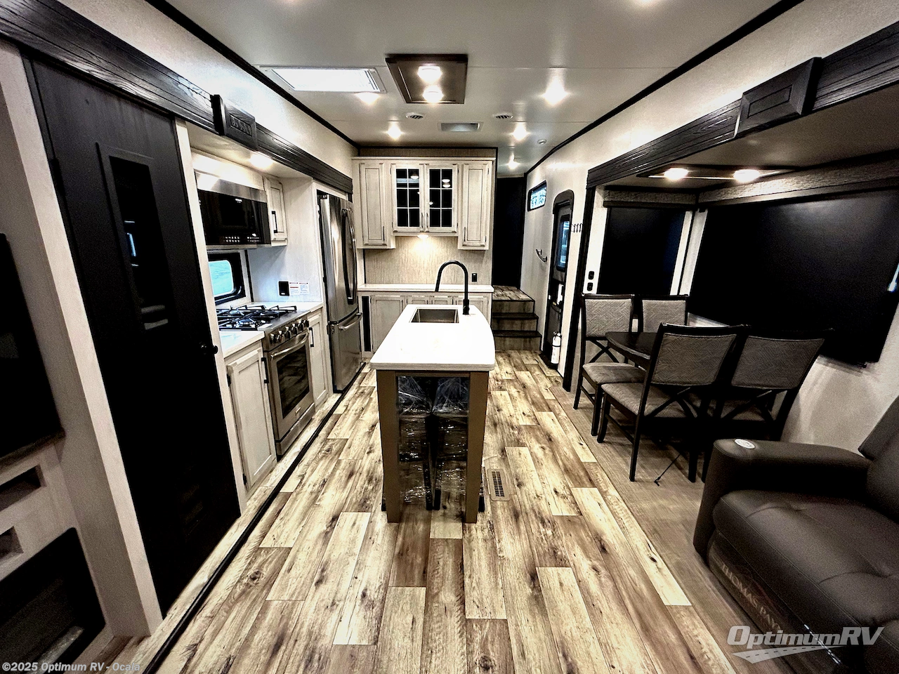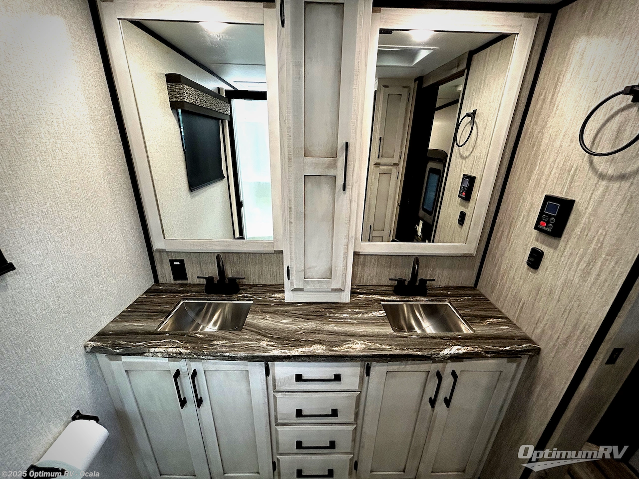 Don't pass up your chance to camp in true luxury with this fifth wheel! There is a kitchen island with two bar stools for others to help prepare dinner which can be either cooked on the four burner range or inside the 24" oven. The hutch can store your dishes and the large pantry can store your favorite snacks/canned goods. After a fun day at the beach, rinse the sand out in the 48" x 30" residential shower with a seat in the full bathroom, plus it has a dual sink vanity for two to get ready at once in the morning. When it's time to relax either lay down on the king bed slide in the front private bedroom or head to the rear living area where you can lay on the hide-a-bed sofa or sit in the theater seating with USB charging across from the entertainment center with a 40" fireplace and 50" smart LED TV to watch a movie!