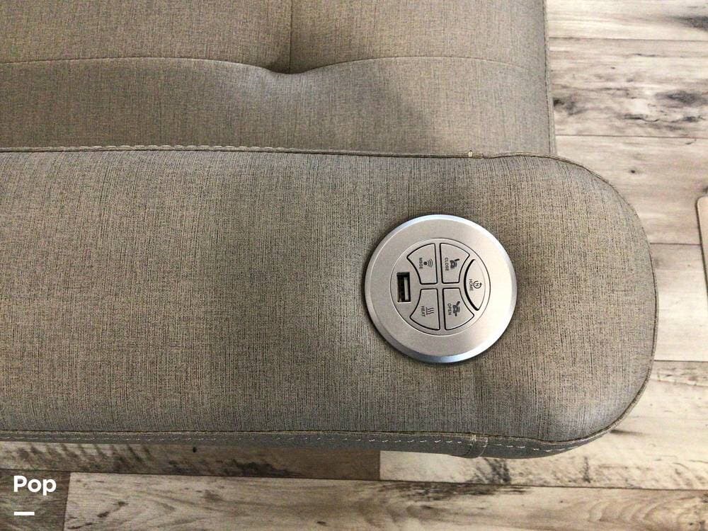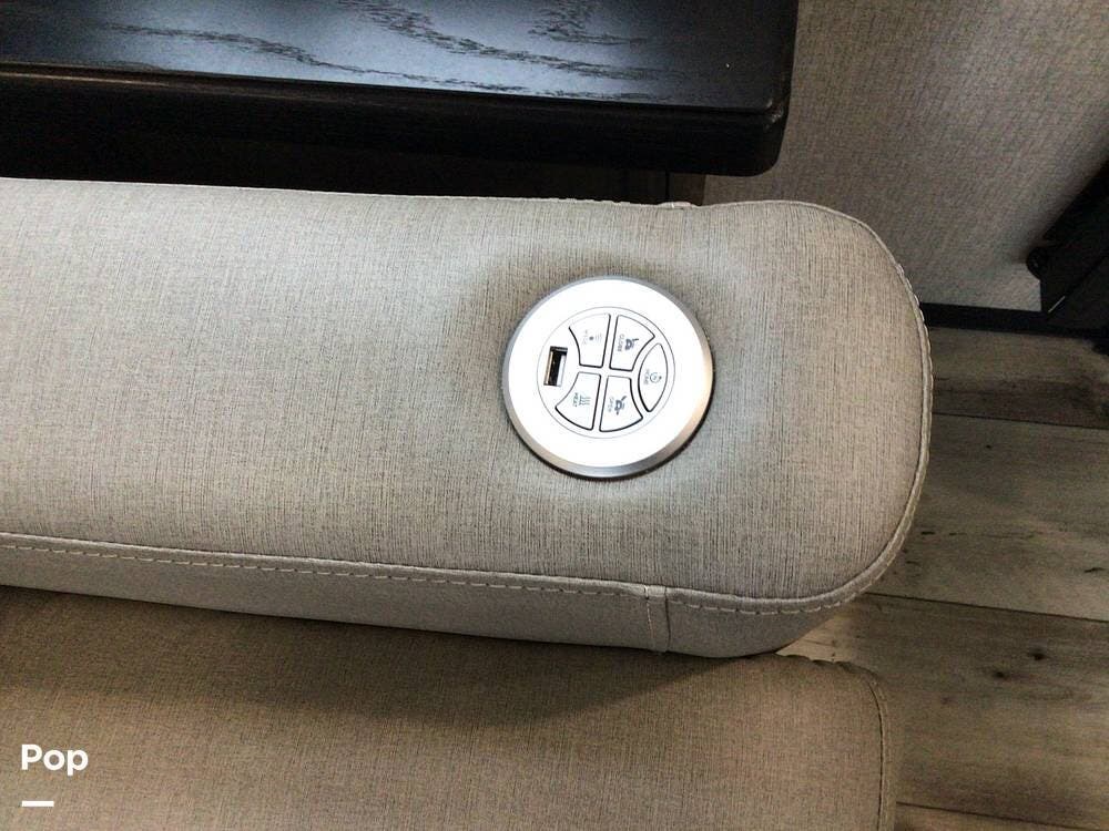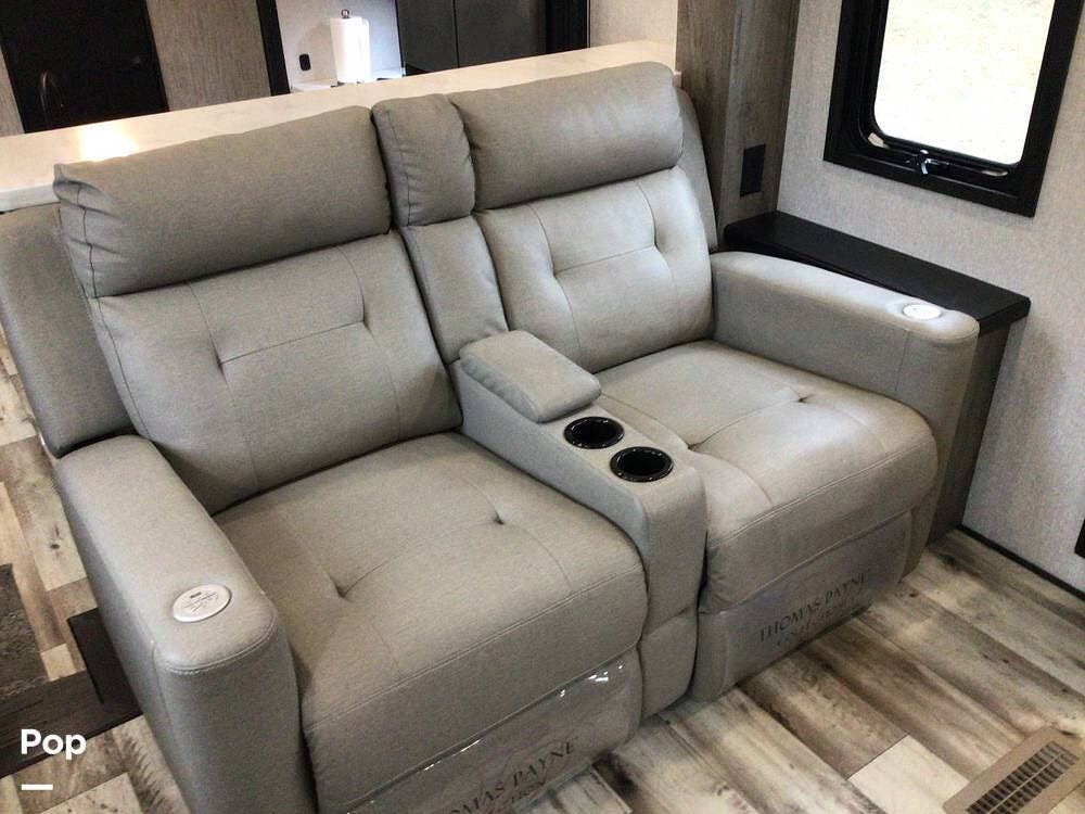The main living area features theater seating with heat, massage, and power recline and decline functions, a large 65" Smart LED TV, and a 40-inch wide view fireplace for a cozy ambiance. The interior boasts modern farmhouse cabinetry and luxury woven vinyl flooring in the slide-outs.