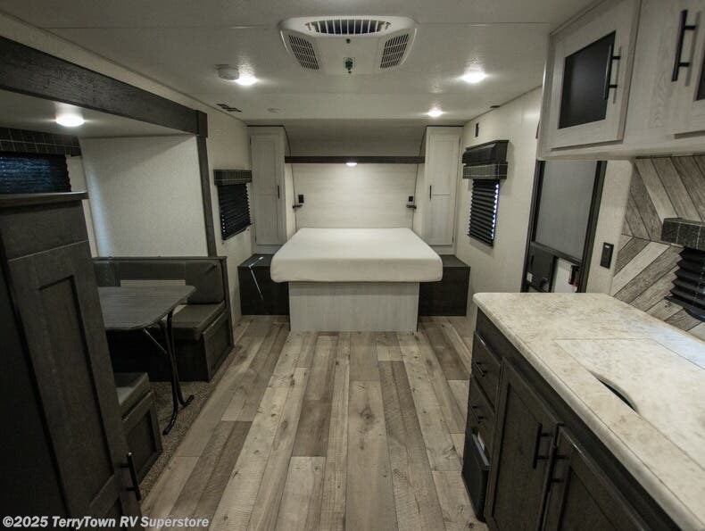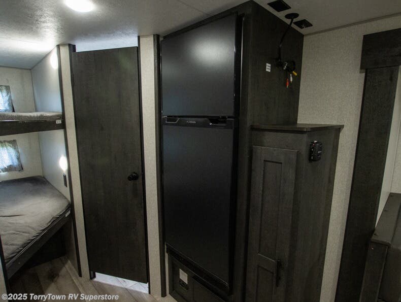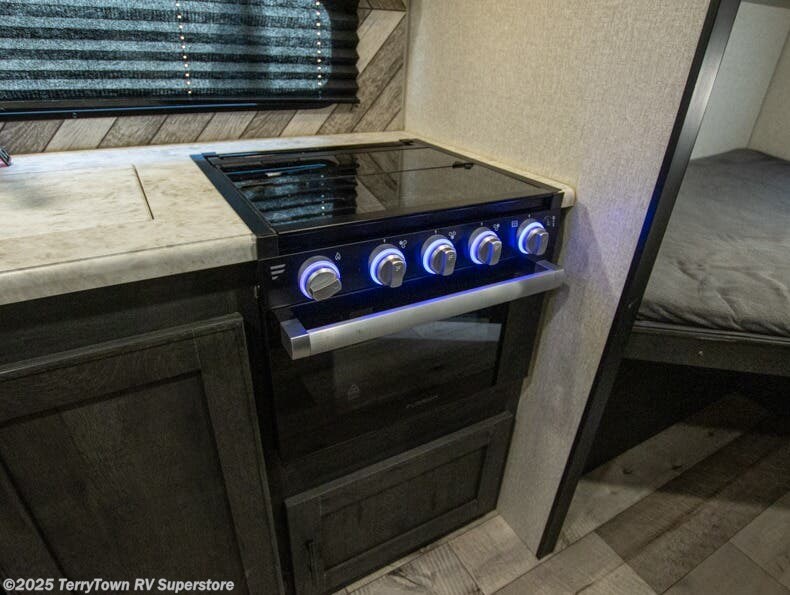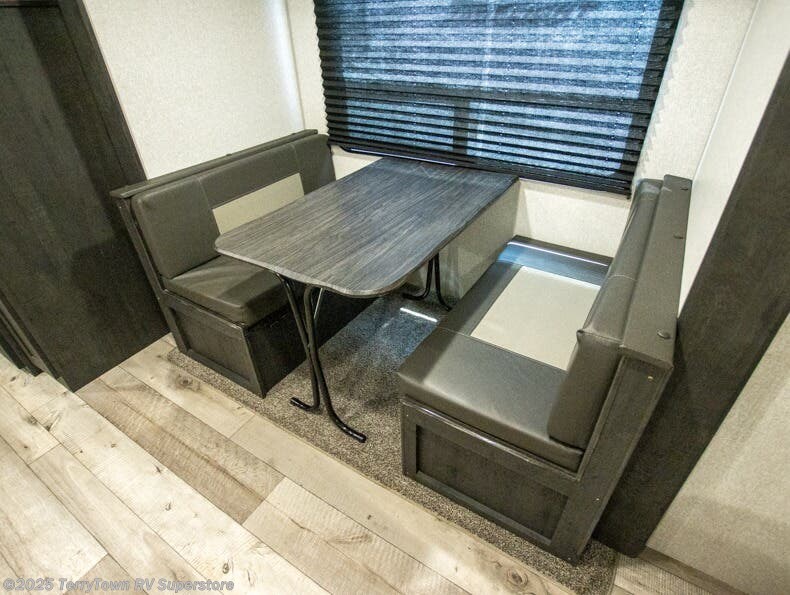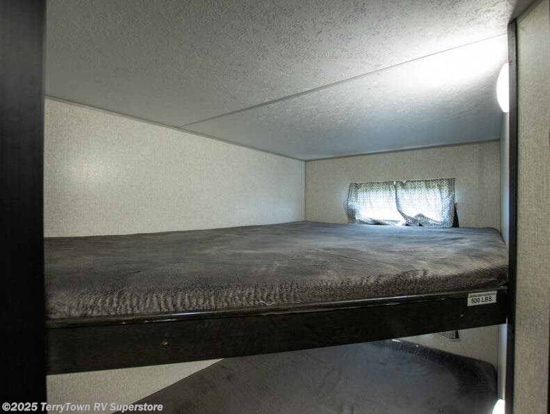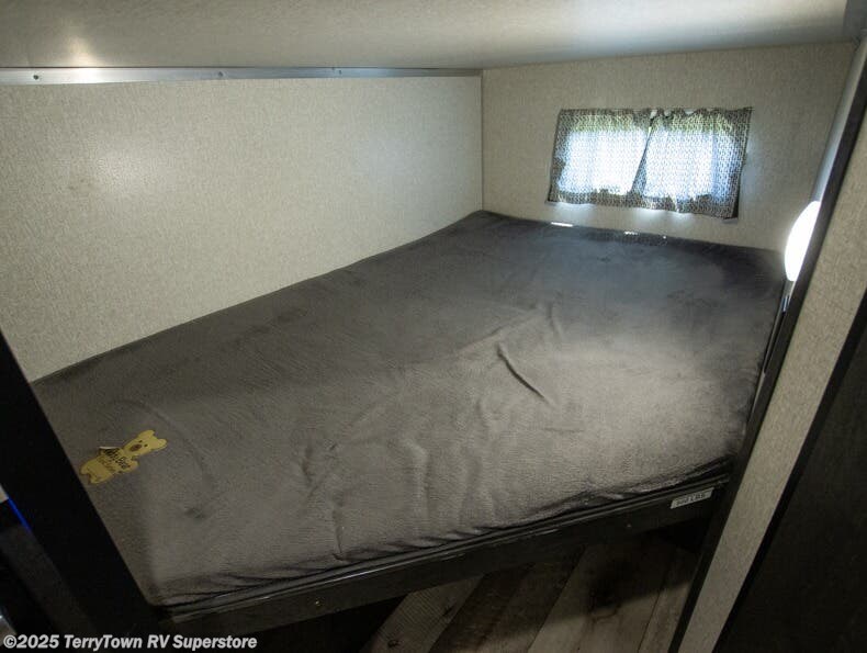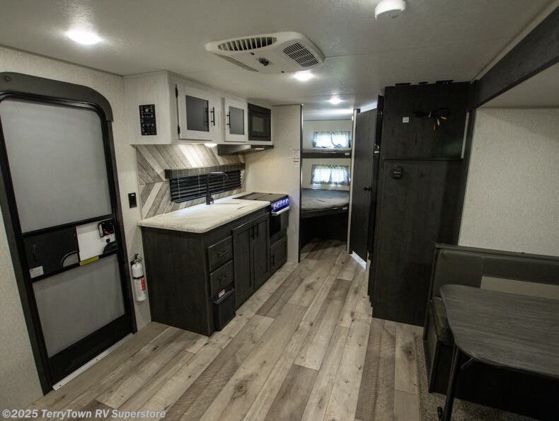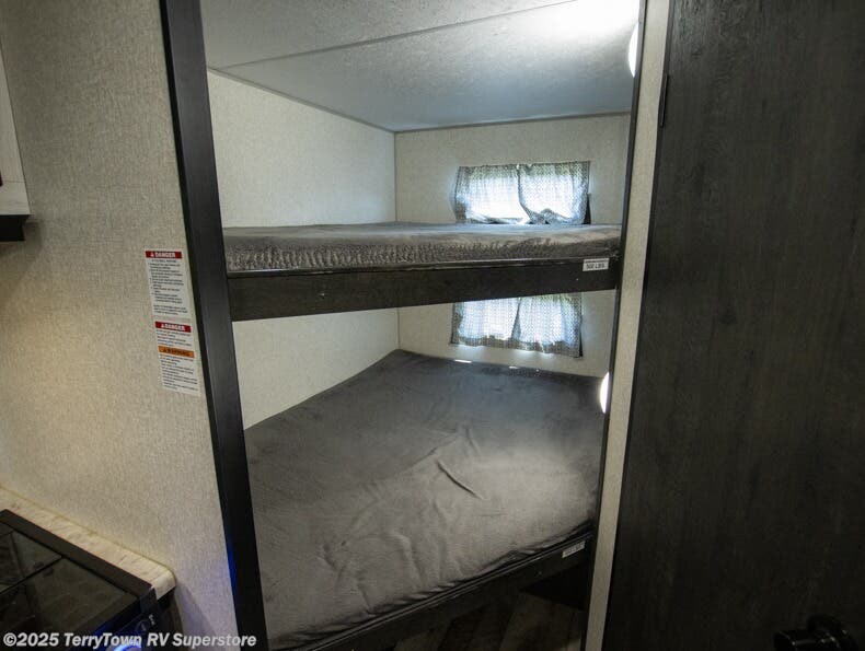 This travel trailer with double-size bunks will be perfect for camping with family or a large group of friends. There is an outside kitchen with a refrigerator and an outside griddle, plus an 18' power awning with LED lights. The chef of your group can prepare lunch on the three burner cooktop or in the microwave oven, and the little ones can take a rest on the double-size bunks. There is a 42" dinette within the slide out that will be perfect for meal times, game night, and sleeping space, plus there is a front queen bed with dual shirt closets.