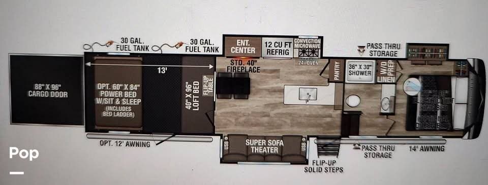 Whether you're hauling motorcycles, ATVs, or even a small car, this toy hauler will haul it all with its large garage. The garage is 13' with E-Track Universal System anchoring. There is a 30-gallon gas tank for the low hour generator (44.2) and your toys for convenience.