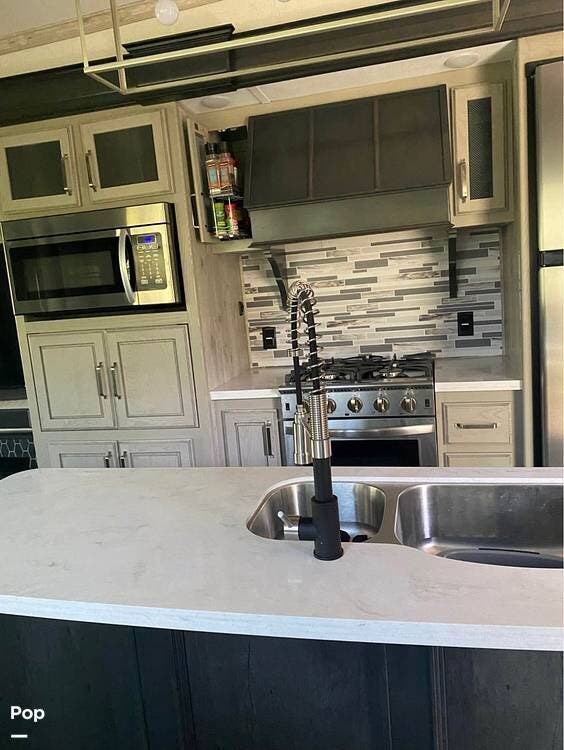 High ceilings, designer lighting, and Keystone's premium cabinetry throughout give this fifth wheel a true residential feel.