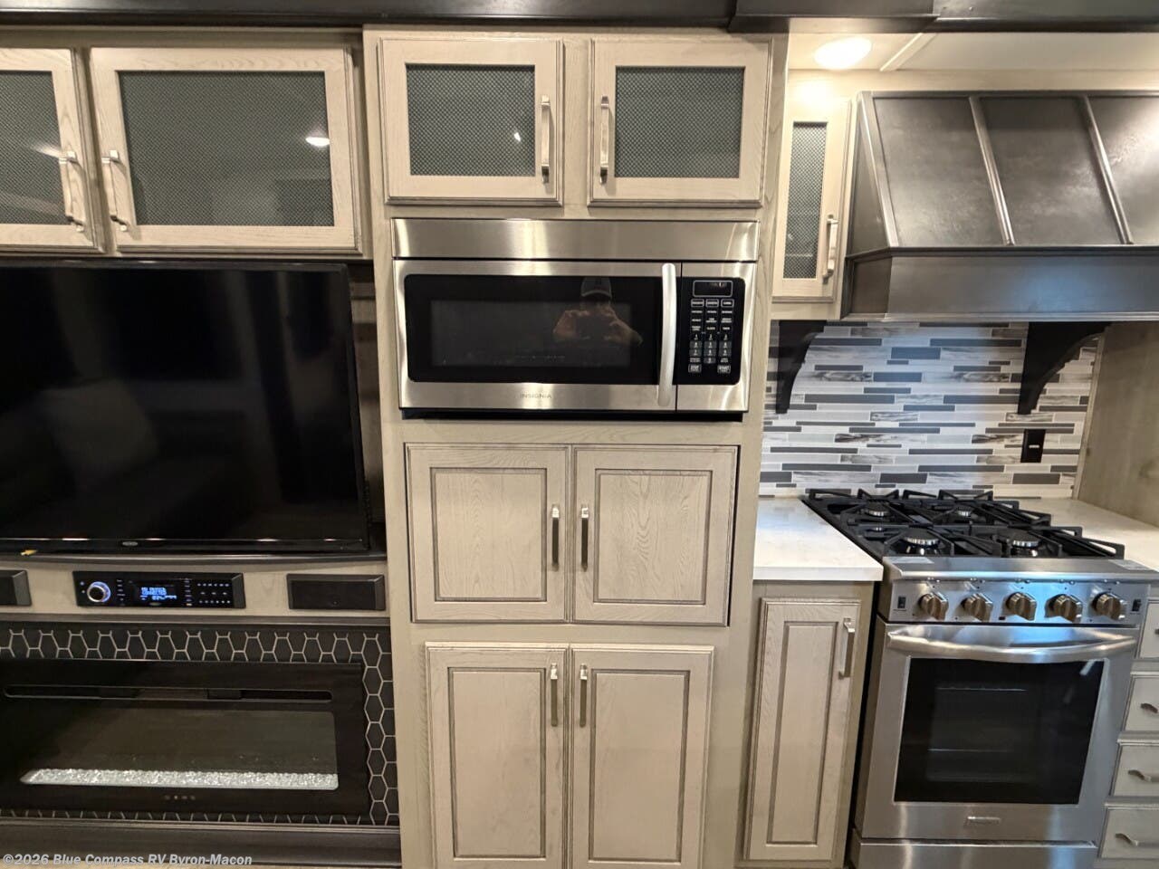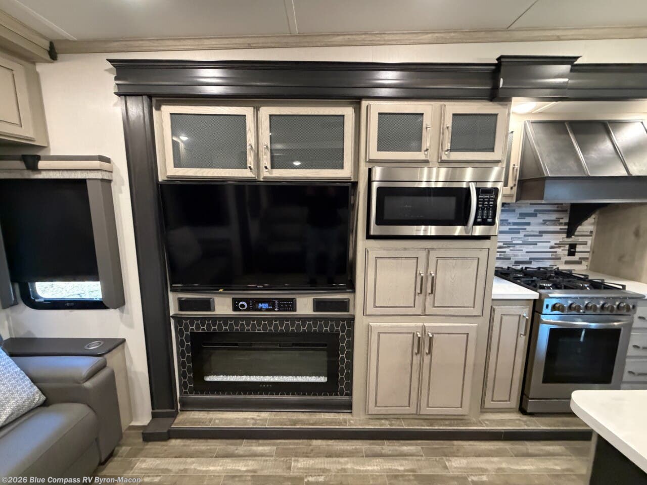 You will feel right at home camping in this fifth wheel! The chef will have lots of countertop space to prepare their best meals along with a kitchen island, a hutch to store your dishes, and a 18 cu. ft. gas/electric refrigerator to store any leftovers. The free standing dinette offers a comfortable place to enjoy your meals then play a card game or you can relax on the hide-a-bed sofa sleeper or the Thomas Payne theater seating equipped with heat, massage, LED lights, and a USB charging station across from the entertainment center with a 40" fireplace and a 50" TV. The dual entry bathroom has a shower with a seat and is easy for everyone to access especially those staying in the front private bedroom. The bedroom also has a king bed slide with storage underneath for extra blankets, a bench next to a chest, and a front master closet that is prepped to add an optional washer and dryer for clean clothes throughout your entire trip!