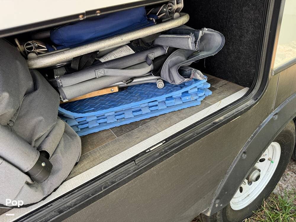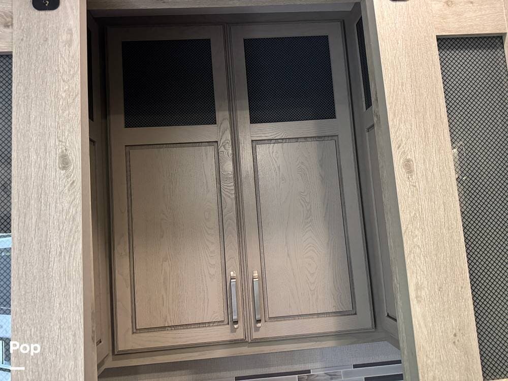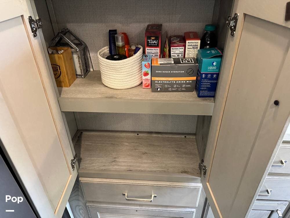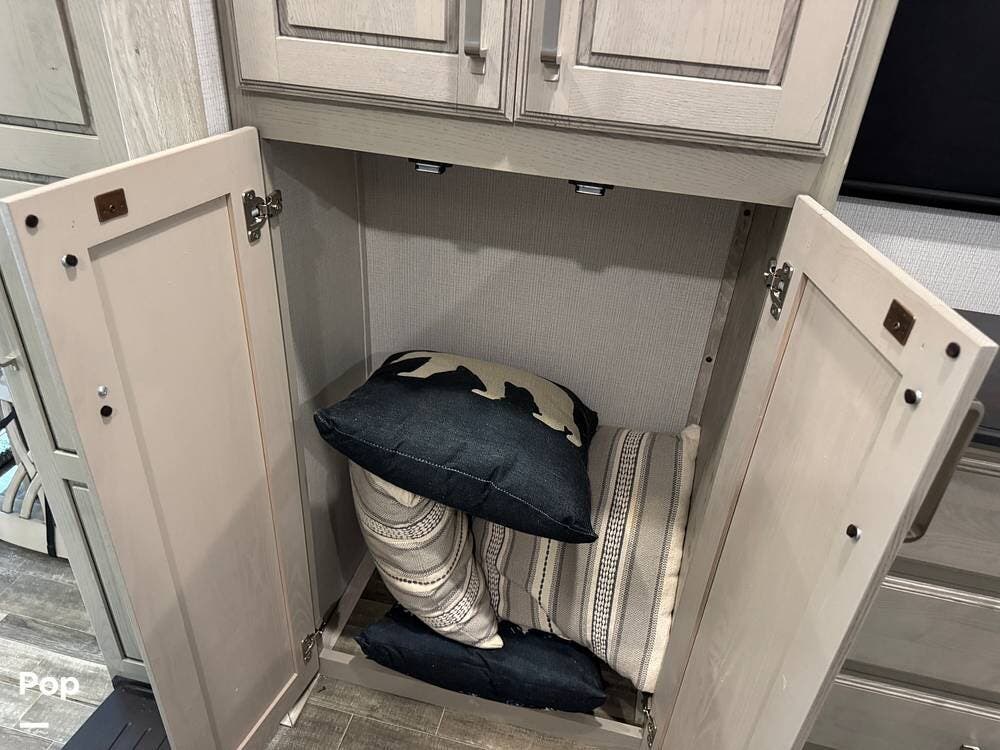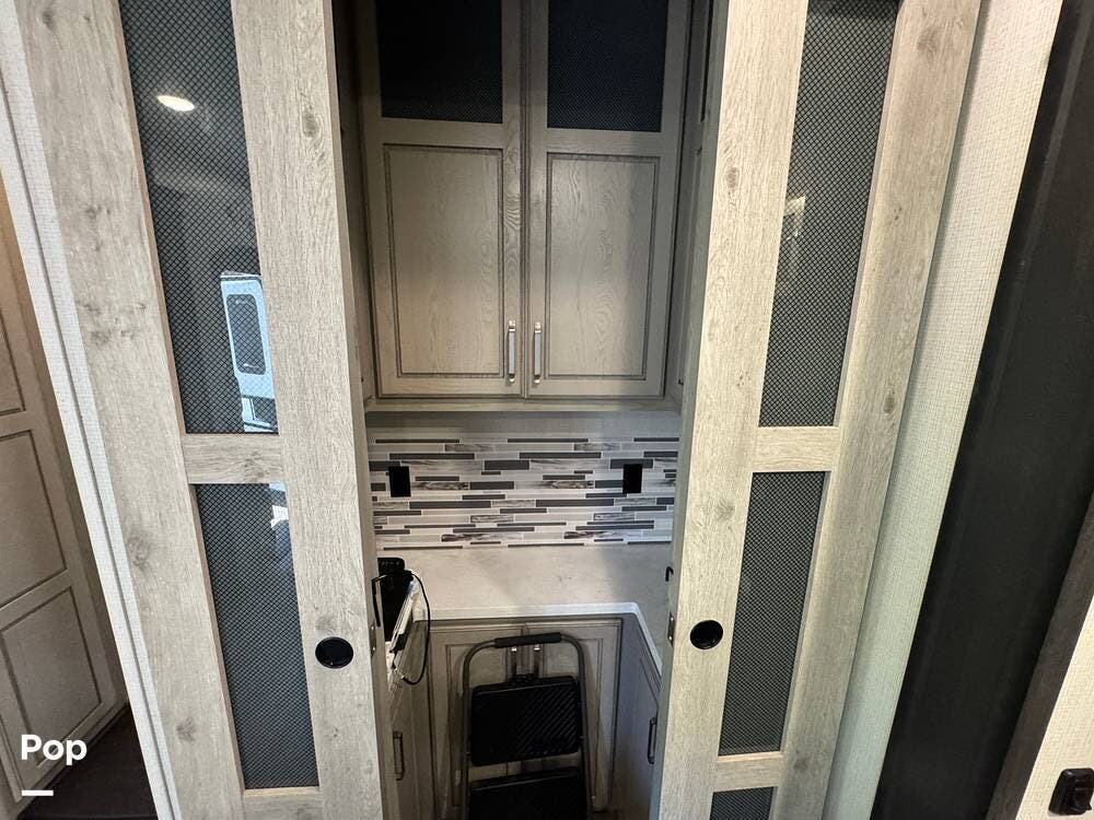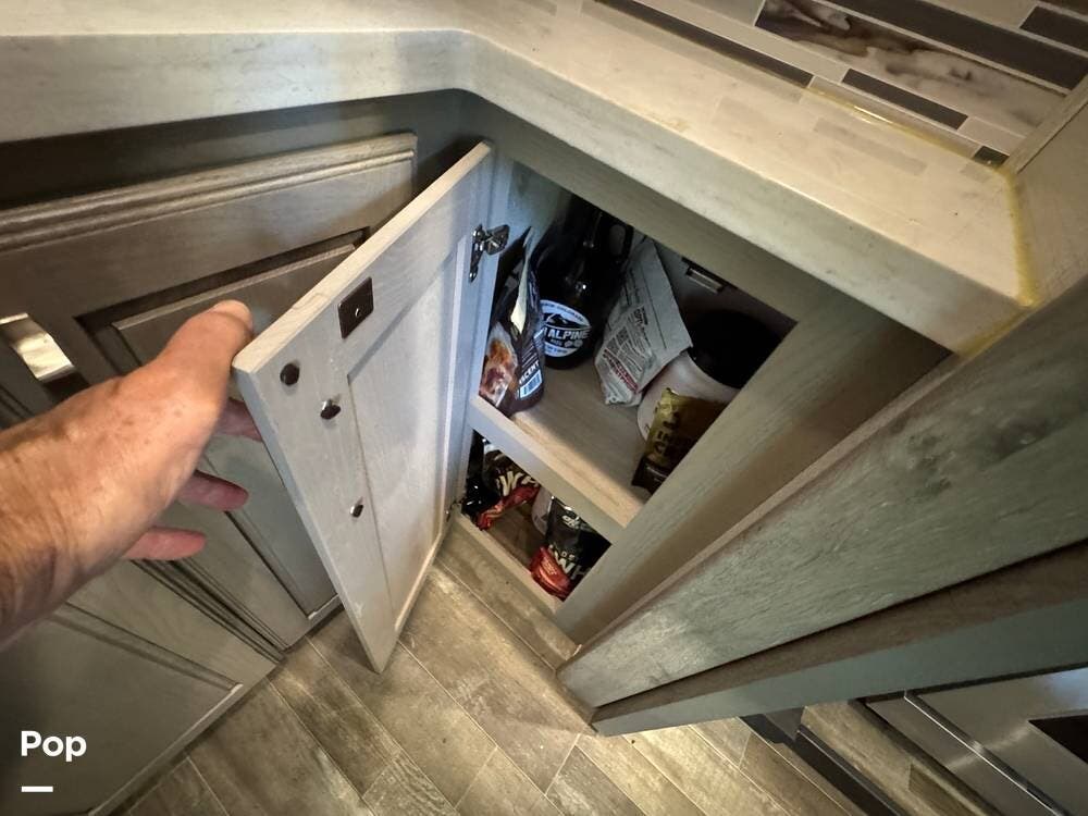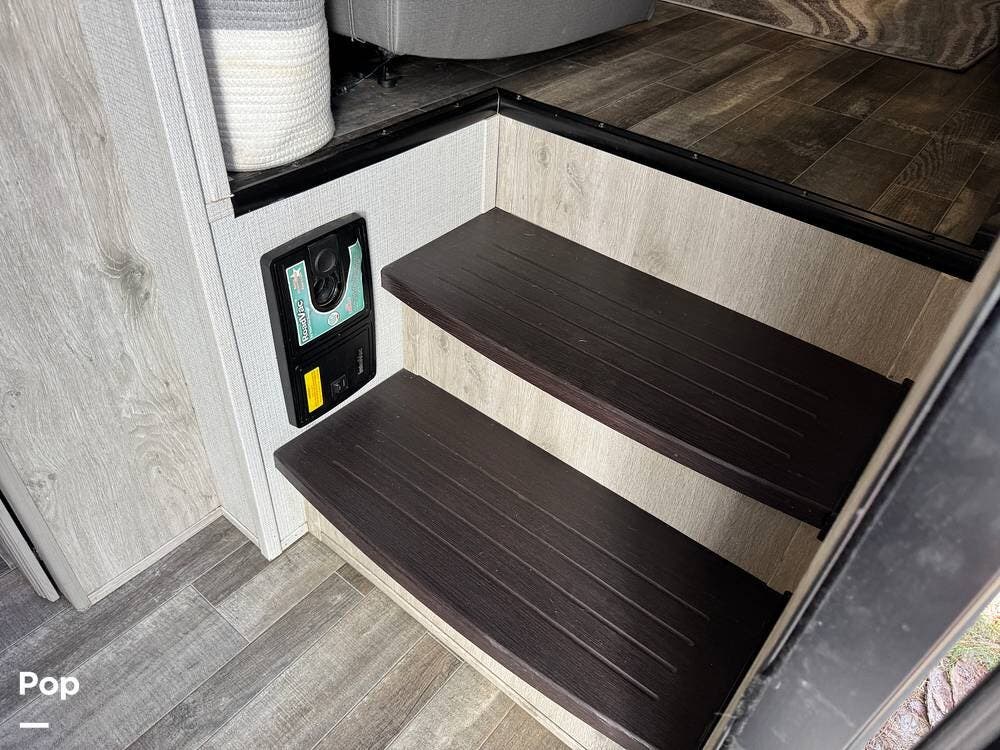 Other features of the camper include a 6-point hydraulic auto-leveling system, two large power awnings for outdoor shade, dual 30 lb propane tanks for extended camping, and a massive pass-through storage for all your gear.