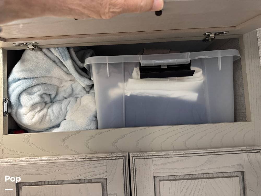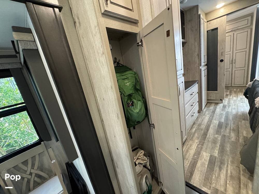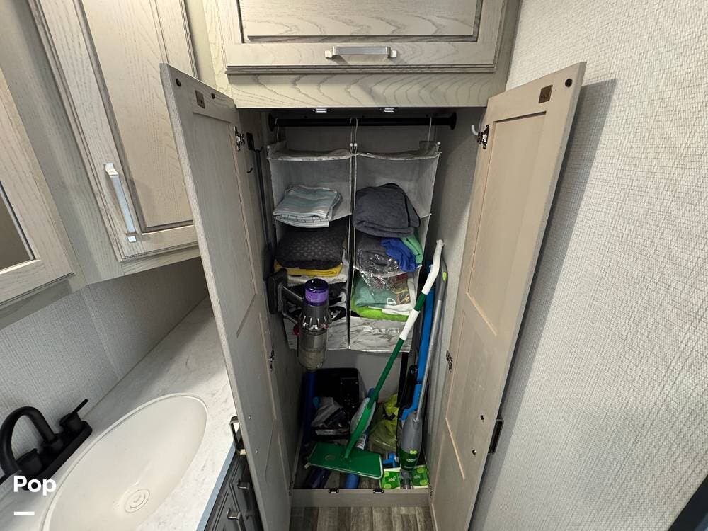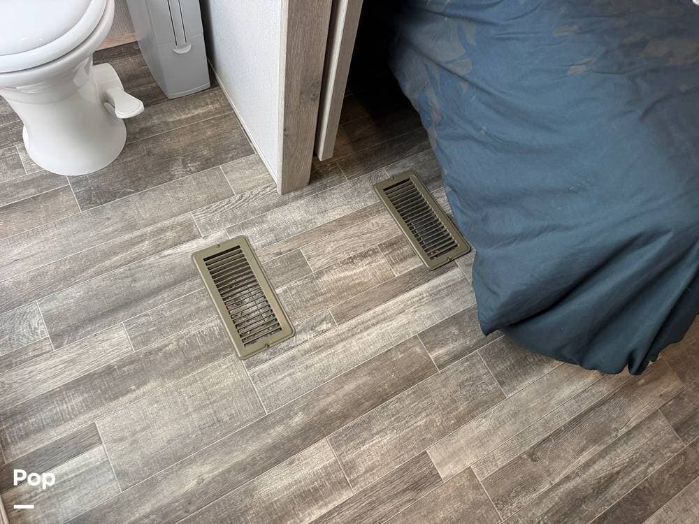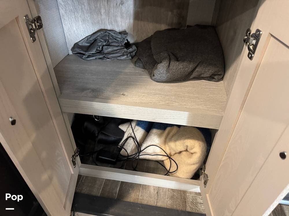The primary suite is huge and features a king-sized bed with storage underneath, a full-width wardrobe with washer & dryer hookups, a dedicated A/C unit for personalized climate control, lots of storage, and lots of space to move around!