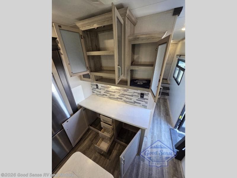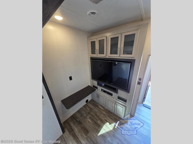 You won't believe all that this fifth wheel has to offer! From the front private bedroom with a king bed slide that has storage underneath across from a bench and chest, and a front master closet that is prepped to add an optional washer and dryer to the two power awnings and LCI Solid Step entry step. There is even a mid den room with a hide-a-bed sofa sleeper slide across from a feature wall with a TV/stereo, a storage locker next to a mirror, and a flip-up desk to get some work done while you're away. As you step up to the dual entry bathroom and front bedroom, you will notice a handy message center to your left on the wall. The kitchen has everything you will need to prepare your best home cooked meals including a convection microwave to pop a bag of popcorn for movie night. Speaking of movies, you can watch your favorite one on the 50" TV with sound system with a 40" fireplace below it while you relax on the Thomas Payne theater seating equipped with heat, massage, LED lights, and USB charging stations or on the hide-a-bed sofa sleeper!