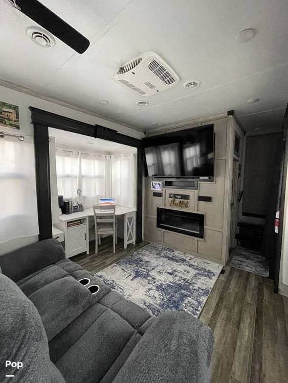 Mid living with entertainment center, fireplace and Stadium-Style Recliners. Nice desk area with large window for those still working remotely.