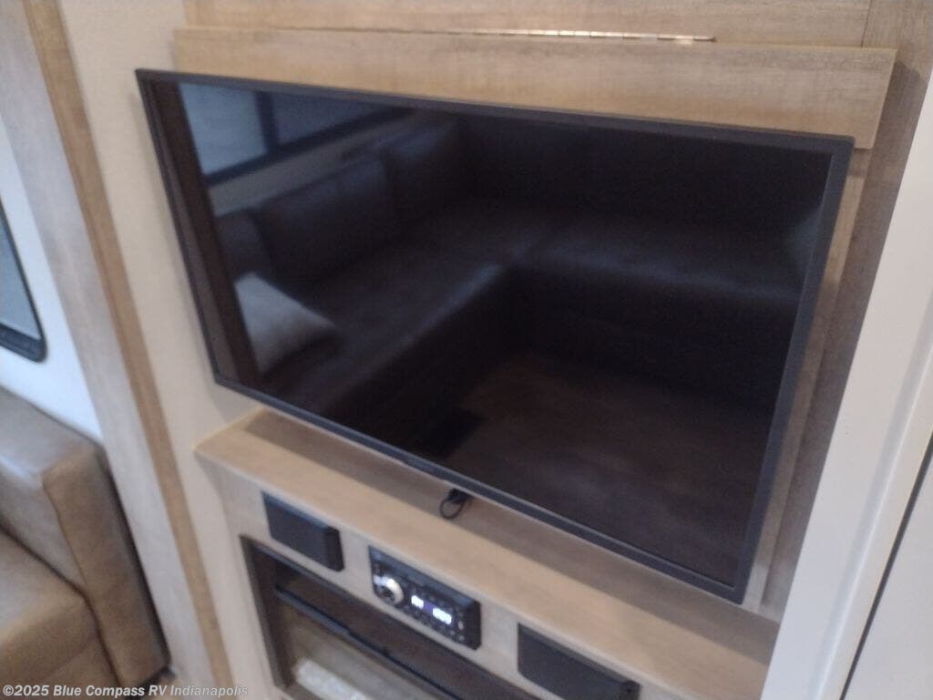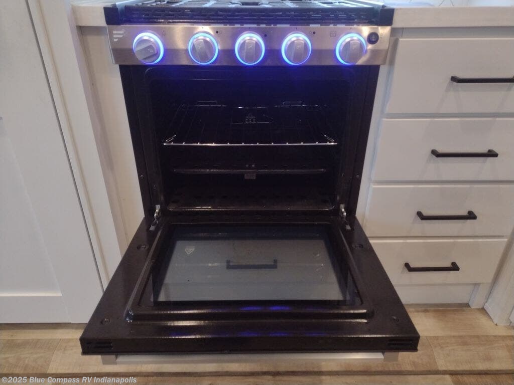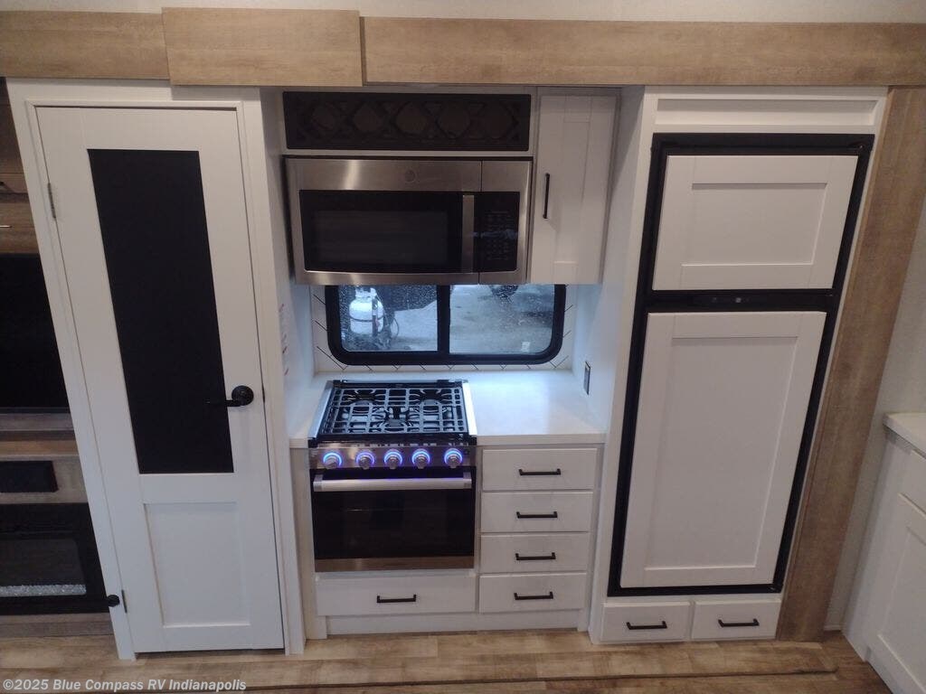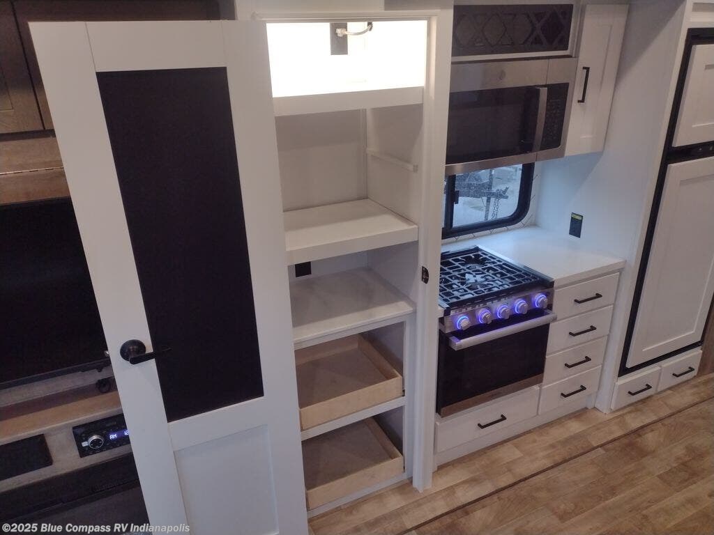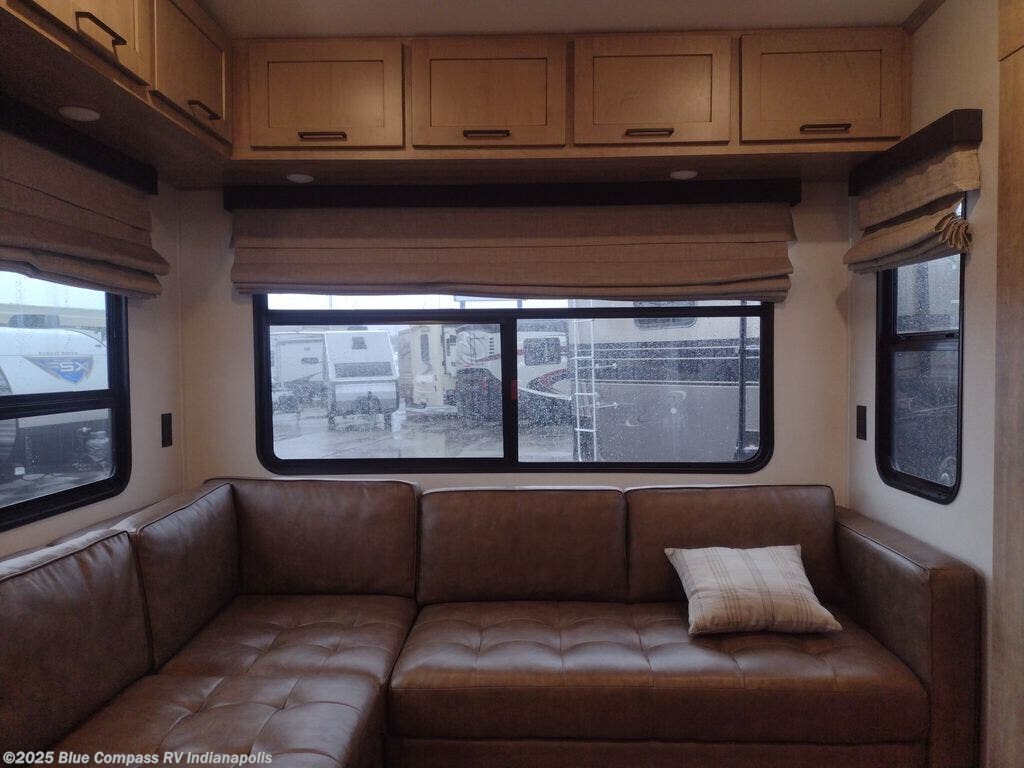 Head to your local state park for fun camping trips in this cozy fifth wheel. Your crew will love relaxing in the rear living area on the sectional sofa with a fireplace and 40" TV nearby. There is a dinette table with bench seating on one side and two chairs on the other if anyone wants to play a board game, or everyone may want to head outdoors to sit under the 17' power awning with LED lights. The kitchen includes everything you need to prepare meals each day, including a residential style range with a 21" oven, a 30" over-the-range residential microwave, plus a large pantry for snacks galore. The front private bedroom includes a queen bed just like at home, and you'll appreciate the two wardrobes, plus under-bed storage for all your items.