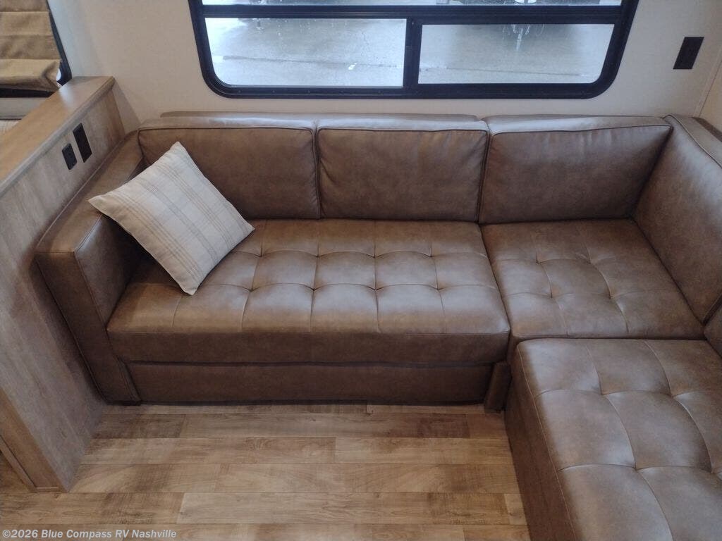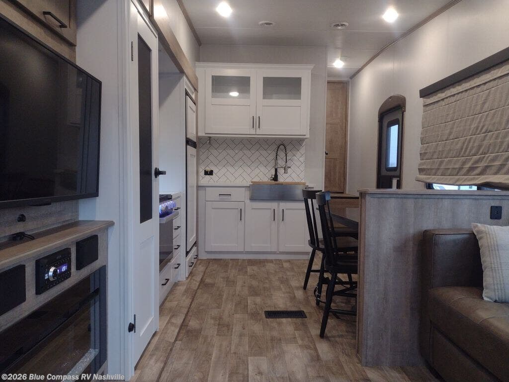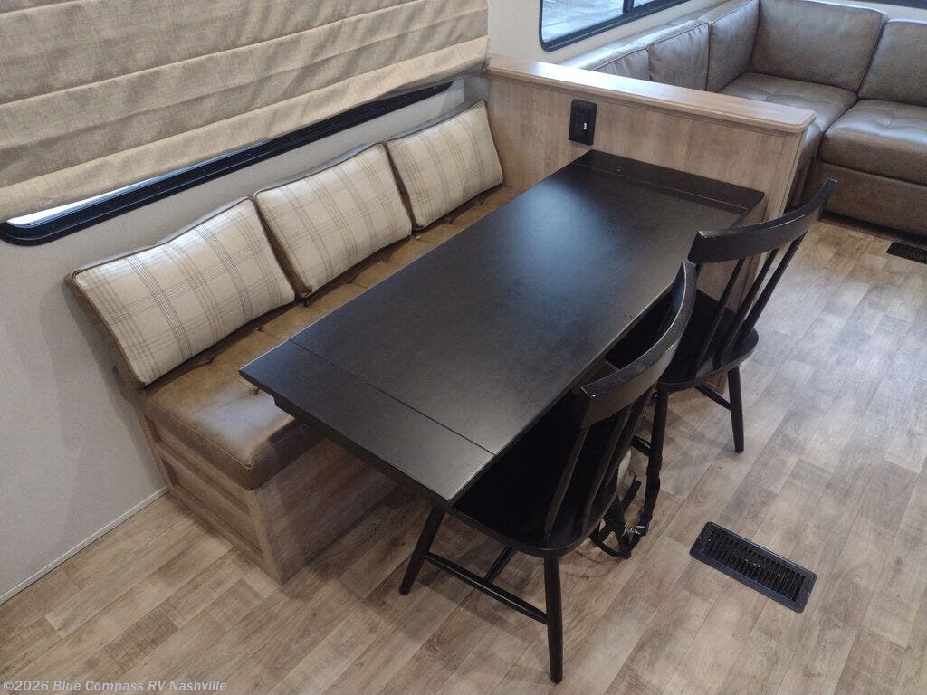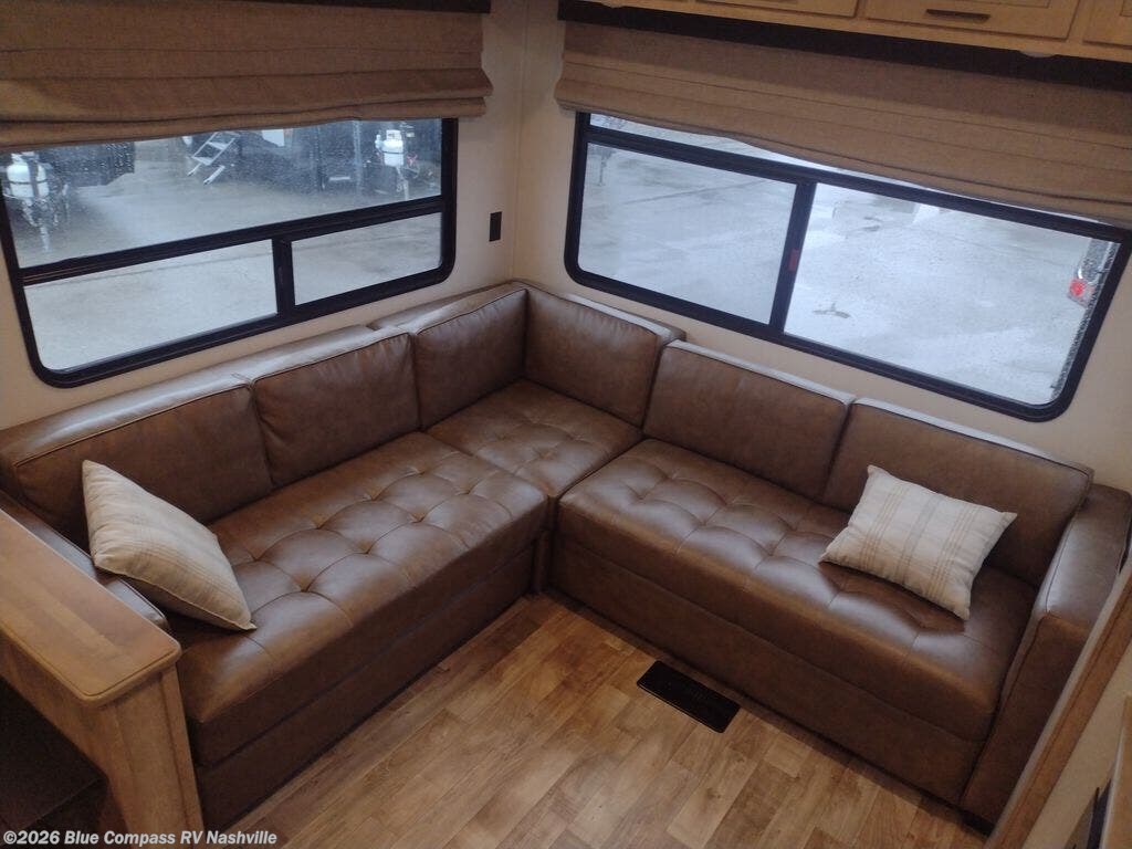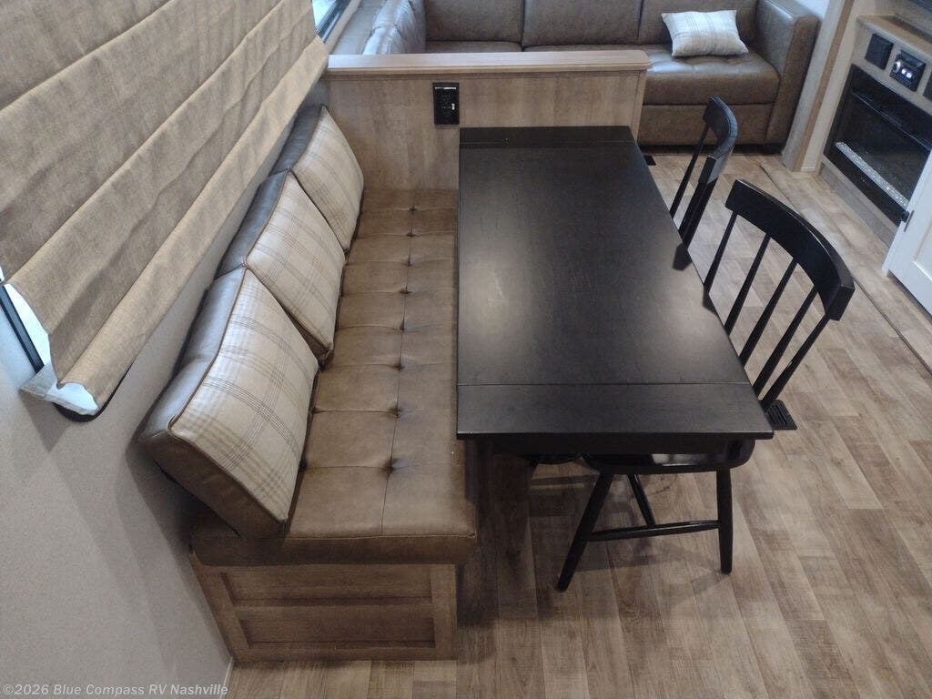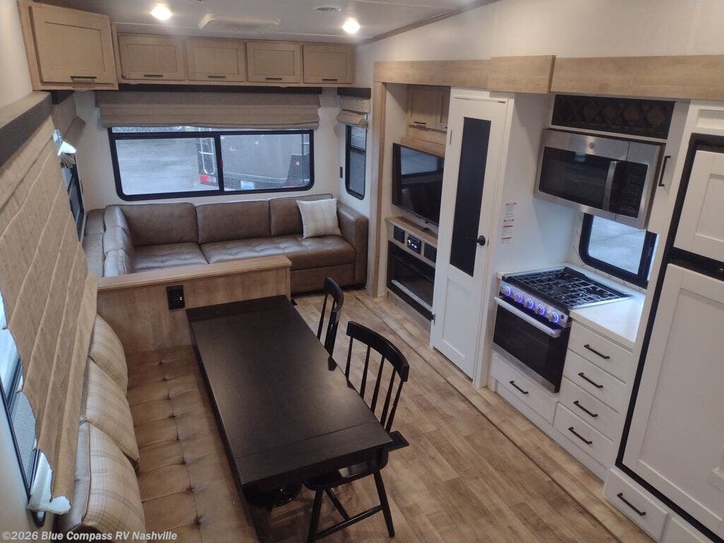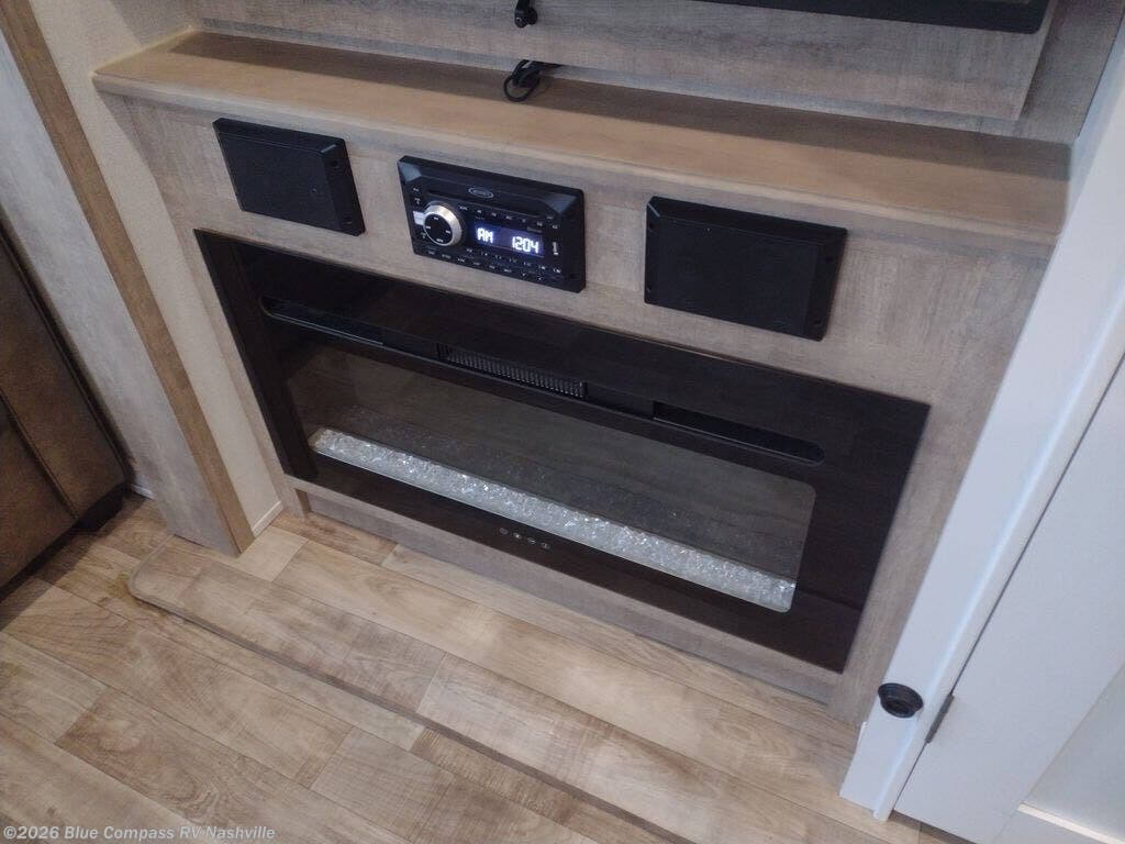 Head to your local state park for fun camping trips in this cozy fifth wheel. Your crew will love relaxing in the rear living area on the sectional sofa with a fireplace and 40" TV nearby. There is a dinette table with bench seating on one side and two chairs on the other if anyone wants to play a board game, or everyone may want to head outdoors to sit under the 17' power awning with LED lights. The kitchen includes everything you need to prepare meals each day, including a residential style range with a 21" oven, a 30" over-the-range residential microwave, plus a large pantry for snacks galore. The front private bedroom includes a queen bed just like at home, and you'll appreciate the two wardrobes, plus under-bed storage for all your items.