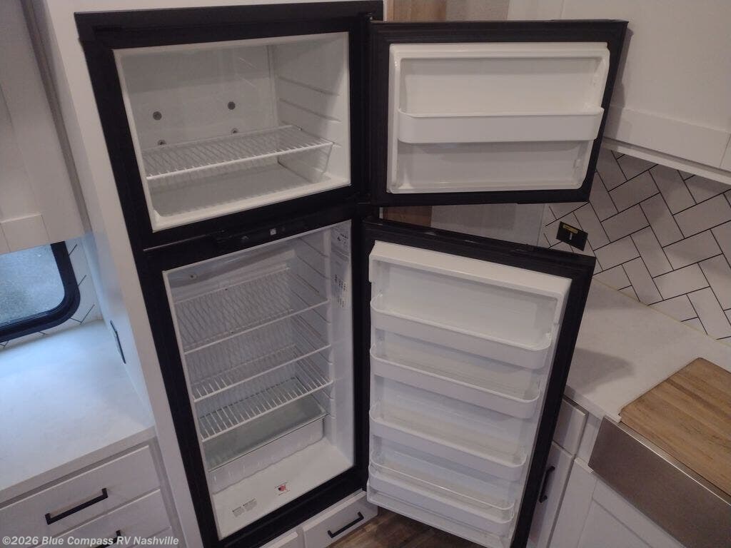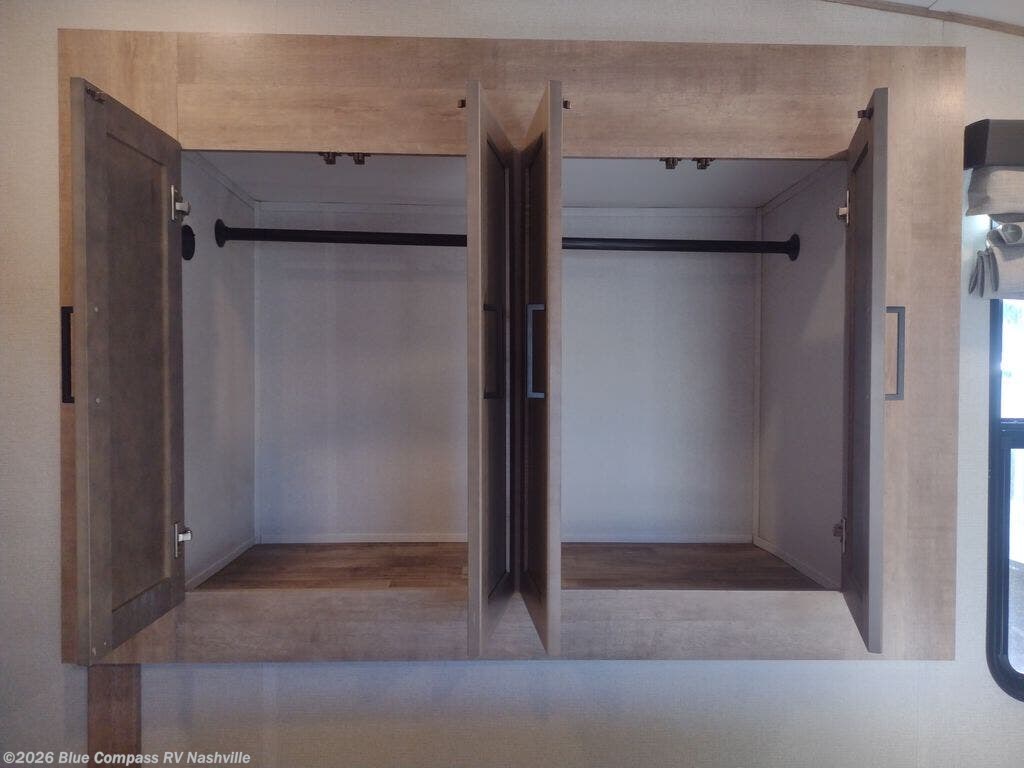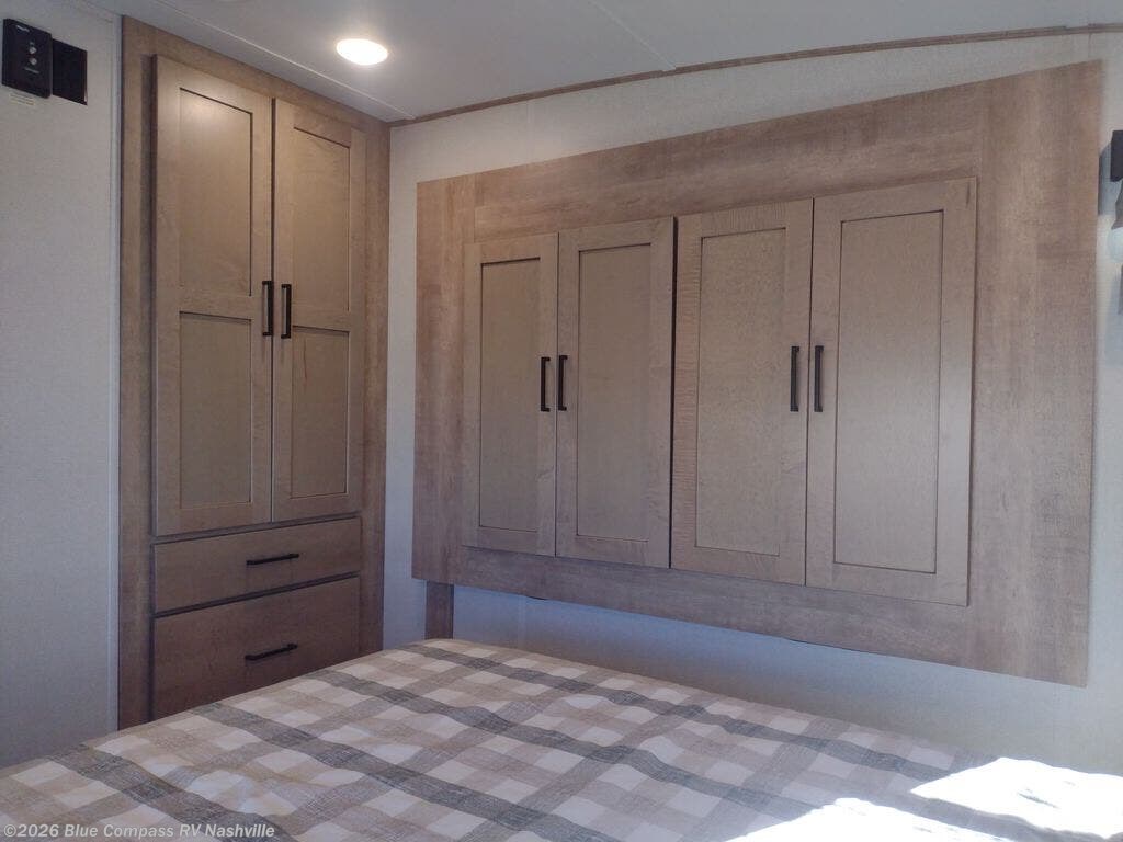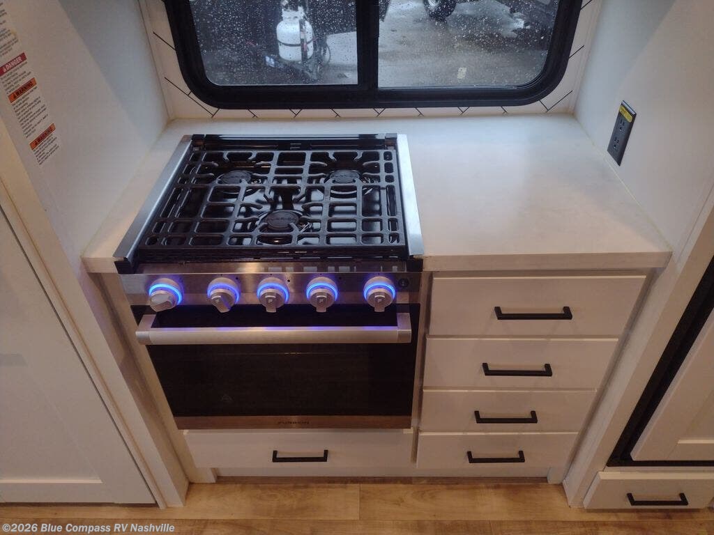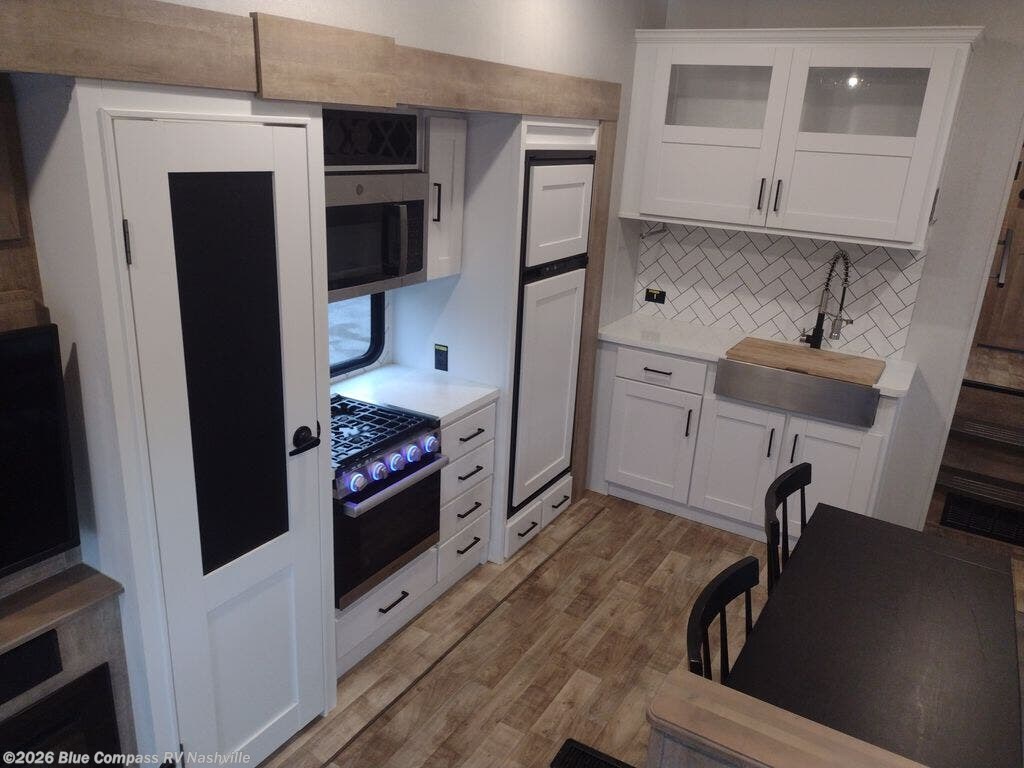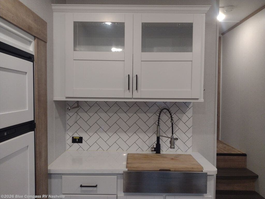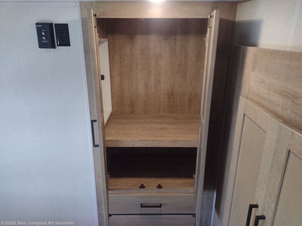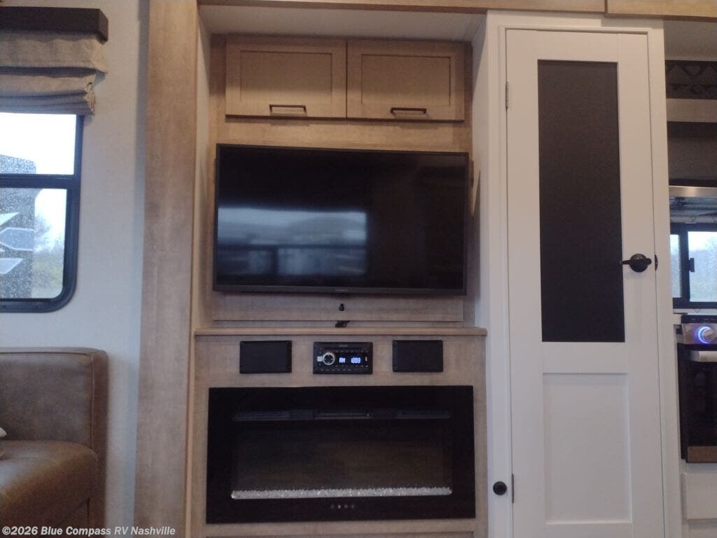 Head to your local state park for fun camping trips in this cozy fifth wheel. Your crew will love relaxing in the rear living area on the sectional sofa with a fireplace and 40" TV nearby. There is a dinette table with bench seating on one side and two chairs on the other if anyone wants to play a board game, or everyone may want to head outdoors to sit under the 17' power awning with LED lights. The kitchen includes everything you need to prepare meals each day, including a residential style range with a 21" oven, a 30" over-the-range residential microwave, plus a large pantry for snacks galore. The front private bedroom includes a queen bed just like at home, and you'll appreciate the two wardrobes, plus under-bed storage for all your items.