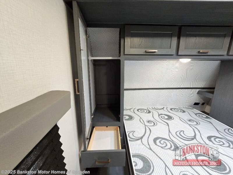 The double-size bunks with a flip-up bunk for added storage below, are sure to be a hit with the kids, your guests and your storage needs. There is a full bathroom for convenience, and a slide out with a U-shaped slide and an 8 cu. ft. refrigerator for more interior space. The single basin stainless steel sink, the Furrion appliances and the L-shaped counter are at the cook's fingertips, yet they may want to use the outside kitchen as often. When you are ready to retire for the evening, open up the sliding door and quickly fall asleep on your own walk-around queen bed.