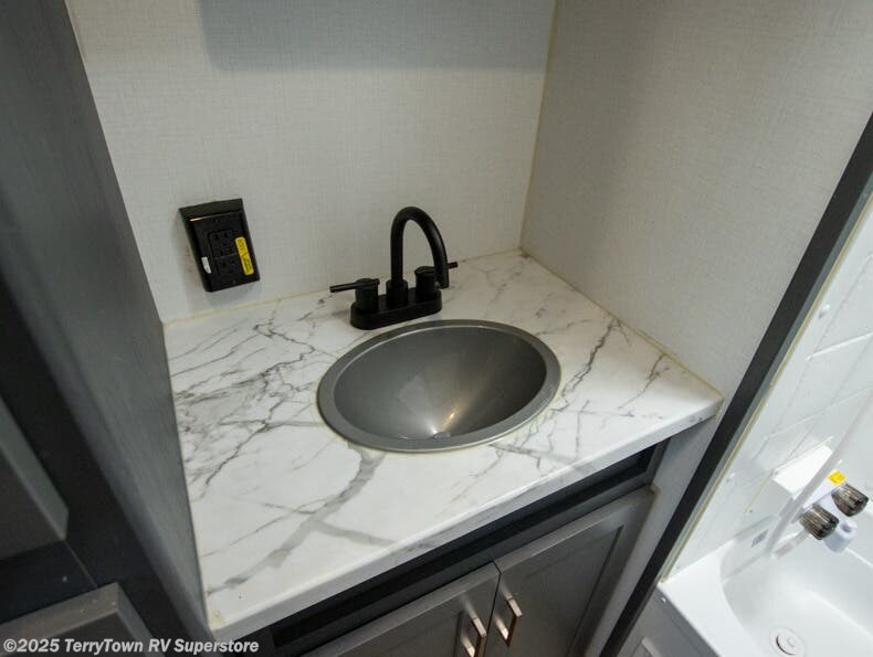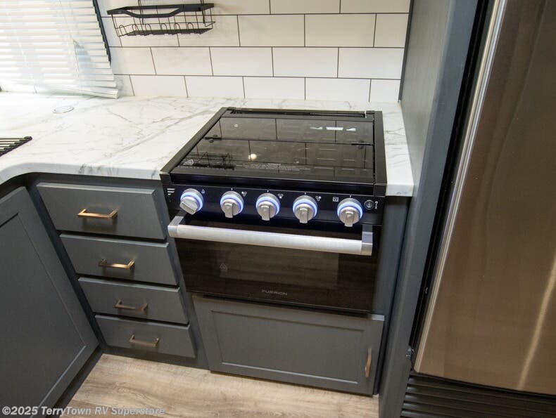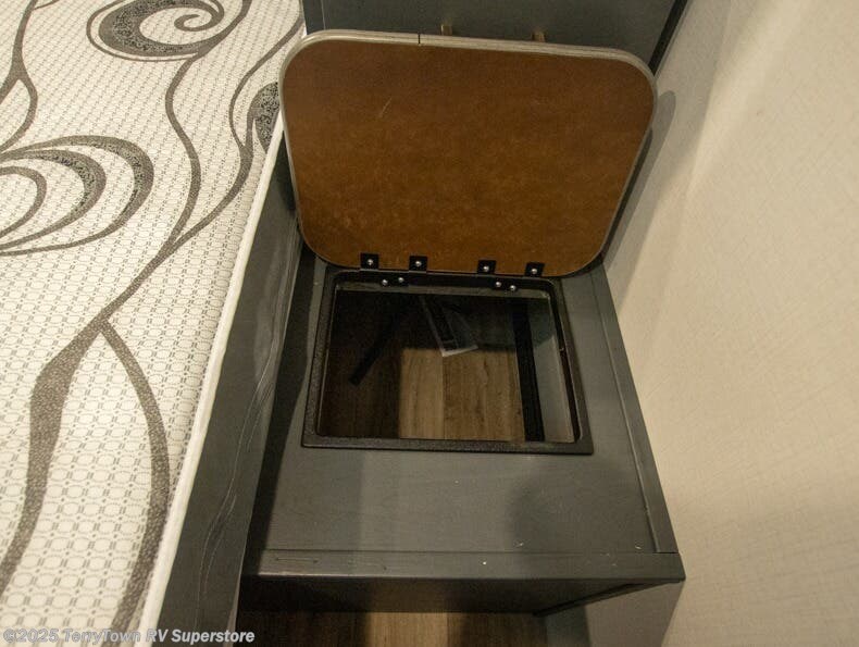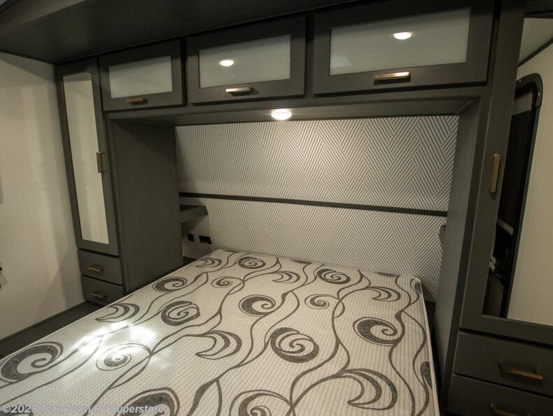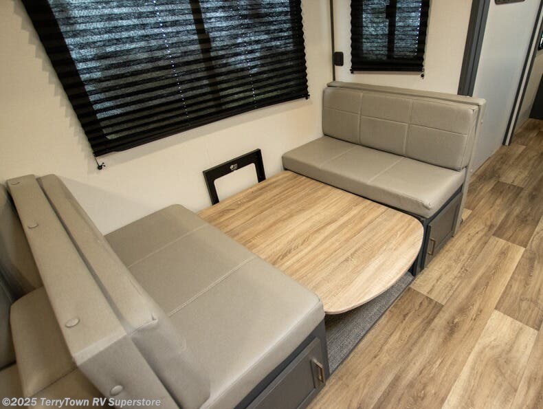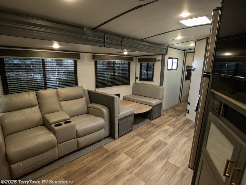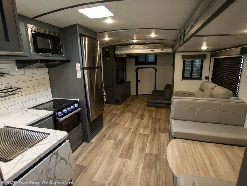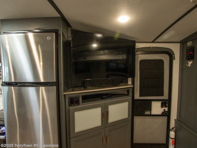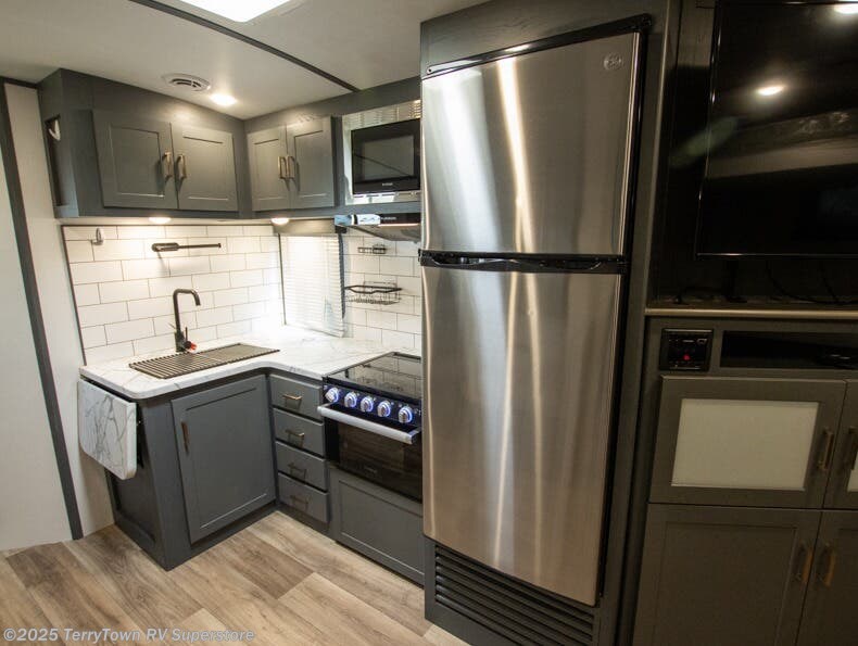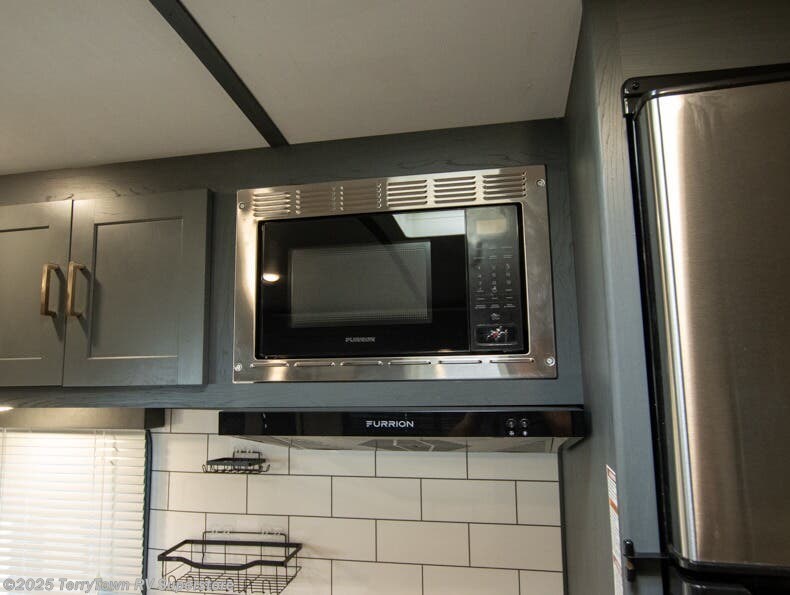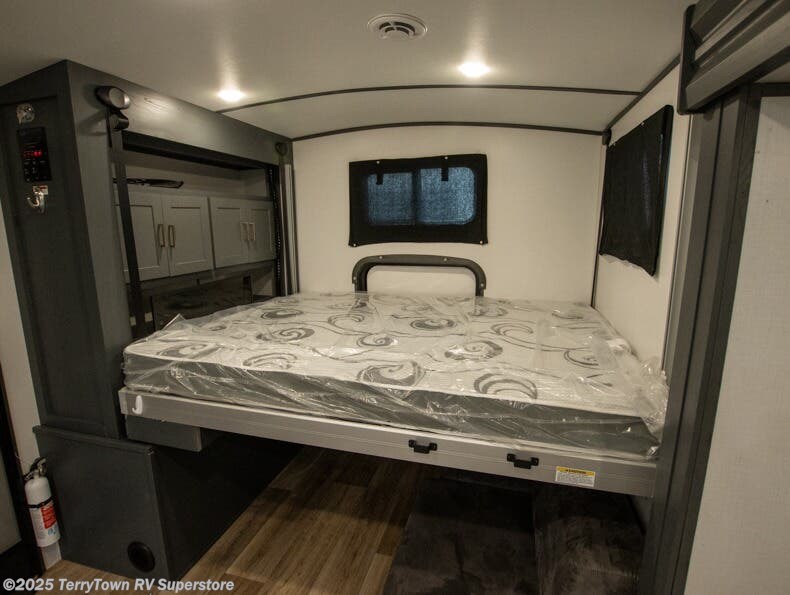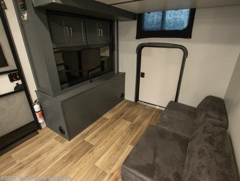 Get ready for family fun in this trailer that offers a queen bed bunk lift in the rear with a kids lounge area below which includes flip chairs. You will also appreciate being able to load items inside such as bikes or kayaks for secure travels through the exterior rear door. The slide out offers more floor space plus a tri-fold sofa and a dream dinette with easily accessible storage doors under the bench seating, and both of these furnishings provide extra sleeping space. The well-equipped kitchen offers a single basin stainless steel sink with stainless steel high rise faucet and Furrion appliances to make hot meals. And the cook will enjoy using the outdoor kitchen to make a few meals. The full front bedroom offers a queen bed with dual wardrobes, a laundry chute and the second entry/exit door.