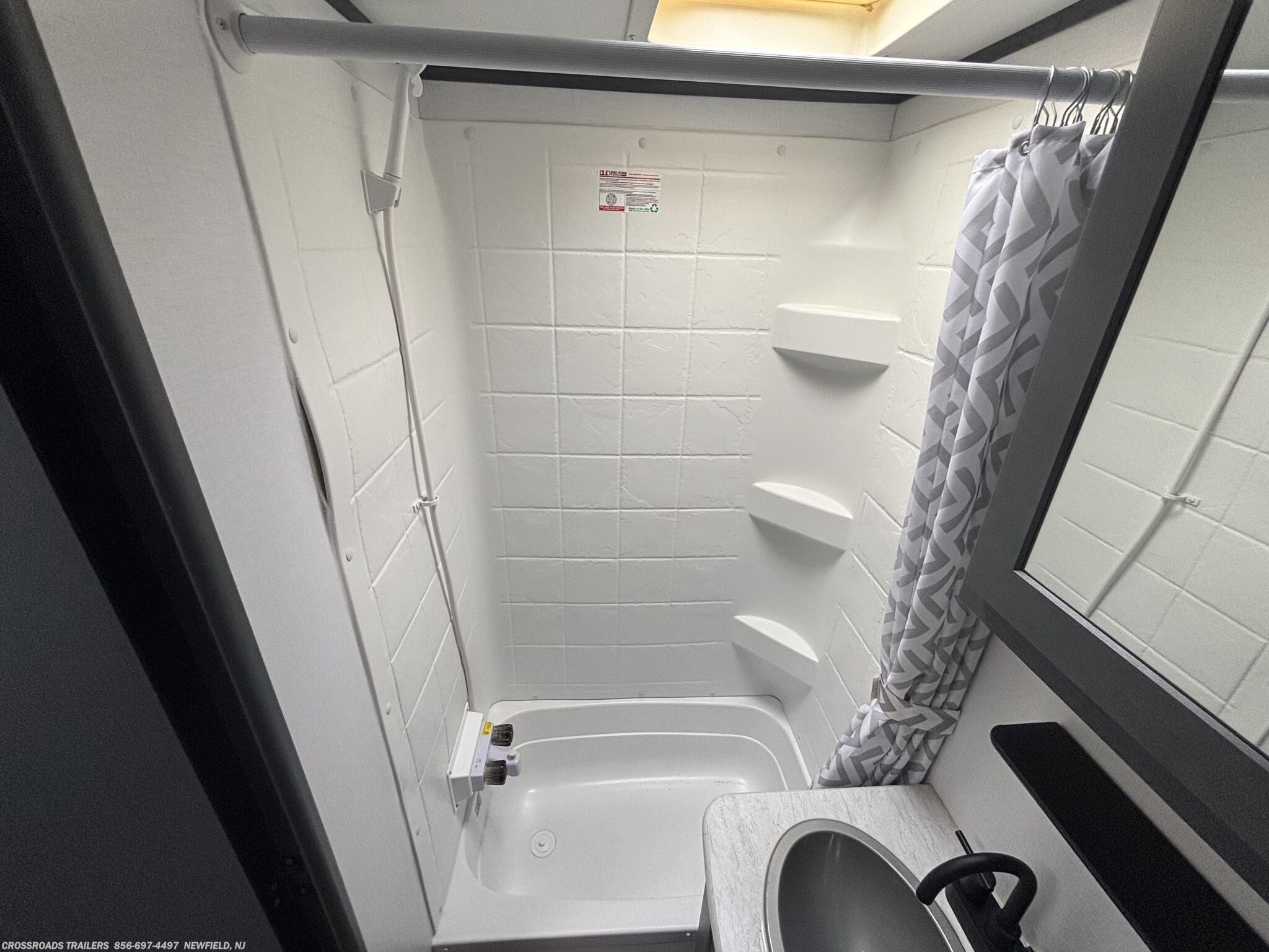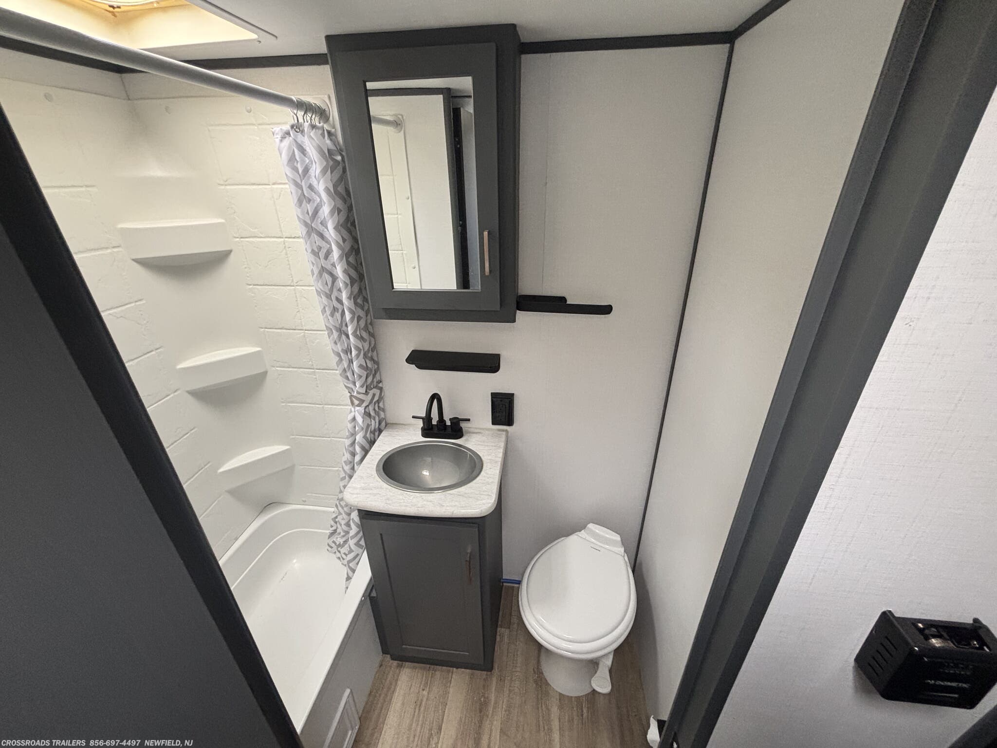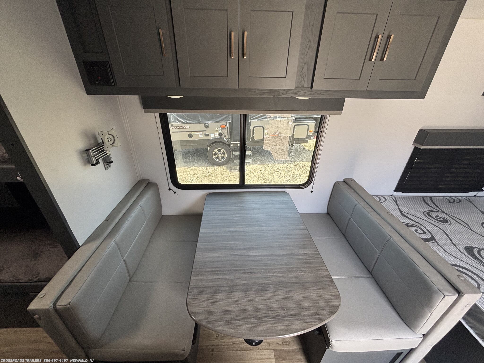 This travel trailer blends practical RV living with family-friendly amenities. The bunk beds and a dedicated queen bed provide flexible sleeping arrangements, while a booth dinette offers a convenient dining area that can convert for additional sleeping space. The interior is designed for everyday living on the road, with essential kitchen and bathroom features to keep your crew comfortable during extended trips.