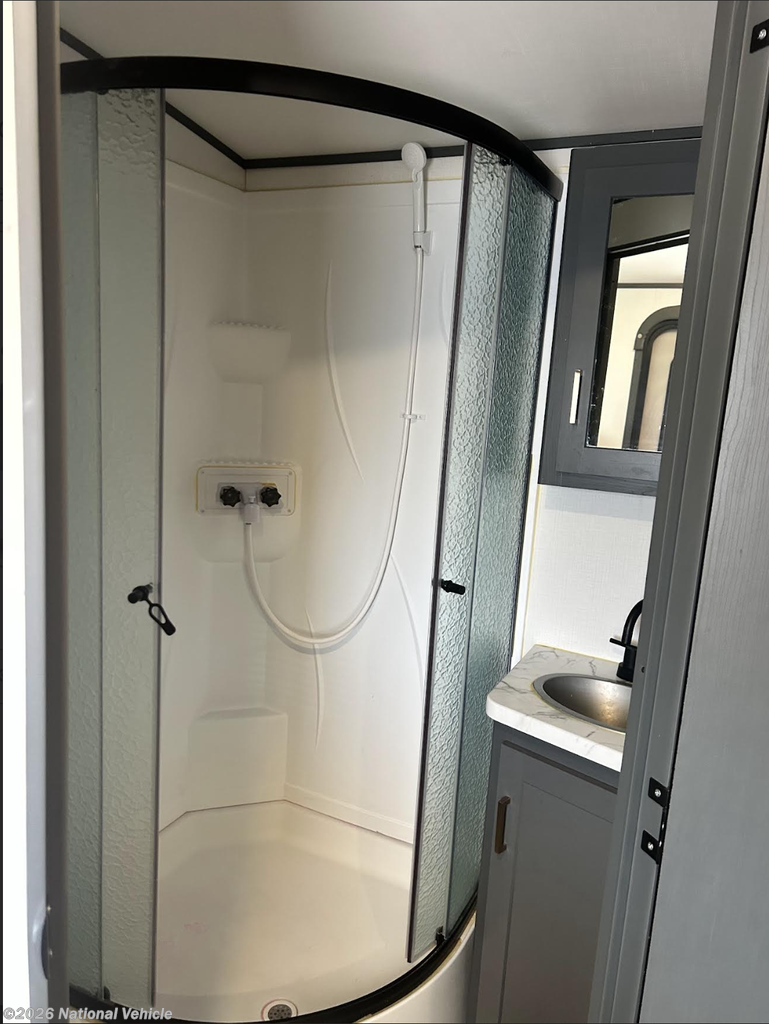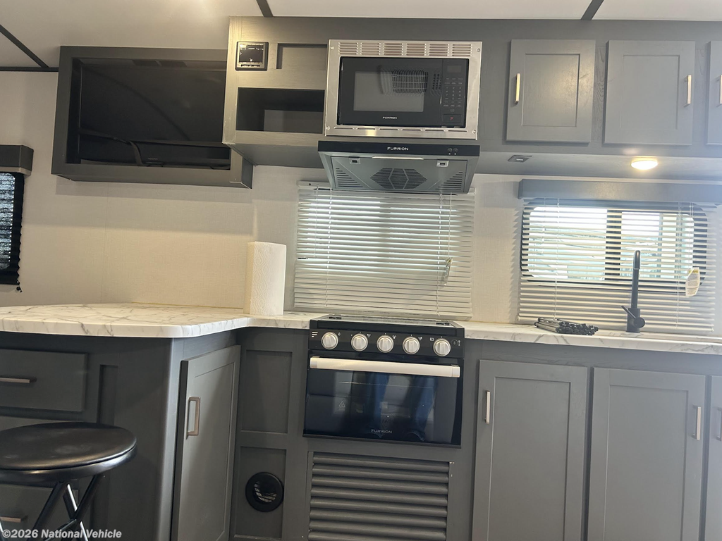 The kitchen is fully equipped with solid-surface countertops, a 3-burner cooktop, microwave, and an 8 cu. ft. refrigerator, making meal prep on the road simple and convenient. Thoughtful touches like abundant storage, modern cabinetry, and a bright, open living area create a comfortable, home-like feel wherever you travel.