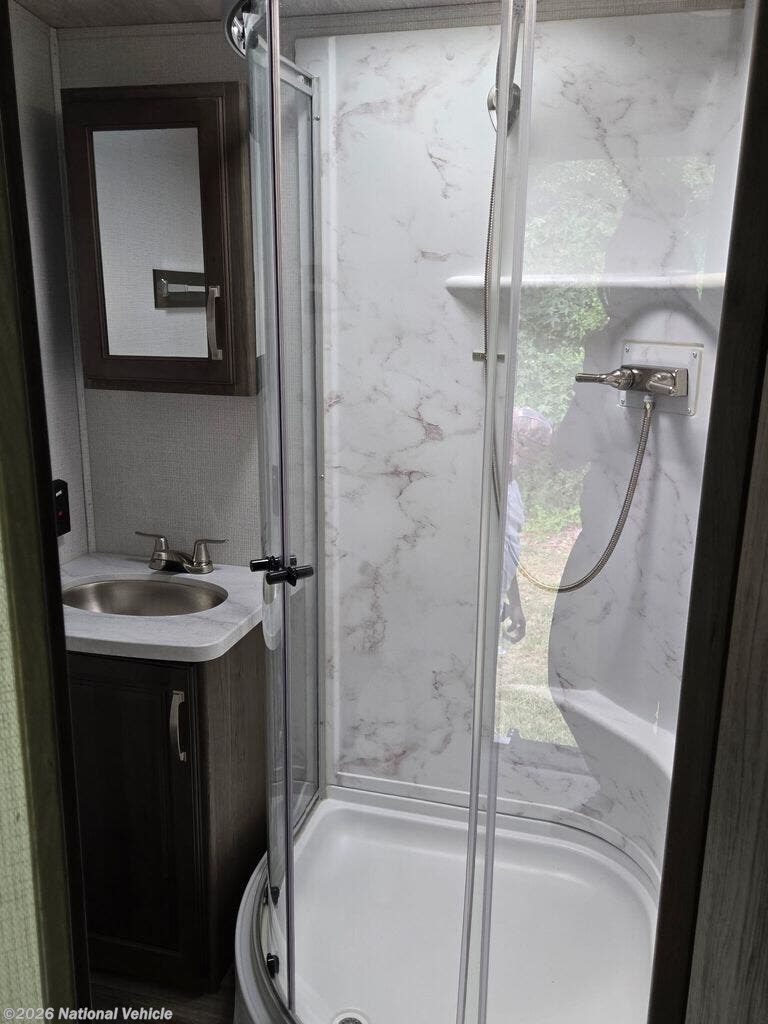 Inside, you?ll find a thoughtfully designed rear bath floorplan that maximizes space and livability. The spacious full bathroom spans the width of the coach, offering a large shower, vanity, and linen storage?bringing a true at-home feel to your travels. Up front, the private bedroom features a comfortable king-size bed with under-bed storage and convenient USB charging, creating a relaxing retreat after a day of adventure.