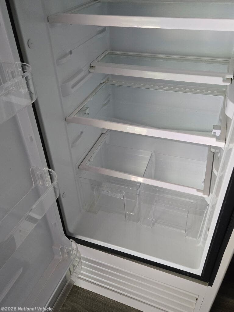 The central living area is both inviting and functional, featuring theater seating, a booth dinette, and an entertainment center?perfect for relaxing or hosting guests. The well-appointed kitchen includes seamless countertops, a stainless steel sink, three-burner cooktop, microwave, and a mid-size refrigerator, giving you everything needed to cook and dine comfortably on the road.