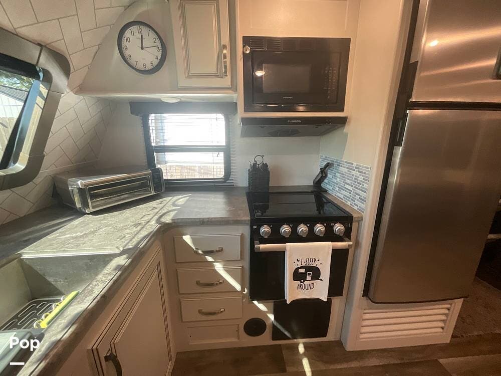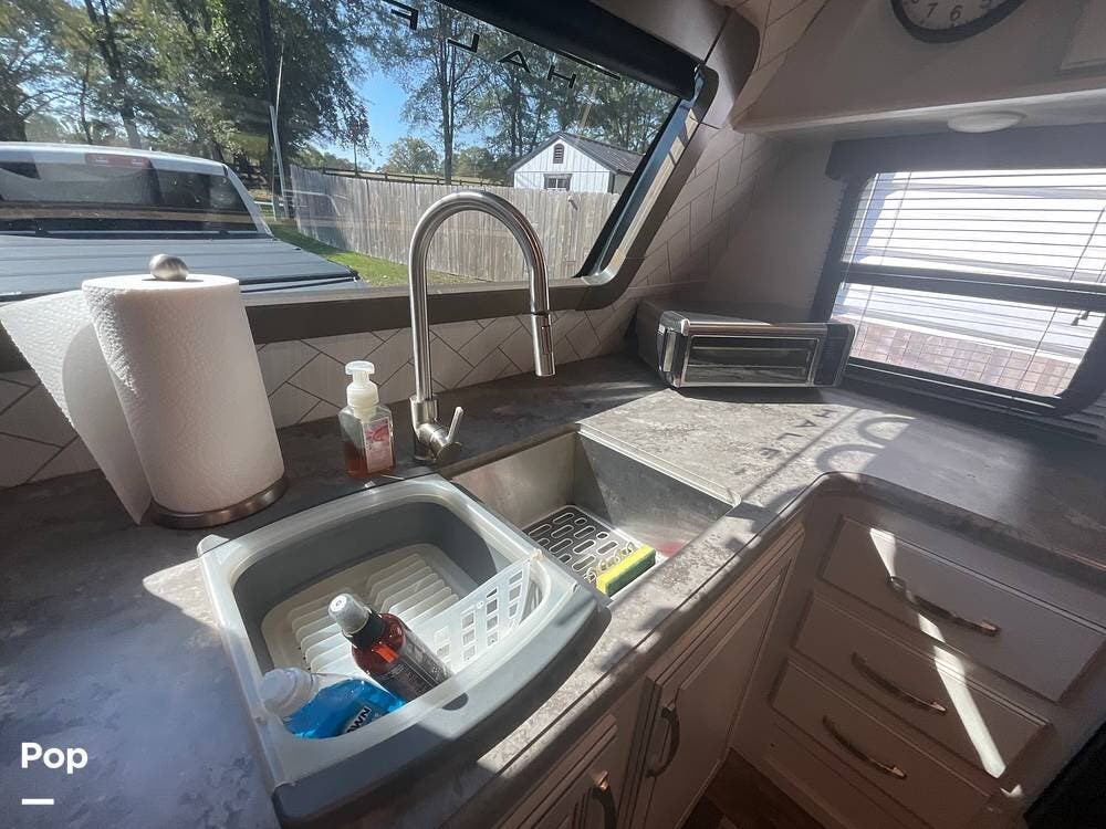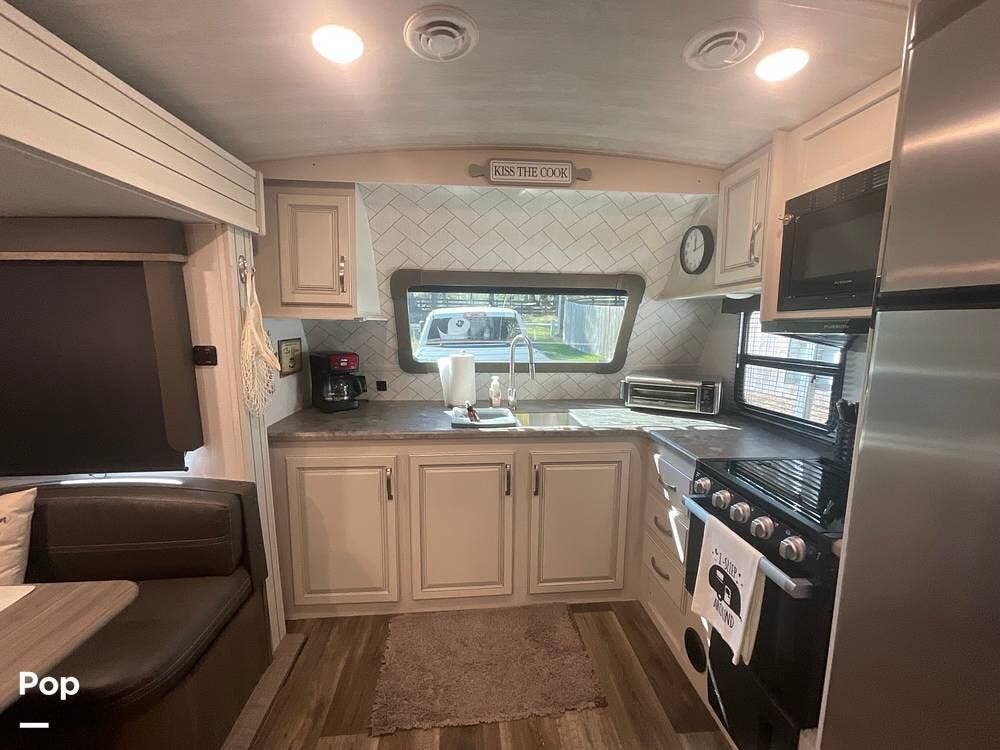 The floor plan feels spacious, and you'll really enjoy the views from the front kitchen windows. There are two entrances, and the bathroom is accessible from the Master Bedroom or the front of the camper.