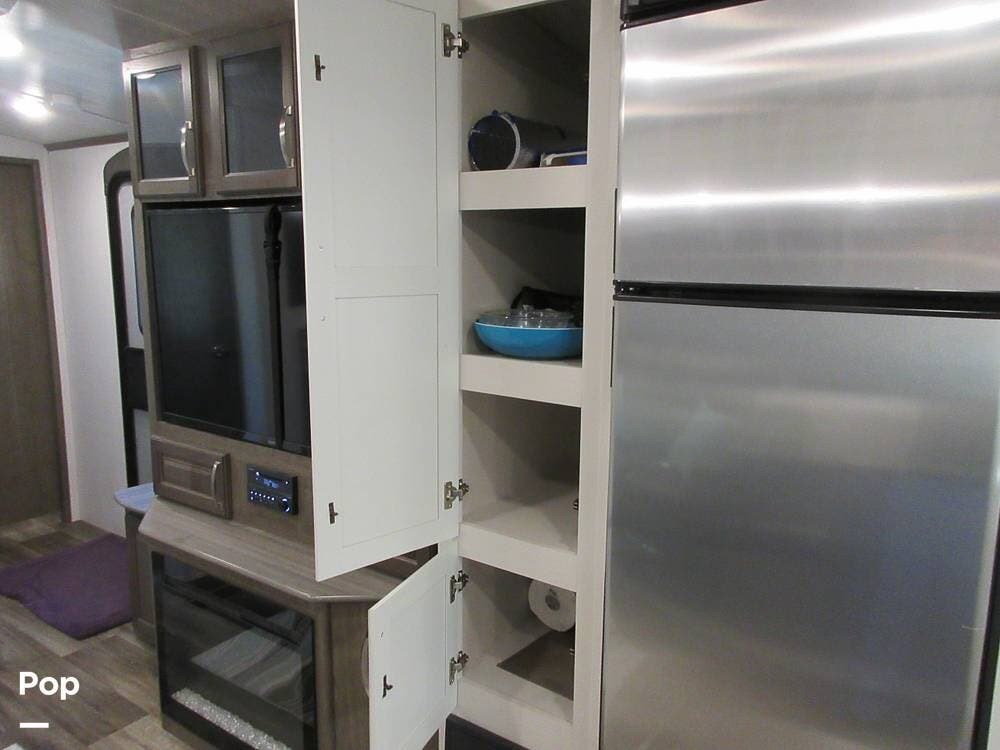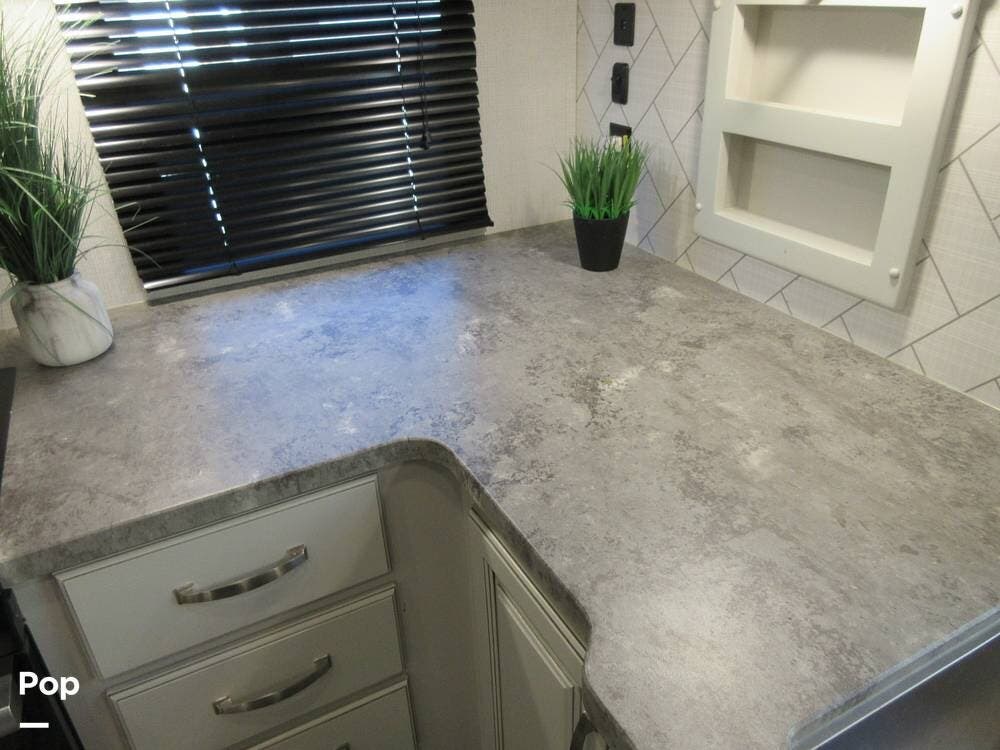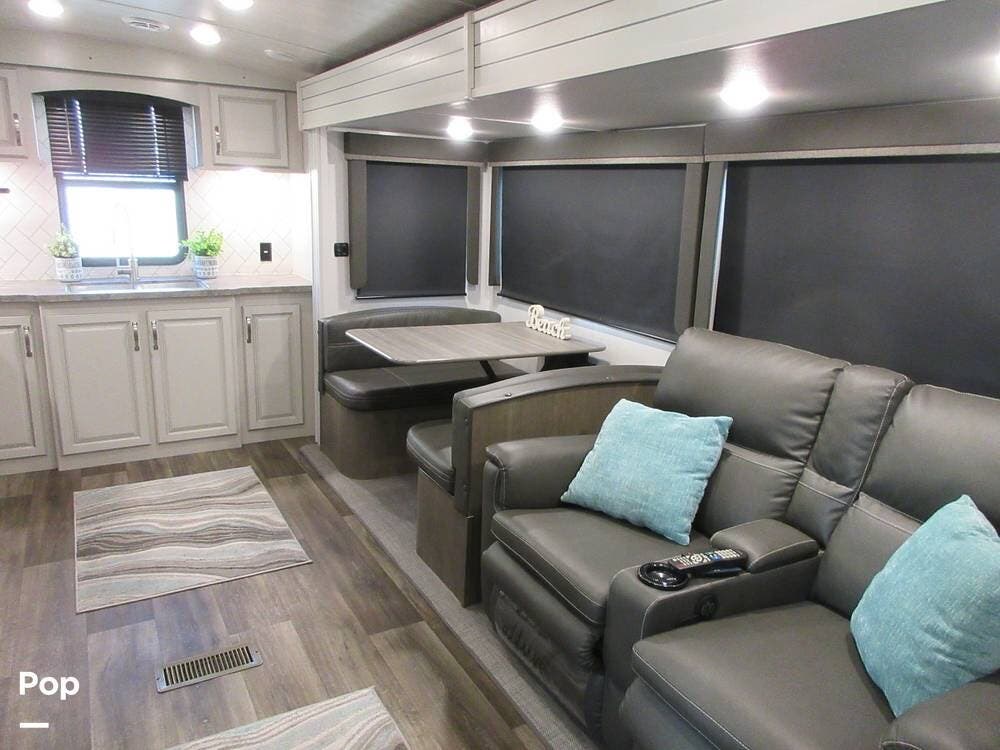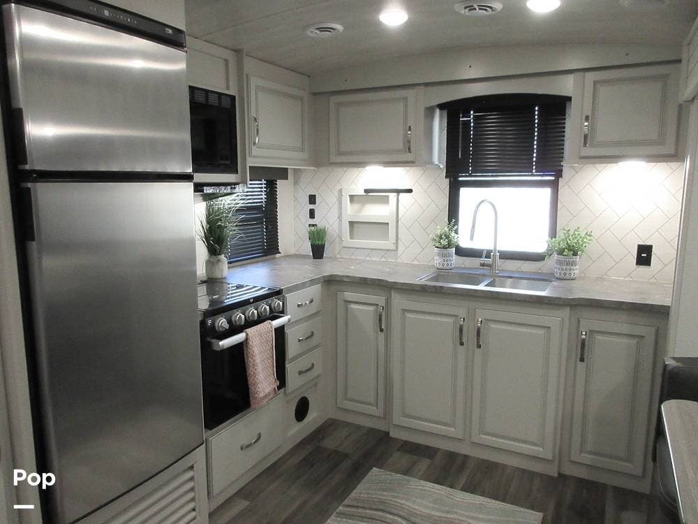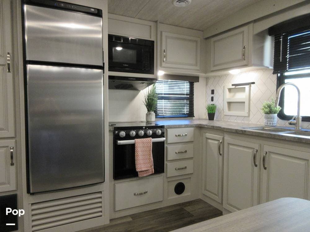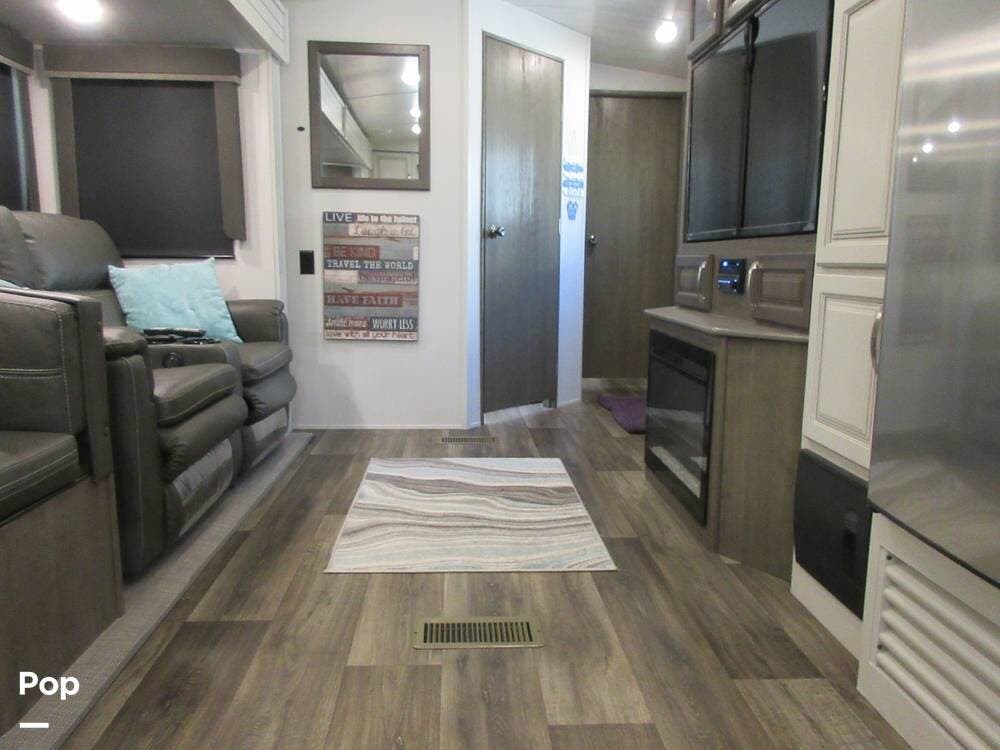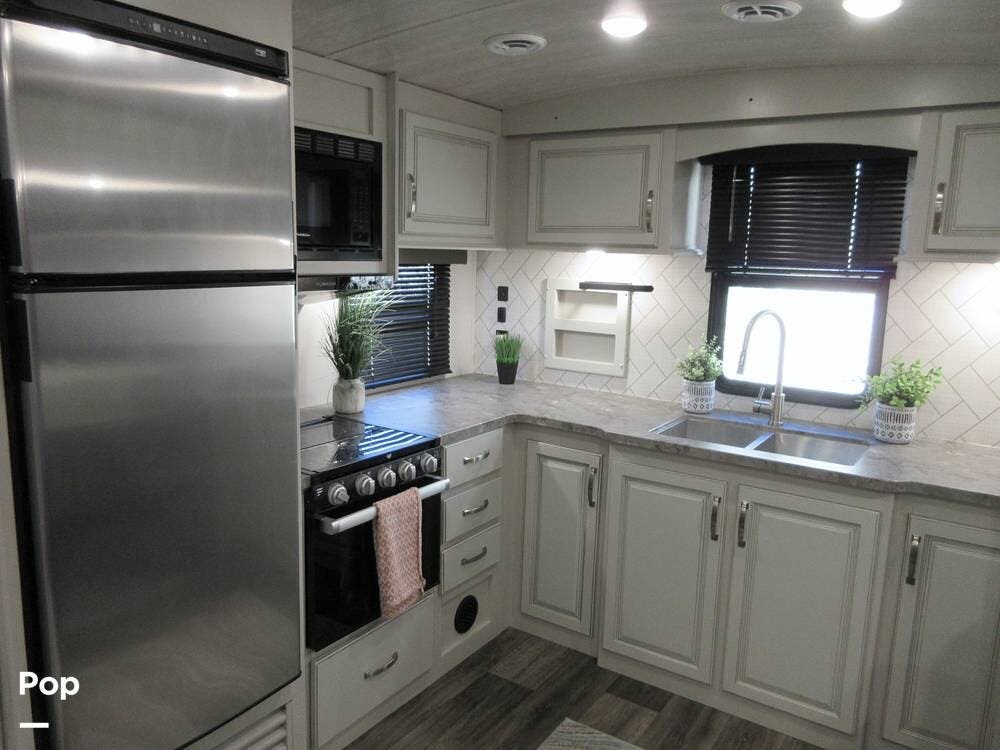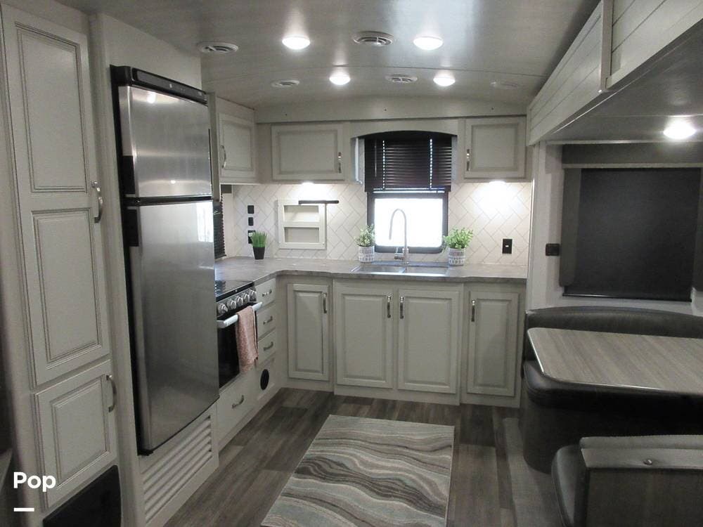 Designed with two large slide-outs, this RV feels extra spacious for a trailer of this size. The rear wraparound kitchen allows plenty of walking space for the living area and entertainment center.