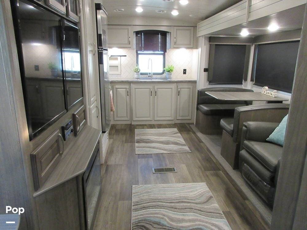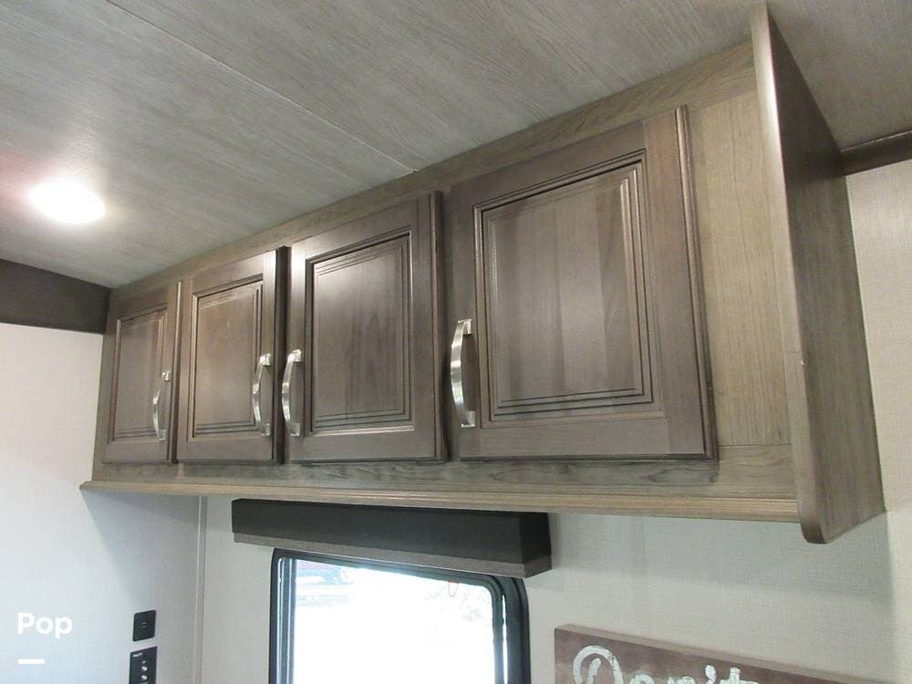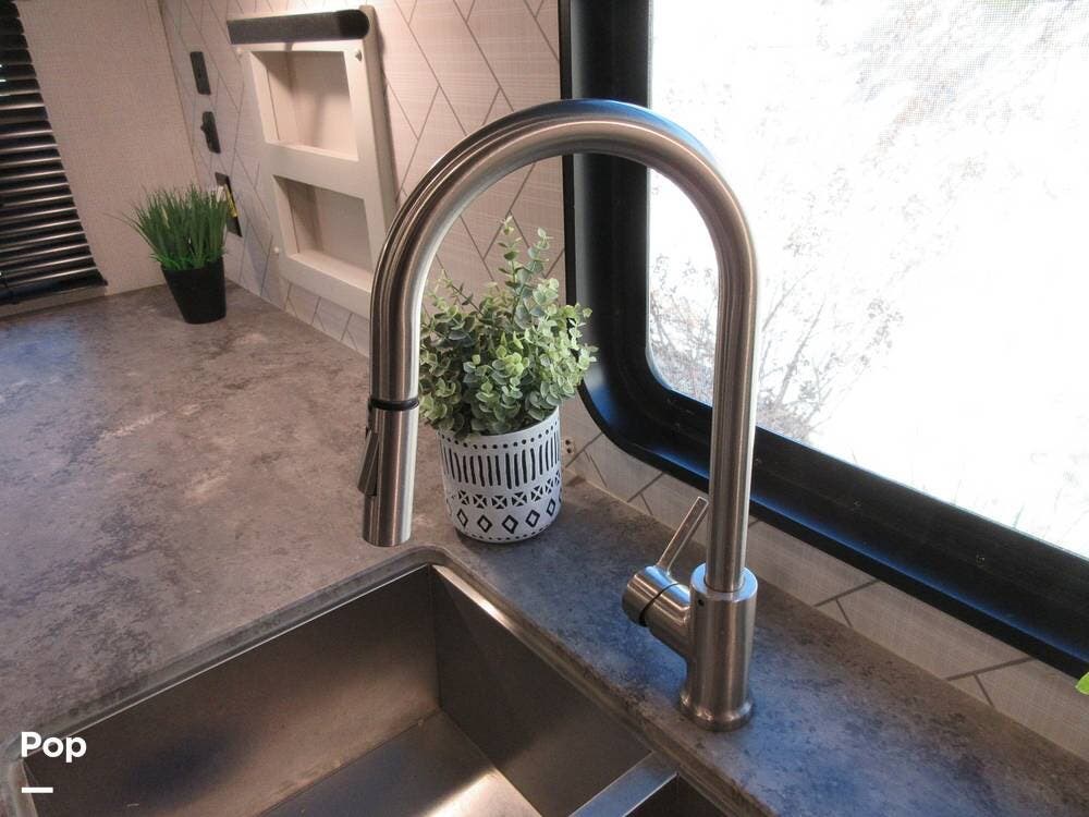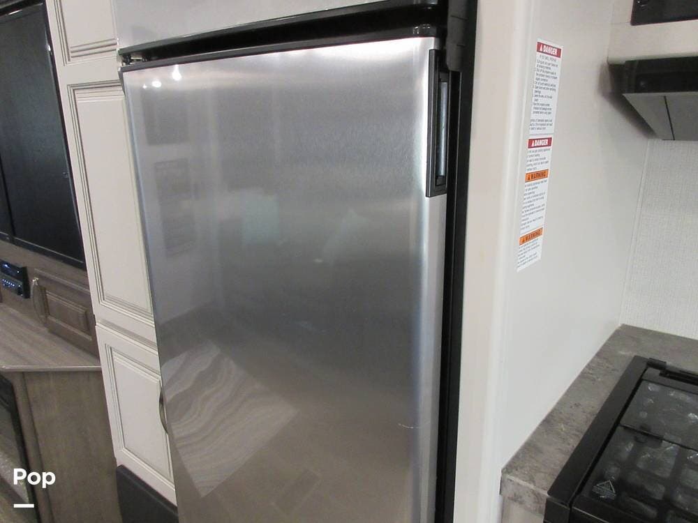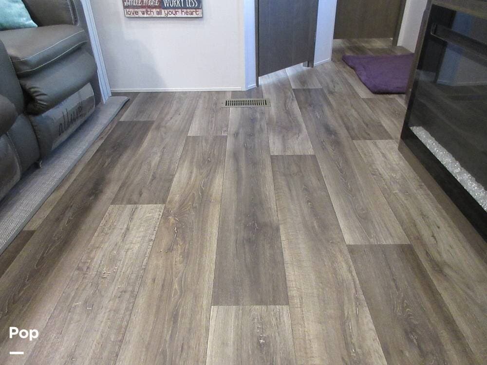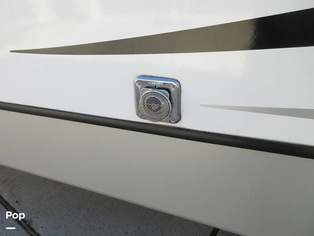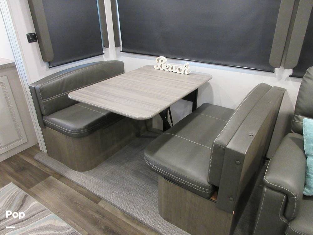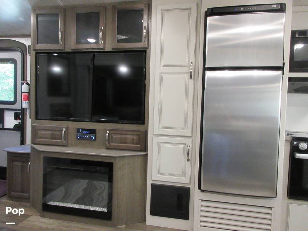 Designed with two large slide-outs, this RV feels extra spacious for a trailer of this size. The rear wraparound kitchen allows plenty of walking space for the living area and entertainment center.