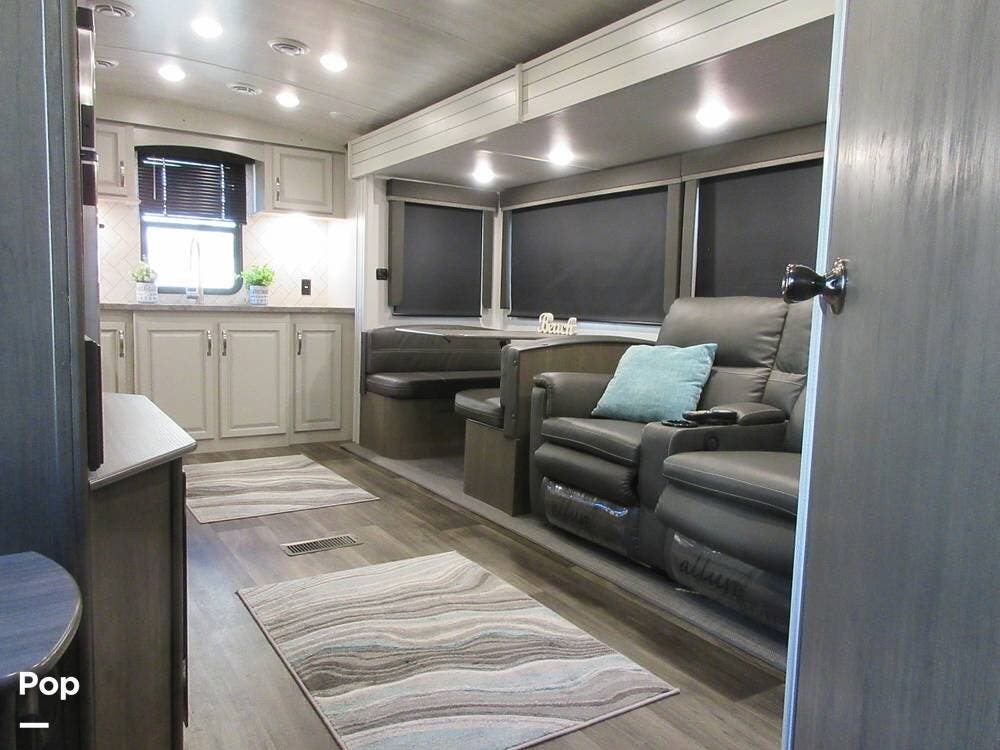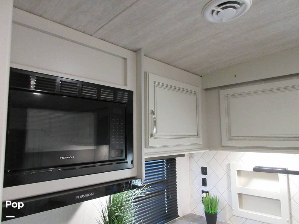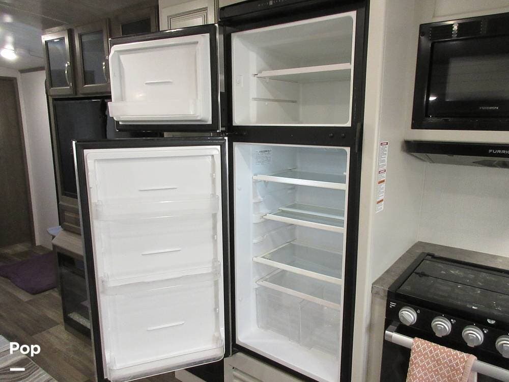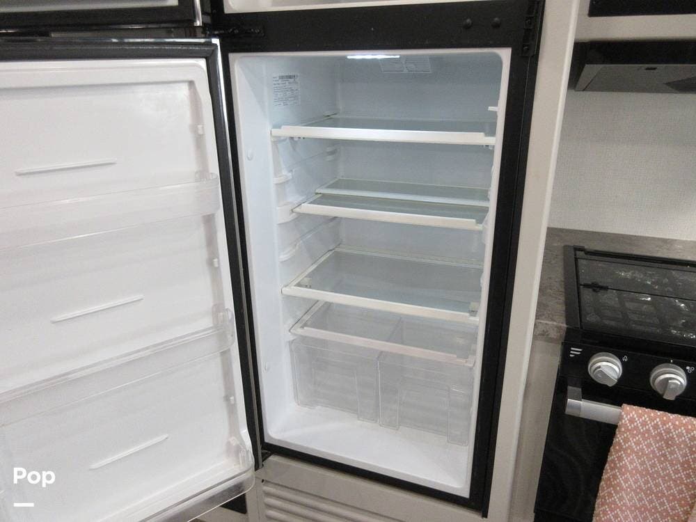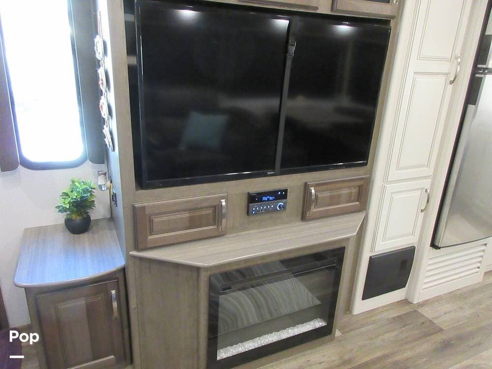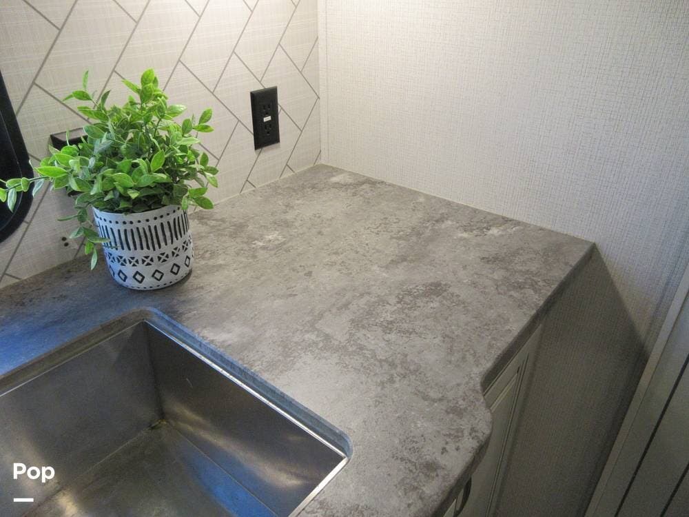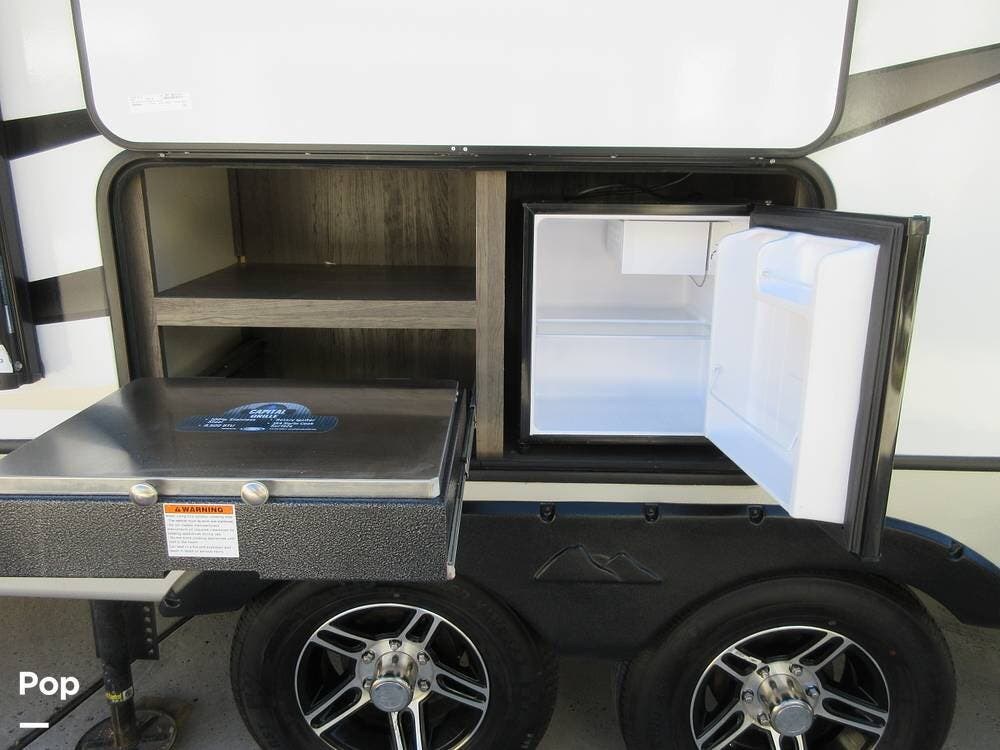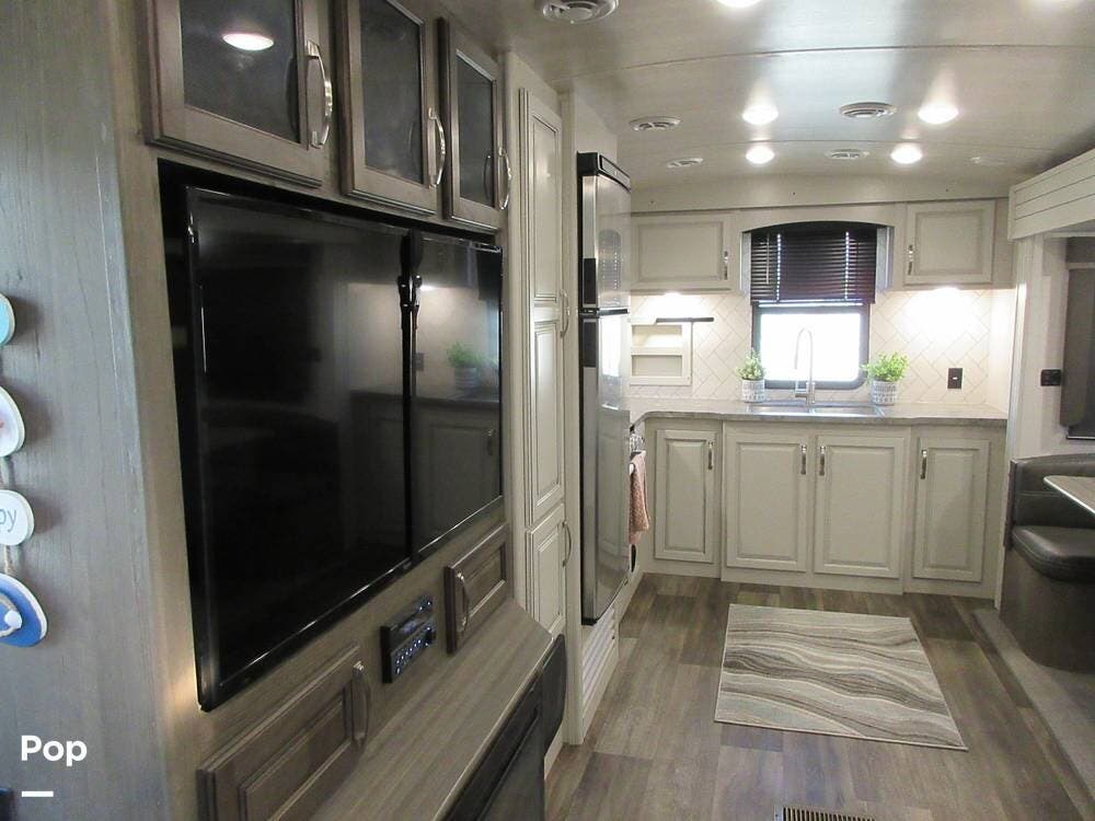Designed with two large slide-outs, this RV feels extra spacious for a trailer of this size. The rear wraparound kitchen allows plenty of walking space for the living area and entertainment center.