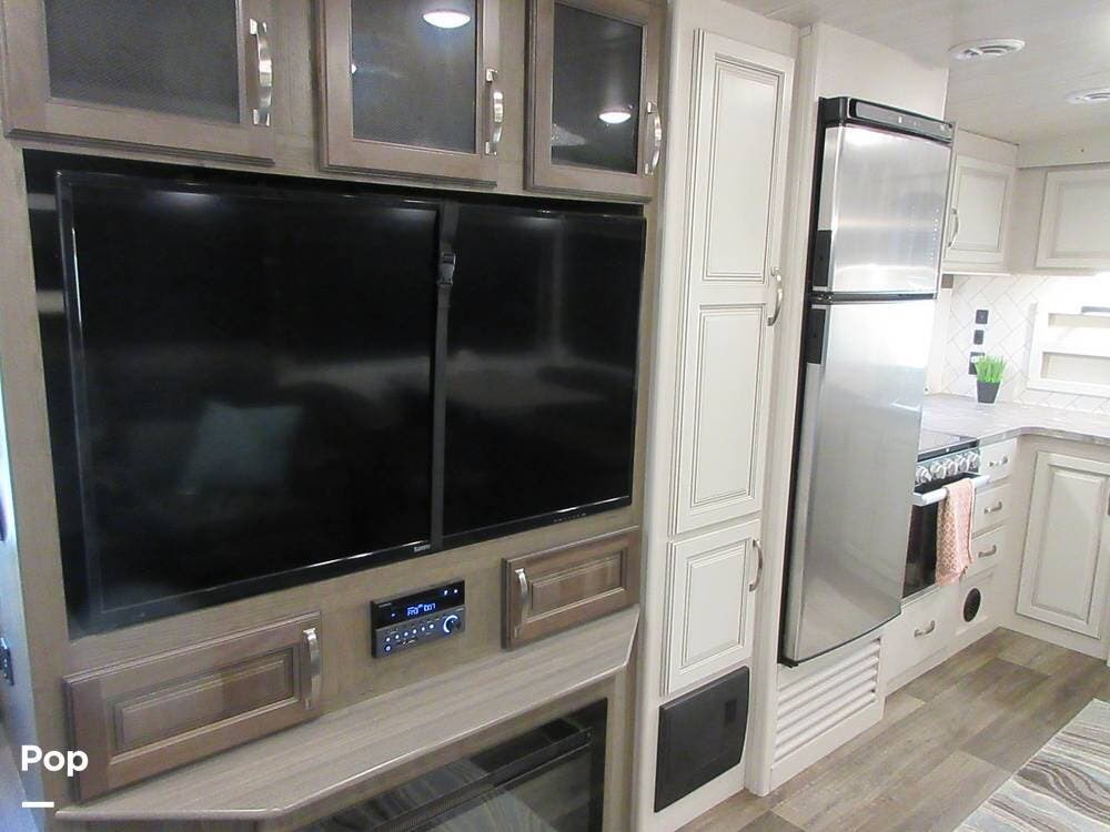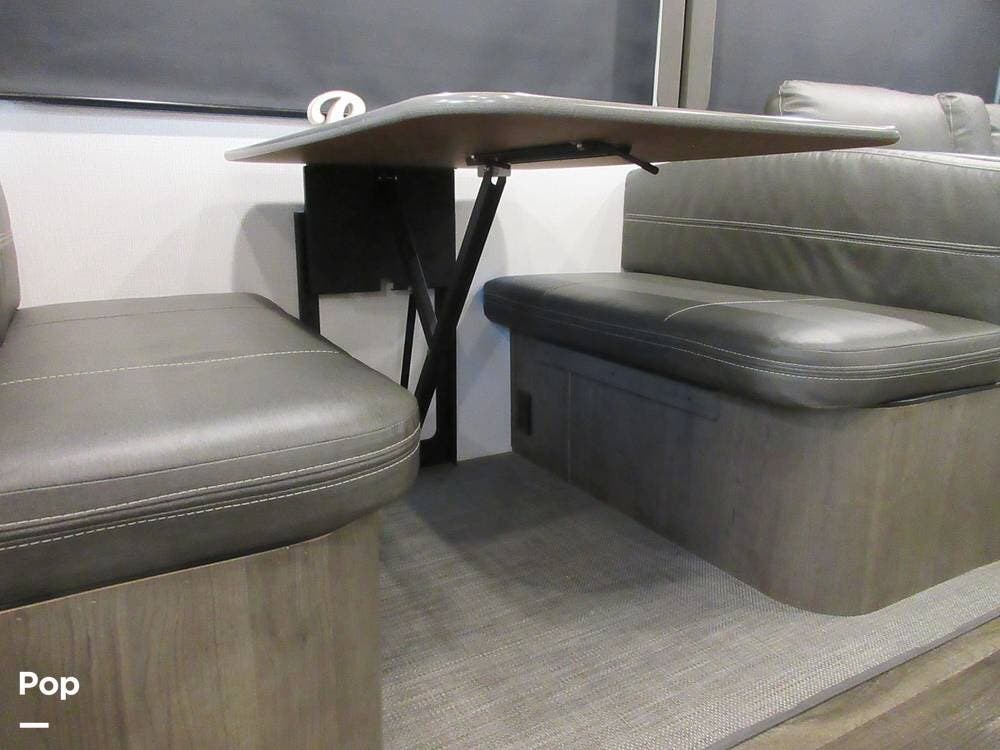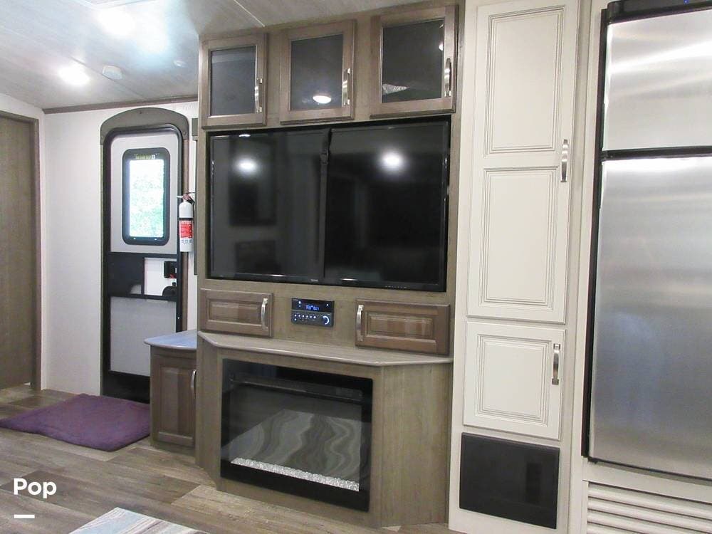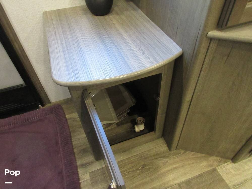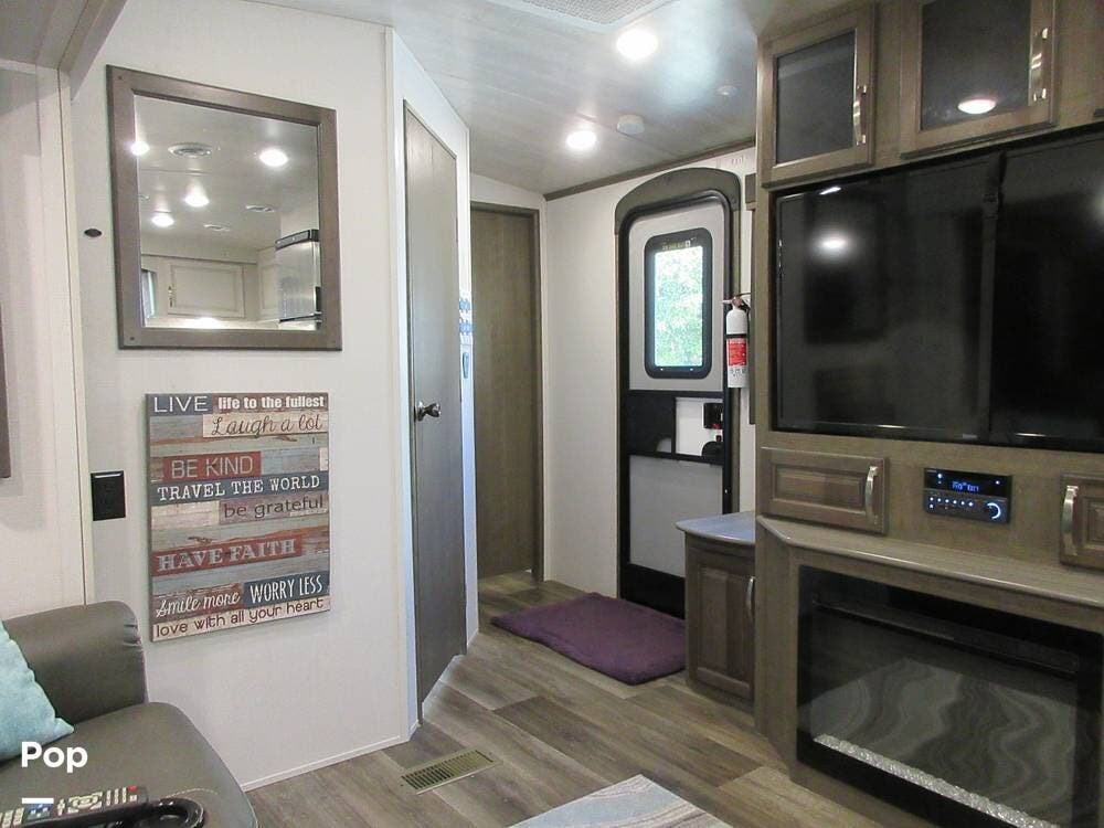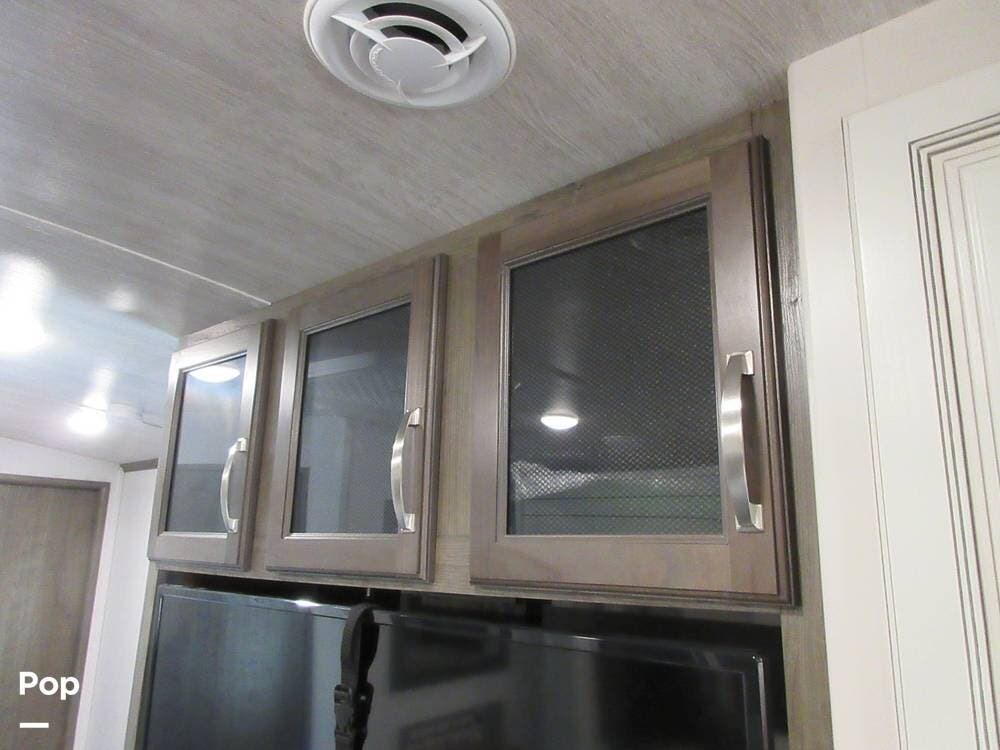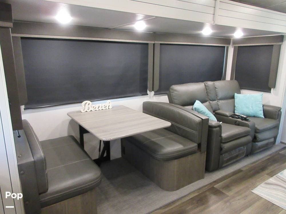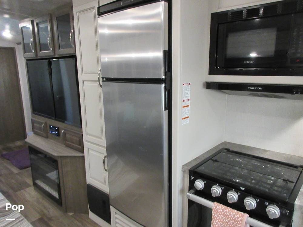 Designed with two large slide-outs, this RV feels extra spacious for a trailer of this size. The rear wraparound kitchen allows plenty of walking space for the living area and entertainment center.