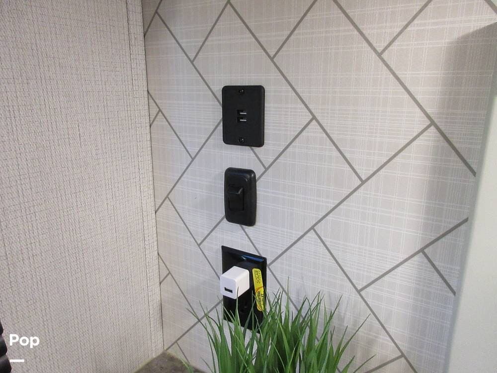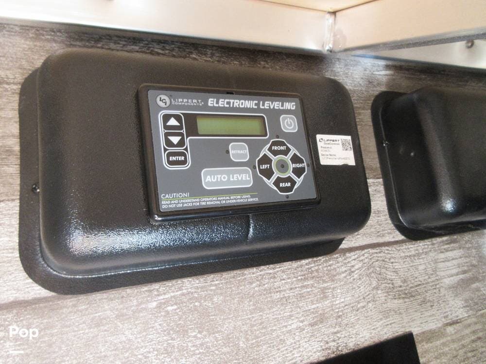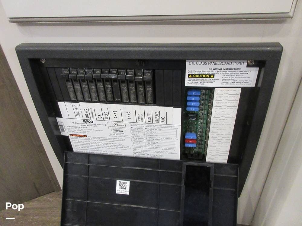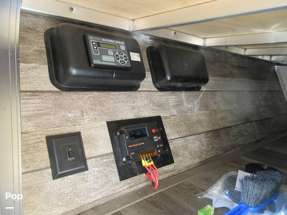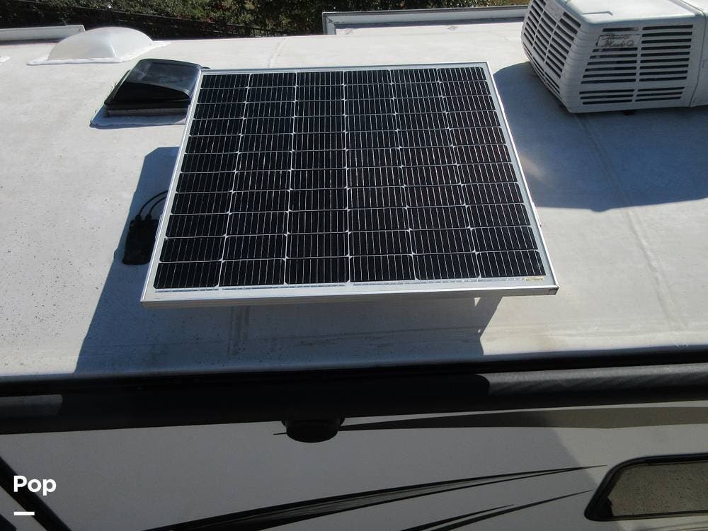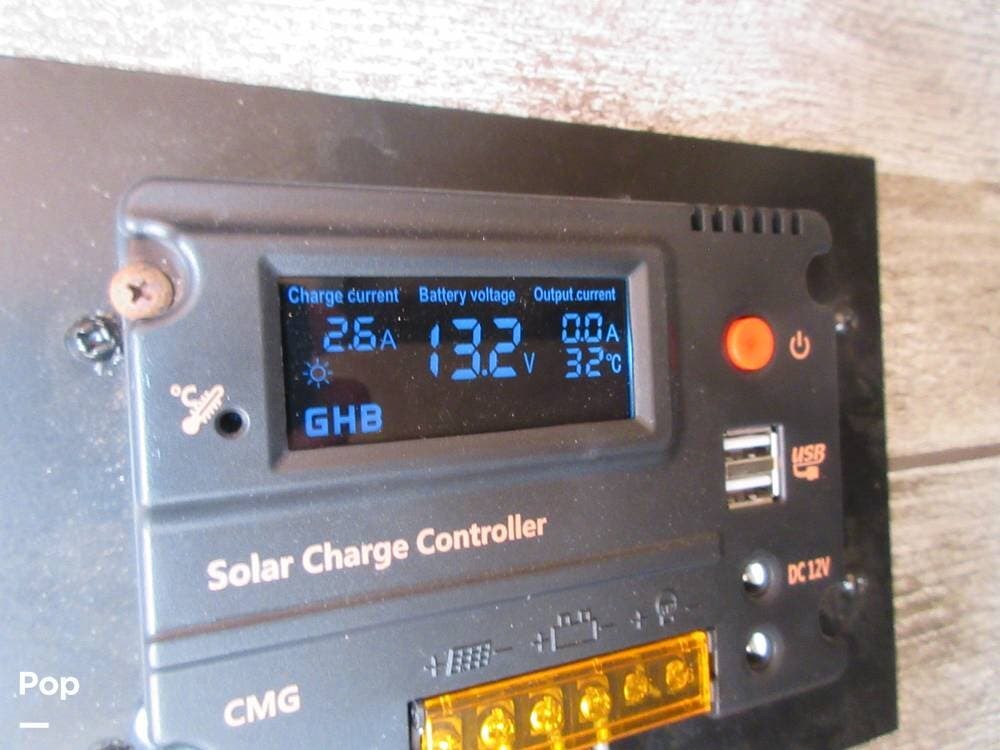 It has one solar panel on the roof, a Smart controller/charger, a Bluetooth-connected smartphone app to update you on the charge status, and a Zamp portable solar panel charge port. The RV currently has one house lithium battery (recent purchase). The tongue rack does have room for an extra battery if you choose to add one.