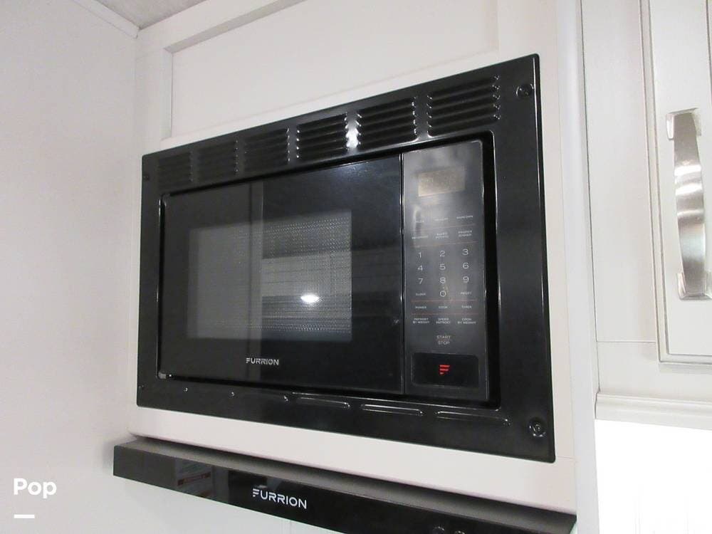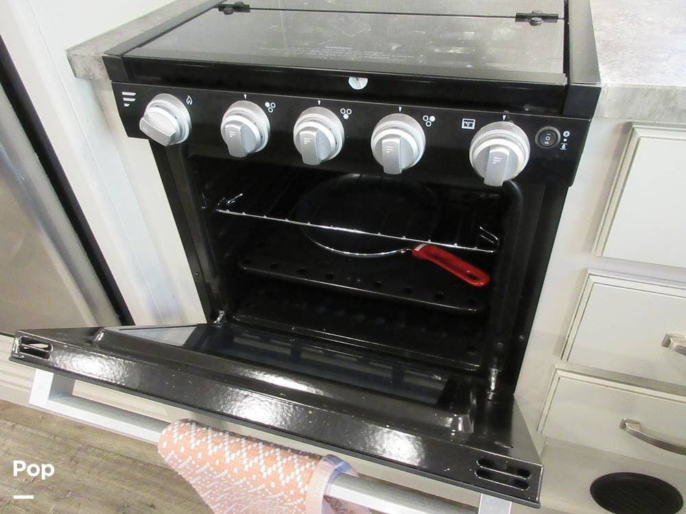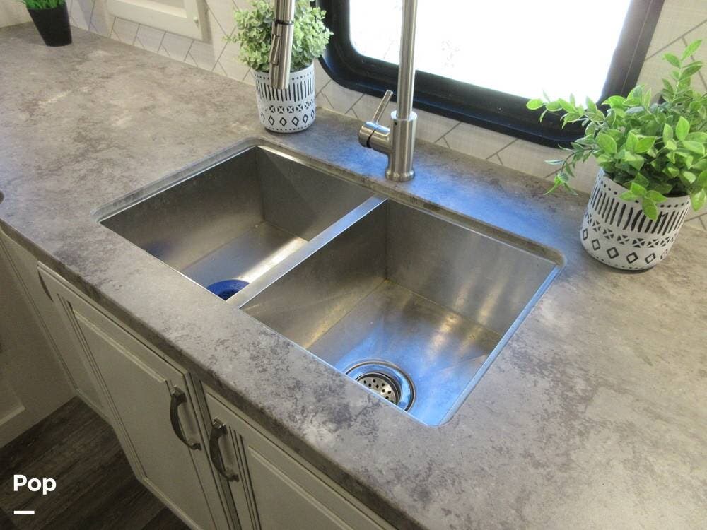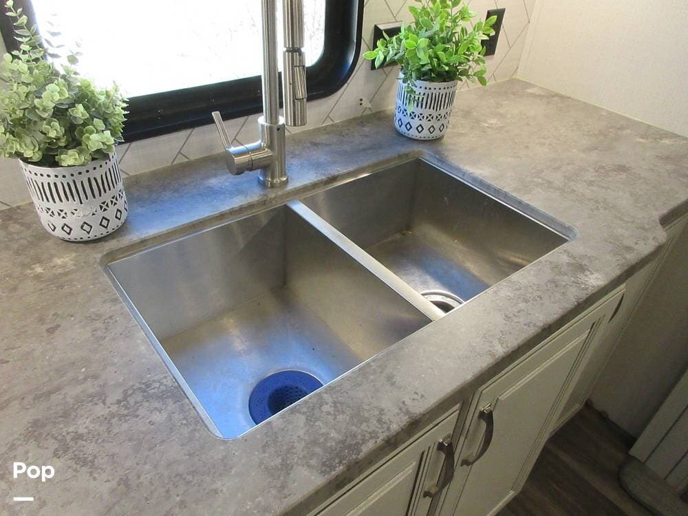 Do you enjoy cooking, or is eating your favorite hobby? Either way, you will appreciate the roomy kitchen in the rear, equipped with a stove, oven, microwave, and refrigerator/freezer. There is plenty of counter space to prepare your meals. The rear kitchen design allows for more cabinet space compared to other models. The double kitchen sink is just the right size for cleanup time.