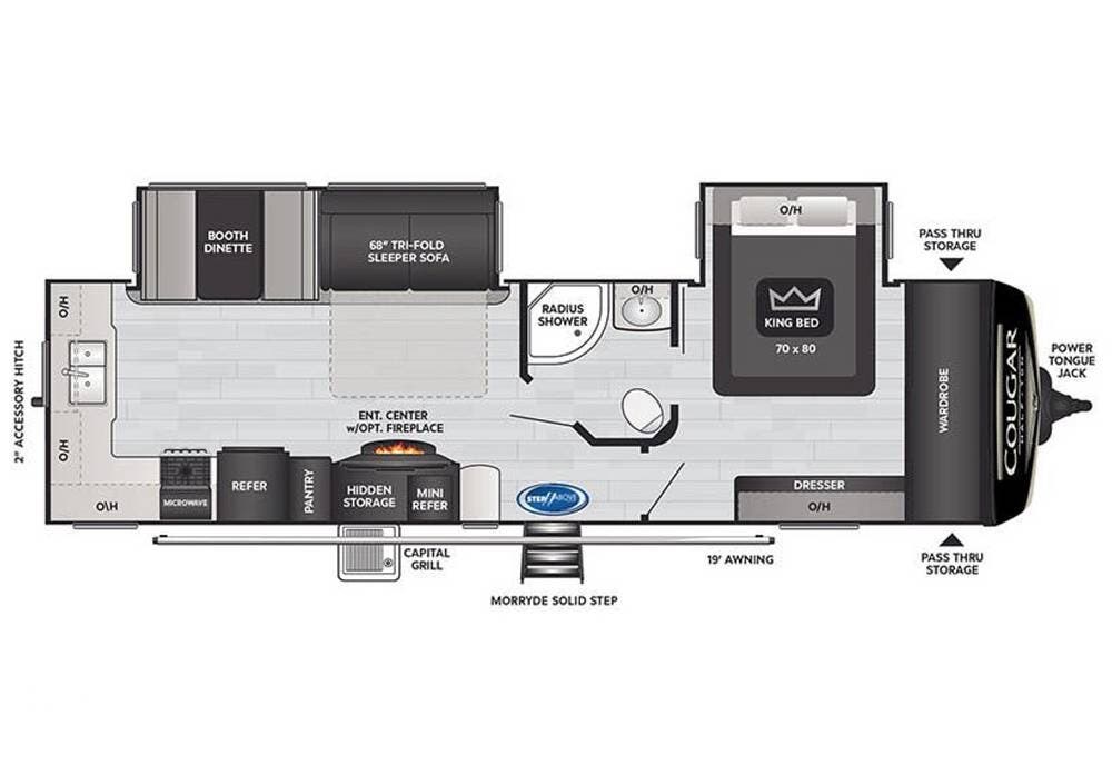 This Cougar will set up quickly and perform well in any RV park with 50 amp service. Setup and takedown are a breeze with the power tongue jack and auto leveling system with hitch height recall. The electronic control center can be accessed from your smartphone. No need to enter the RV and touch the screen pad.