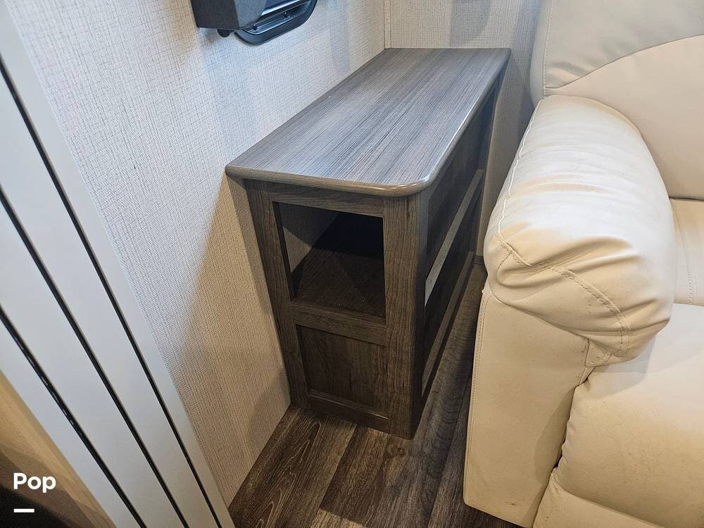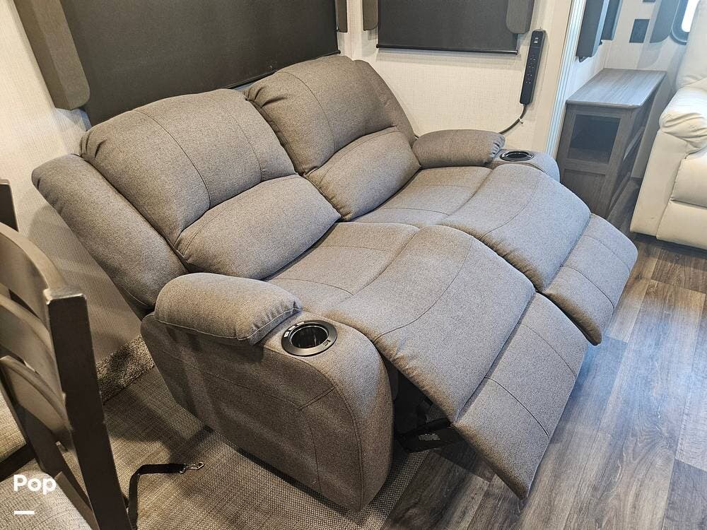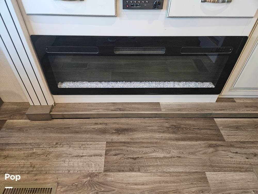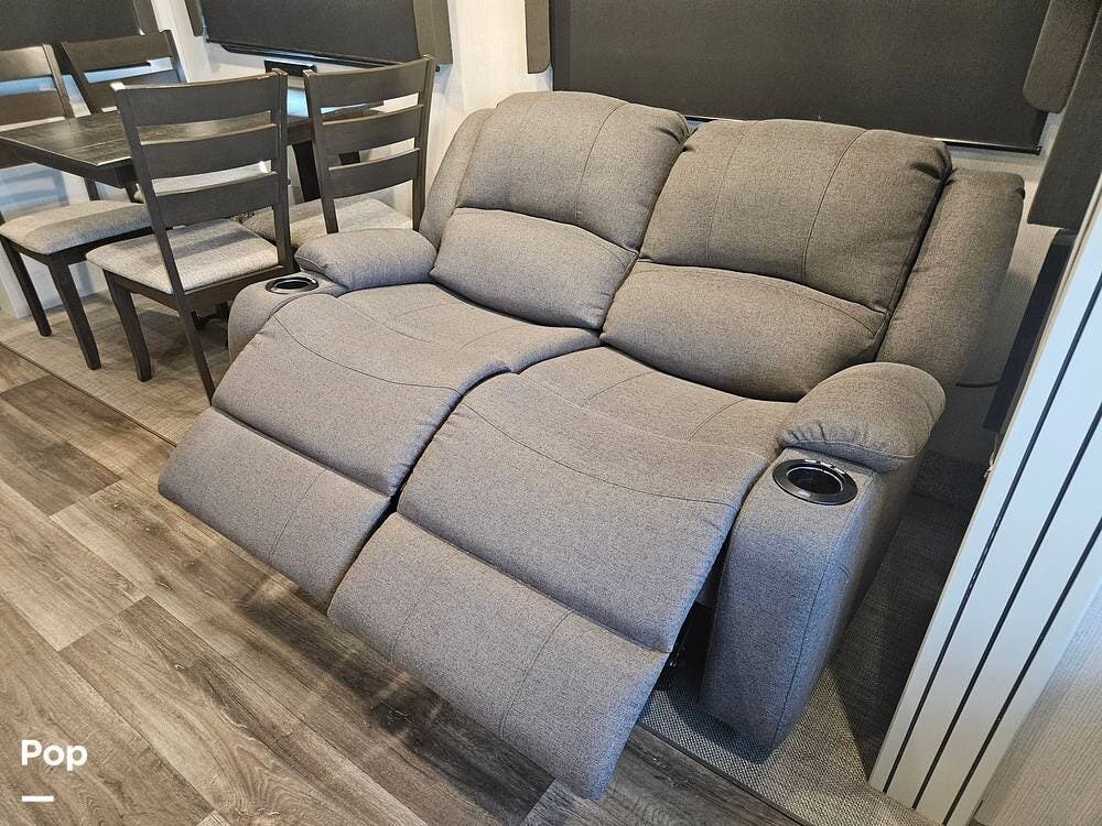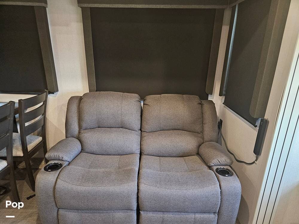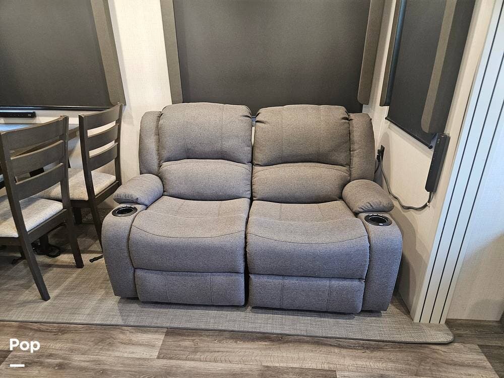 It has a large rear living area including a large TV, a fireplace, 2 stadium-style recliners, a dinette with four chairs, Winegard Wi-Fi, USB ports, and more.