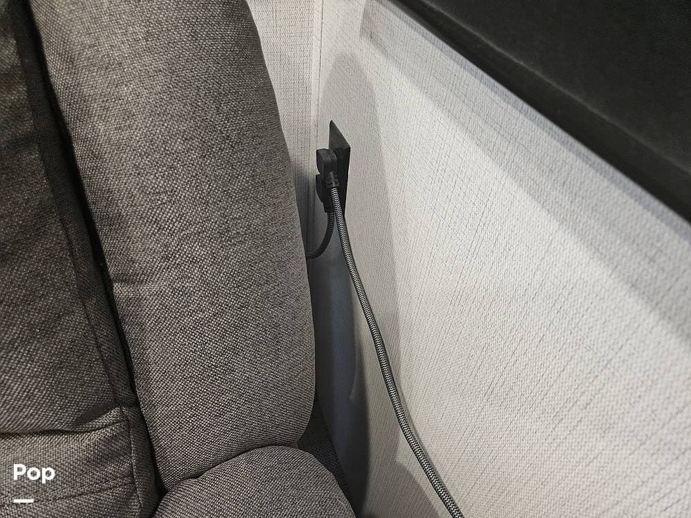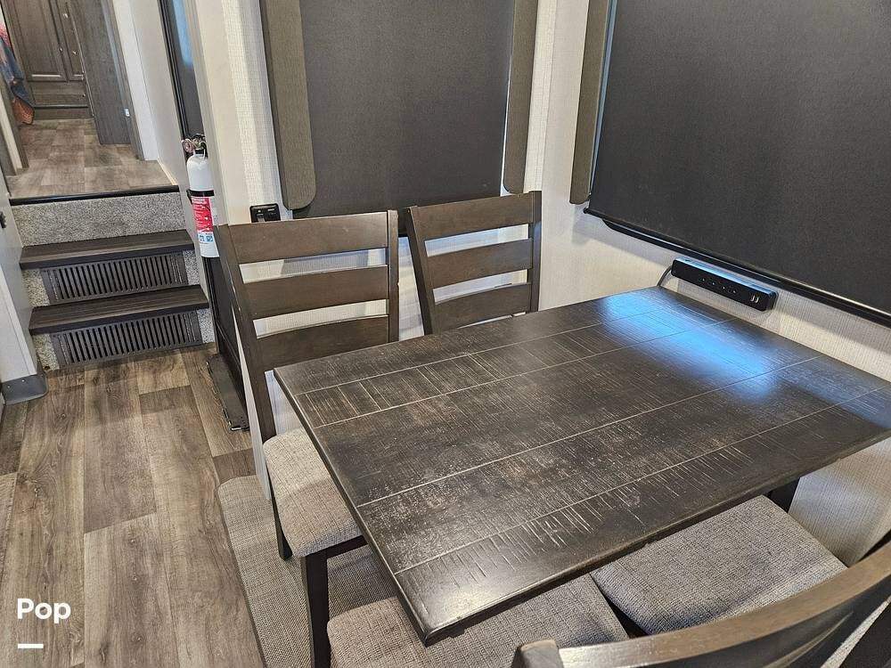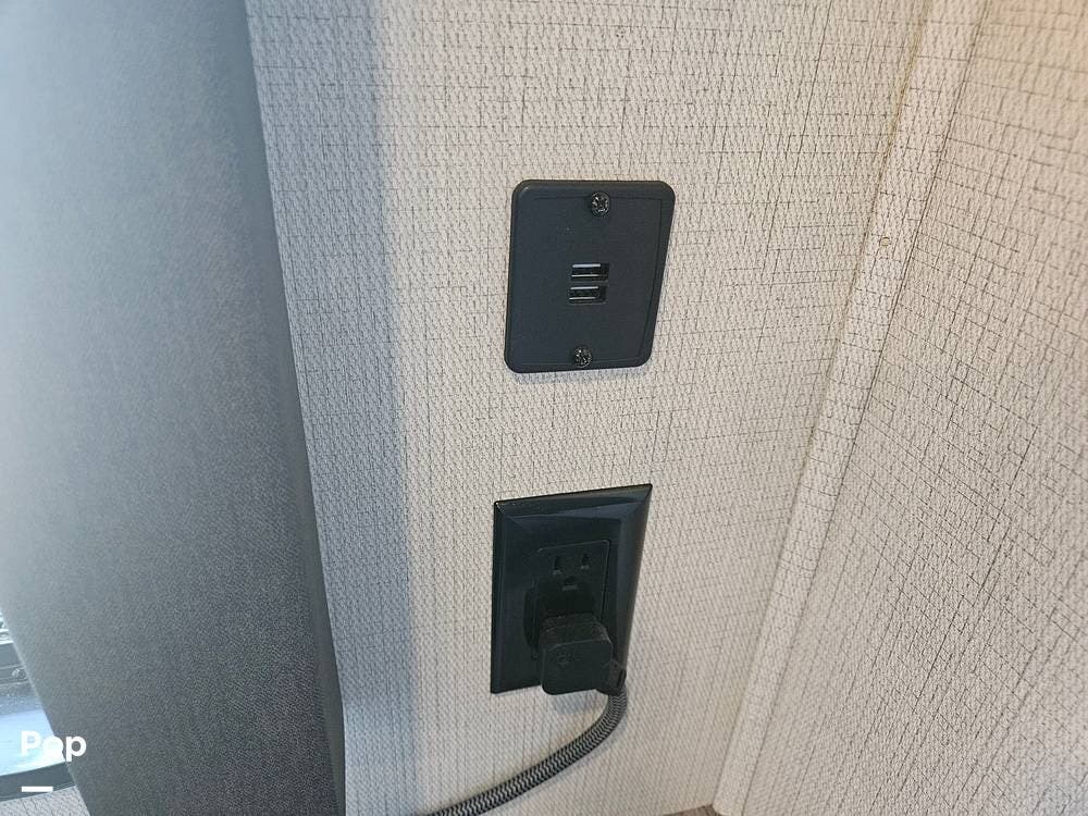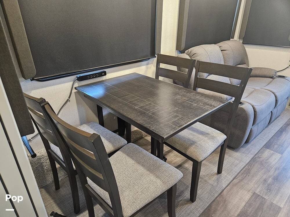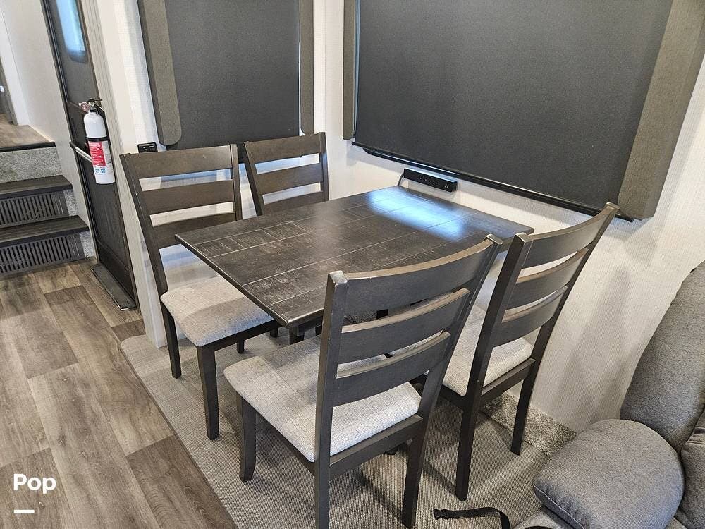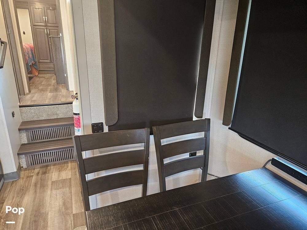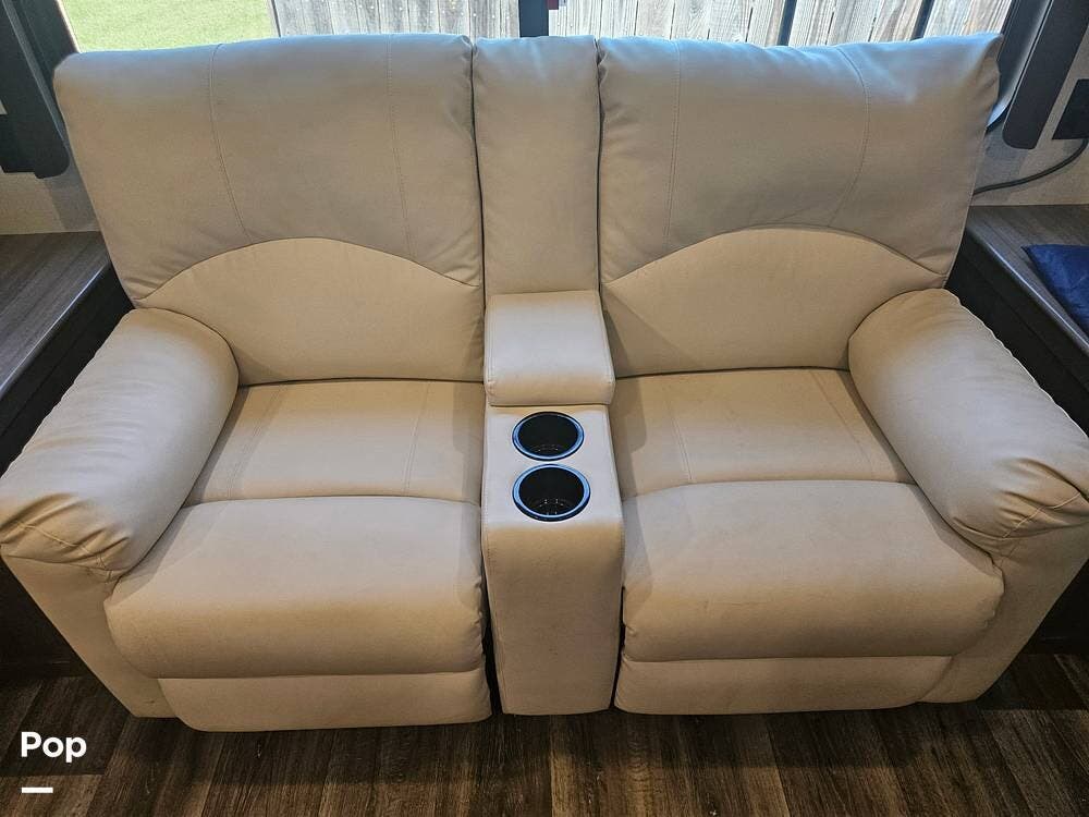 It has a large rear living area including a large TV, a fireplace, 2 stadium-style recliners, a dinette with four chairs, Winegard Wi-Fi, USB ports, and more.