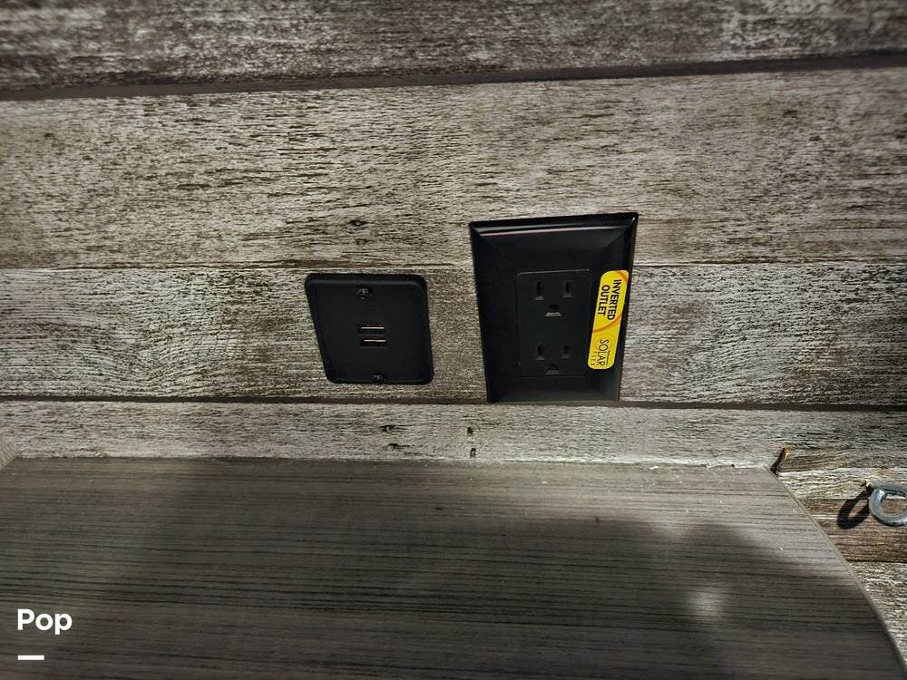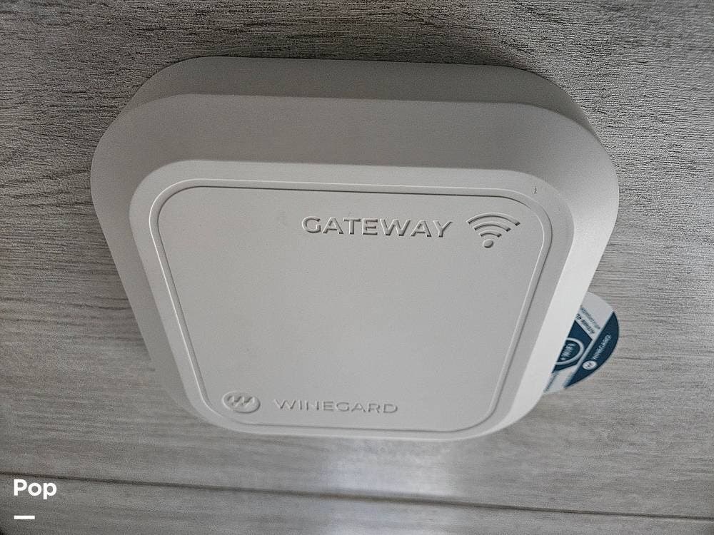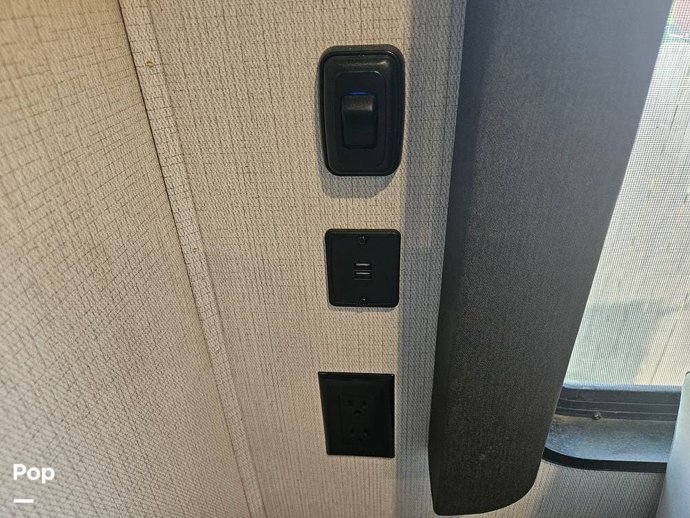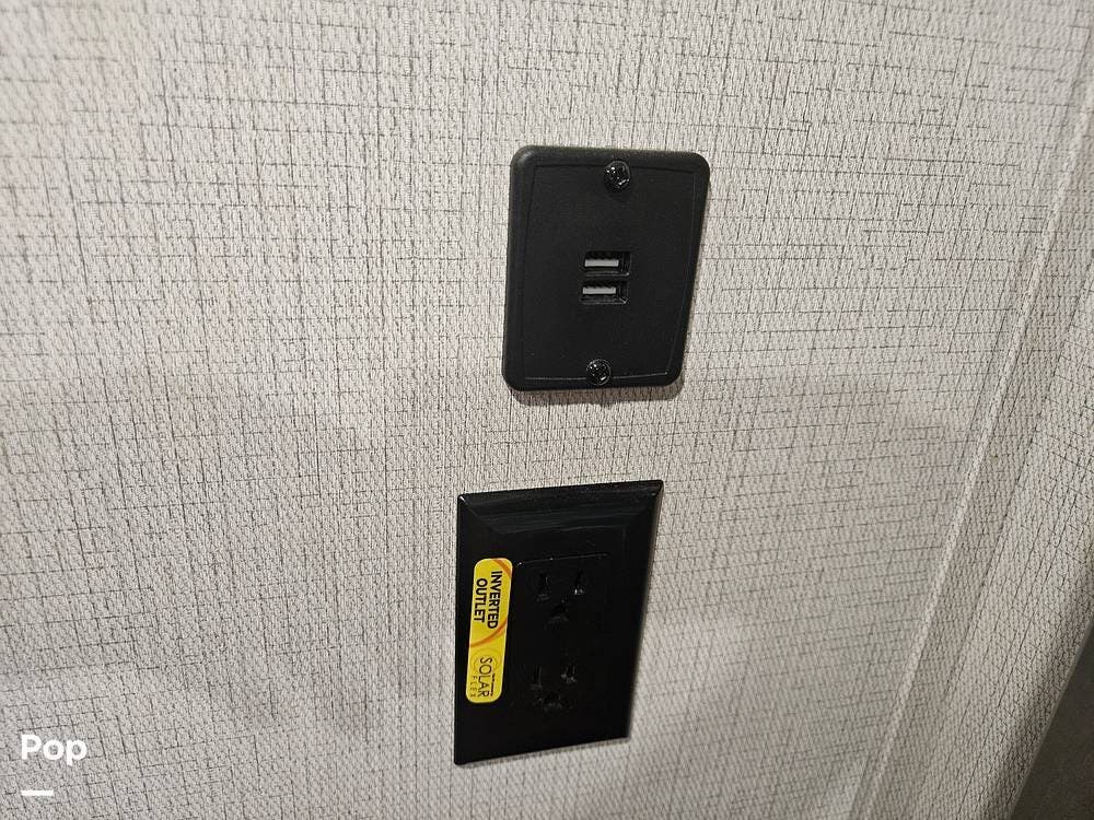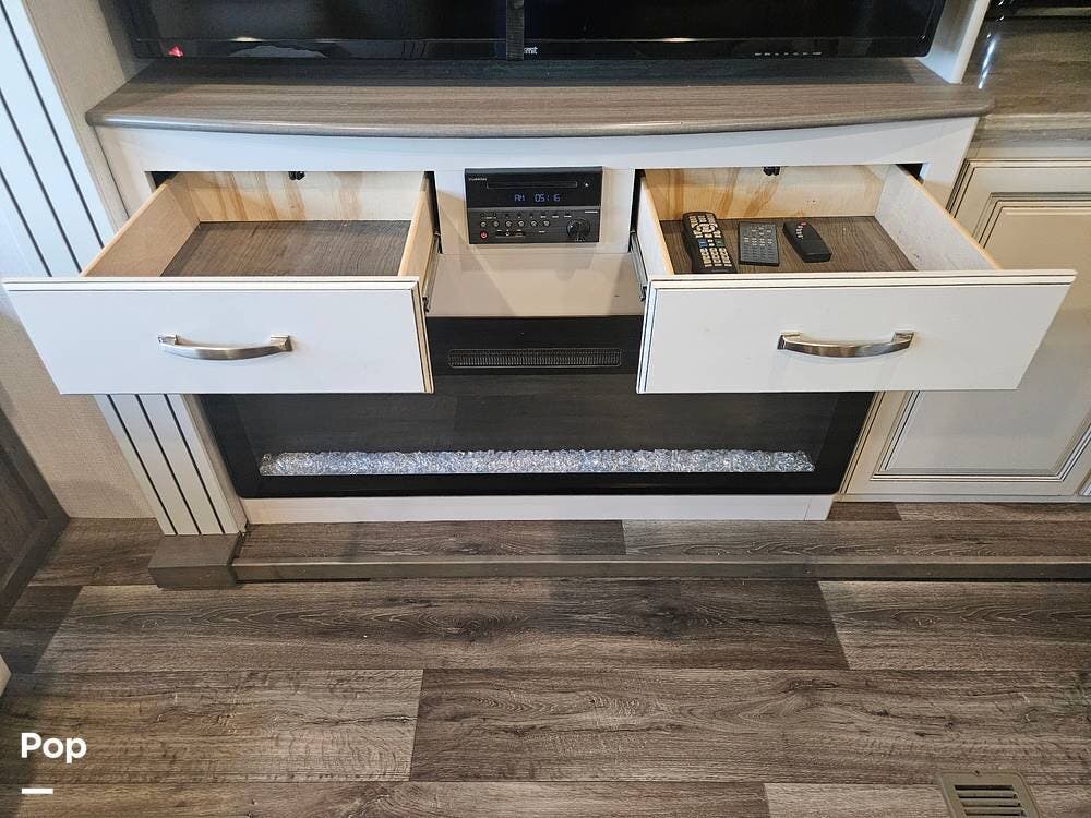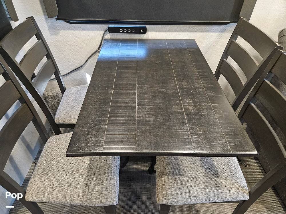 It has a large rear living area including a large TV, a fireplace, 2 stadium-style recliners, a dinette with four chairs, Winegard Wi-Fi, USB ports, and more.