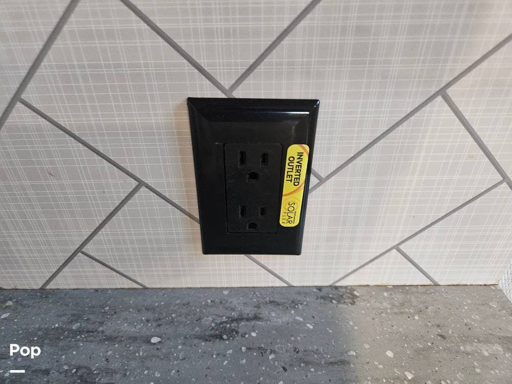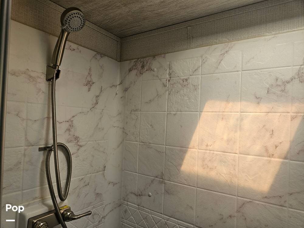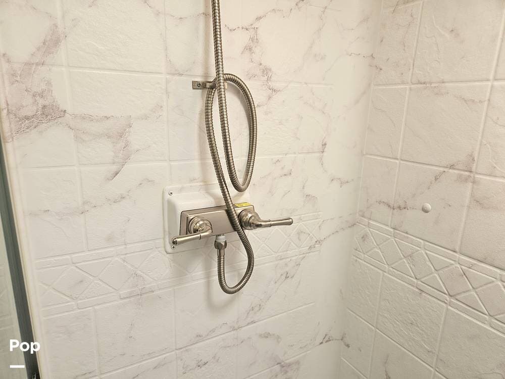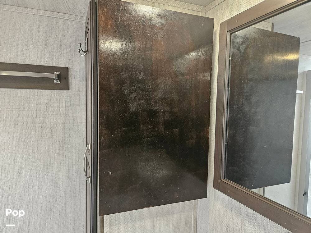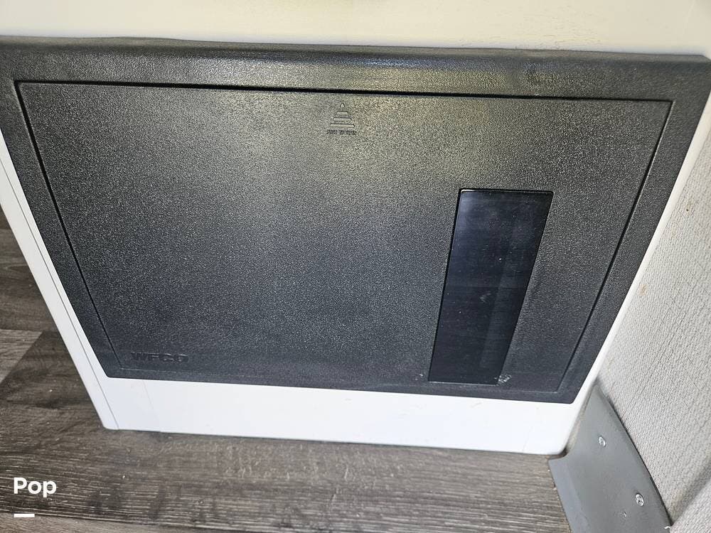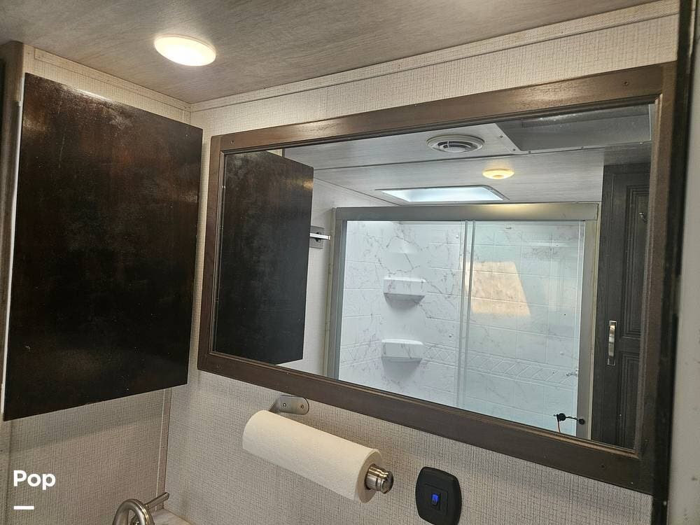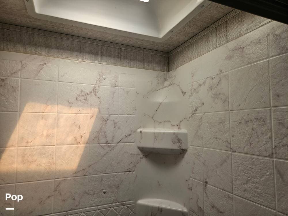 It has a large rear living area including a large TV, a fireplace, 2 stadium-style recliners, a dinette with four chairs, Winegard Wi-Fi, USB ports, and more.