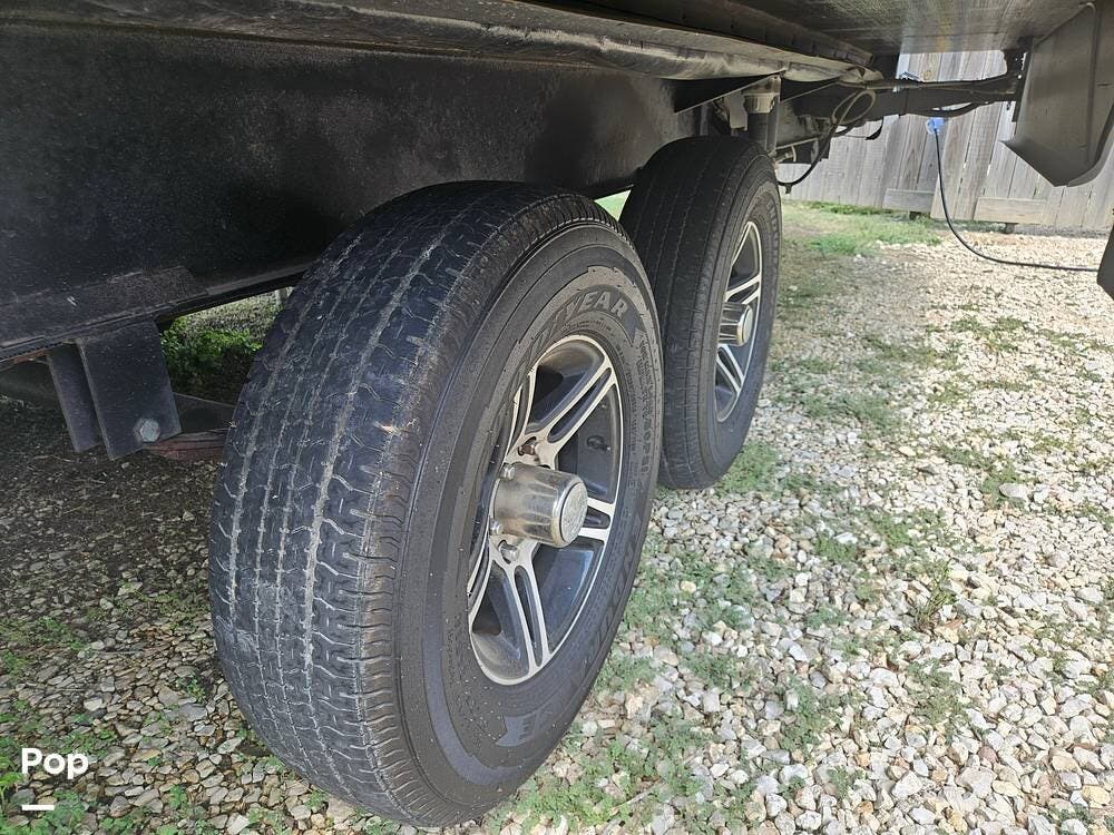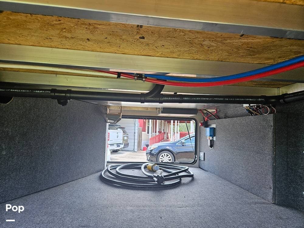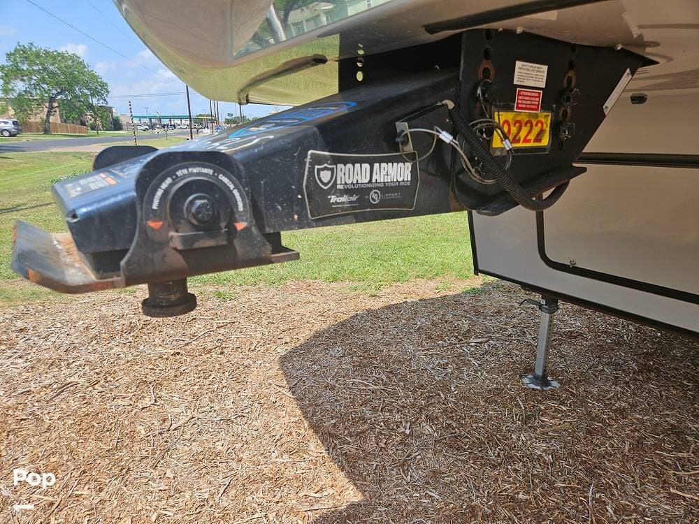 It is equipped with the Road Armor Suspension and Pin Box. It equalizes axle load to dampen shock and vibration, helps absorb towing shock, and reduces the transfer of forces from the fifth wheel to the truck. It has a 2" accessory hitch allowing towing up to 3,000 pounds.
