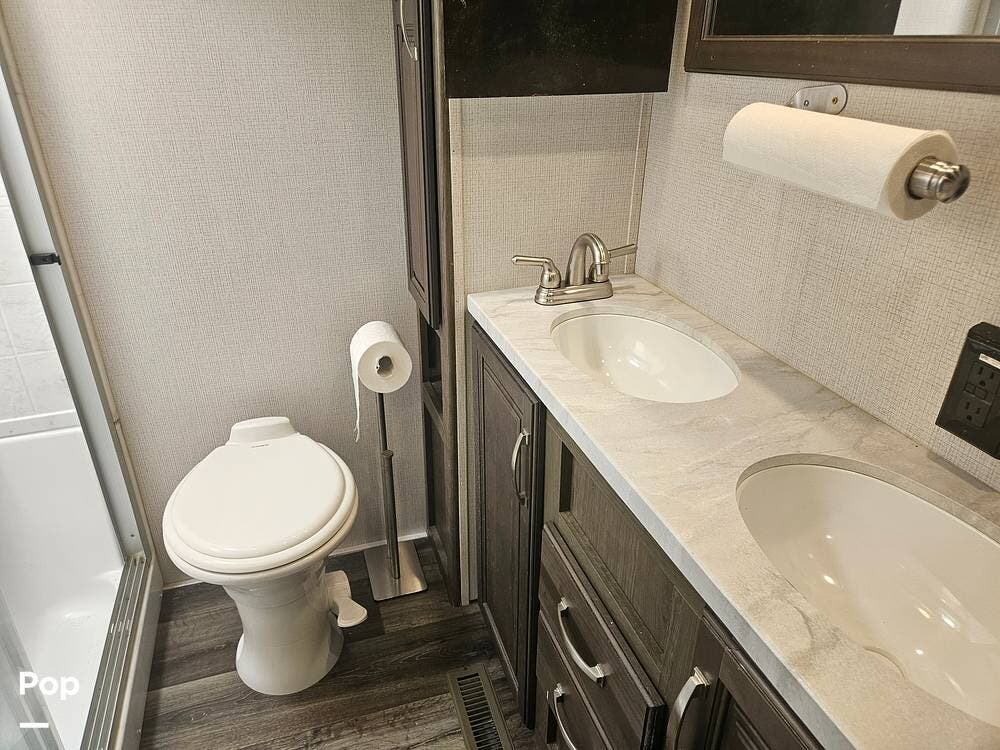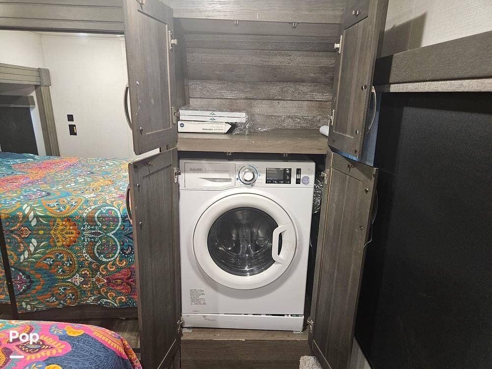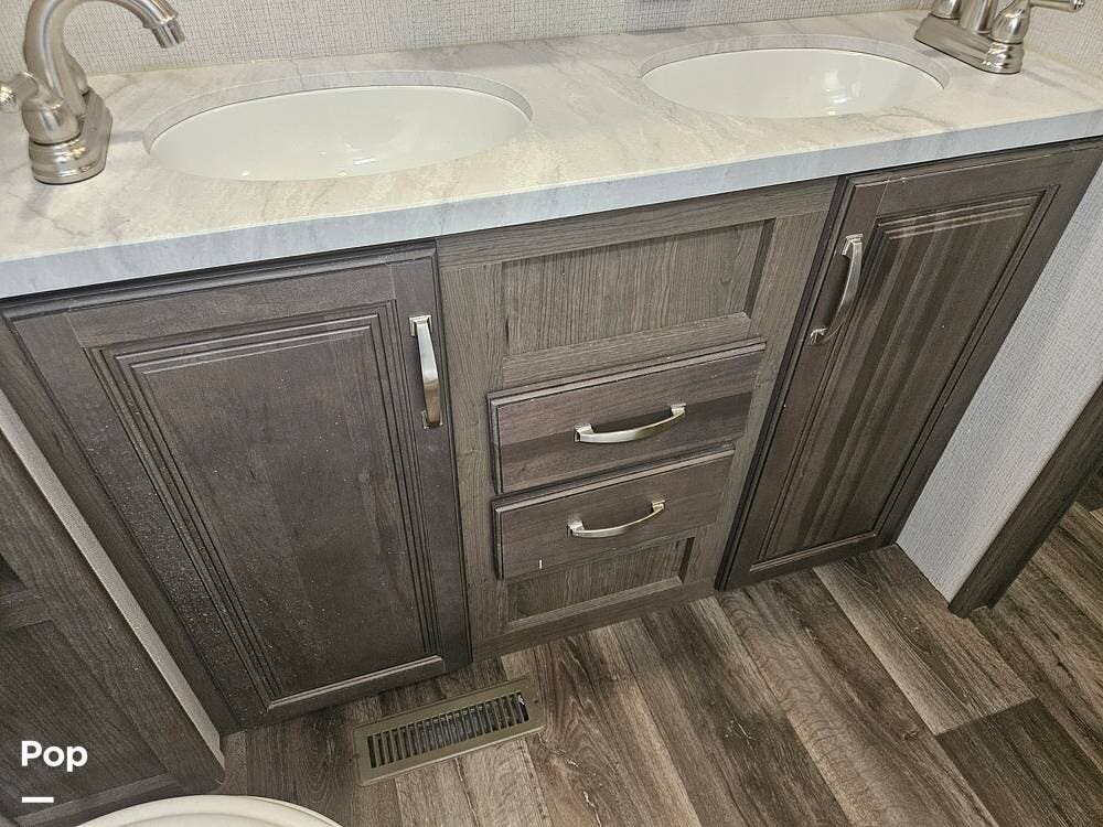 This 2022 Cougar 316RLS has a large front bedroom with an upgraded queen-size mattress, under-bed storage, a chest of drawers, a large closet, a TV, and a washer/dryer combo. A very nice bathroom with a large shower, skylight, ceiling exhaust fan, double sinks, storage, and two medicine cabinets assures you have all you need on the road.