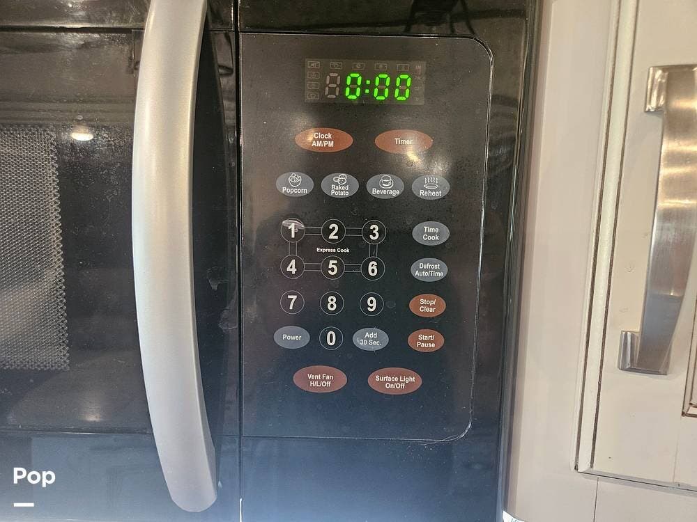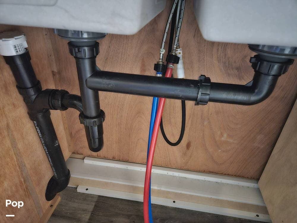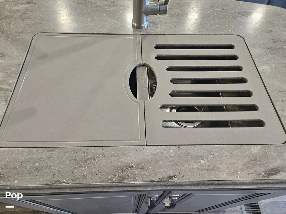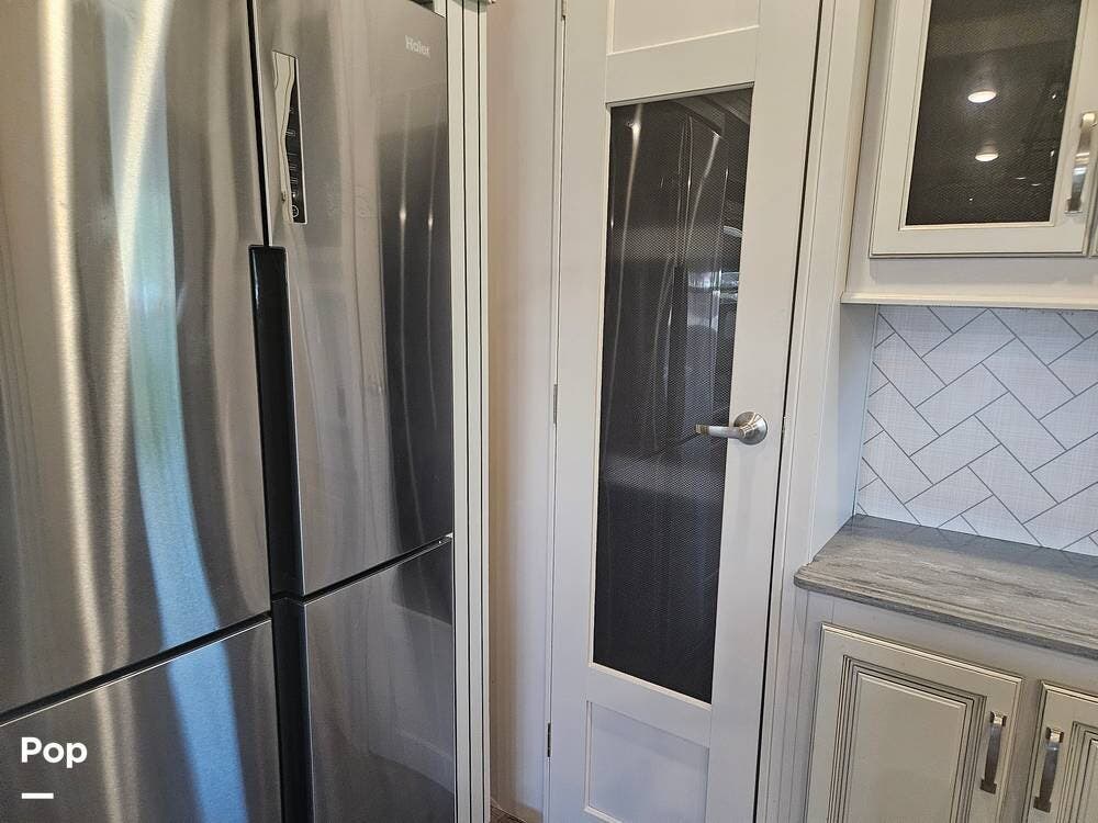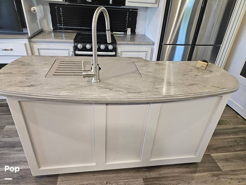 The main cabin is fully equipped with a kitchen island with a double sink, a 3-burner stovetop with oven, a microwave oven, a residential refrigerator/freezer, a large pantry, and plenty of kitchen storage.