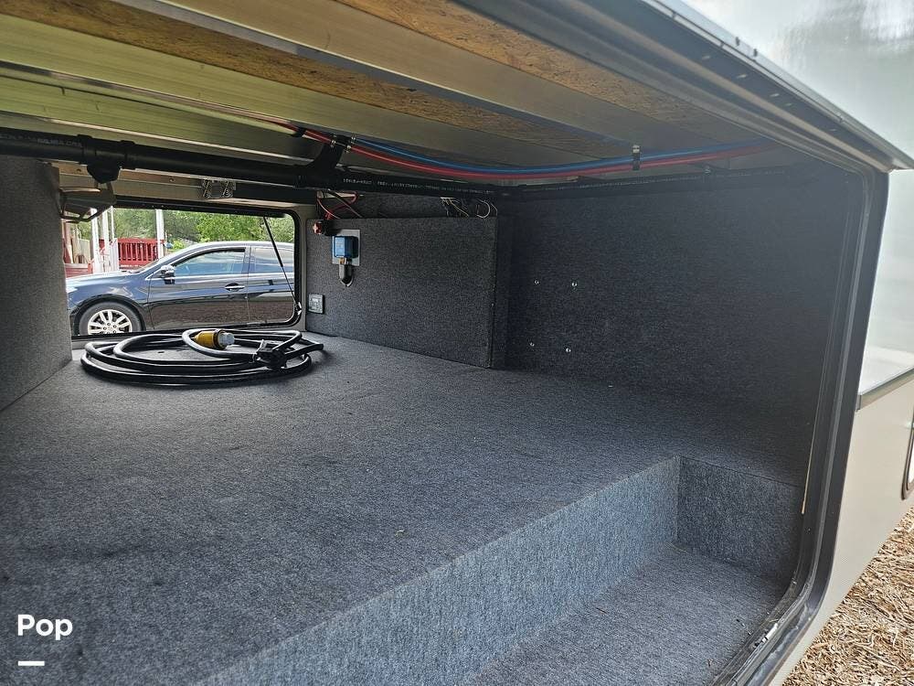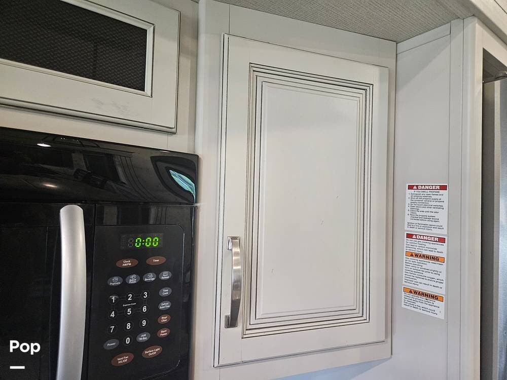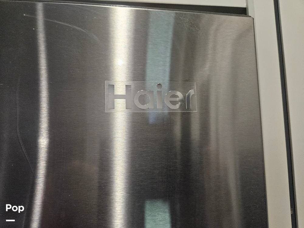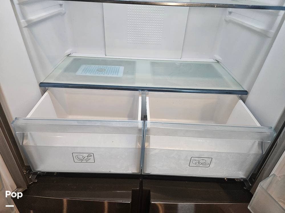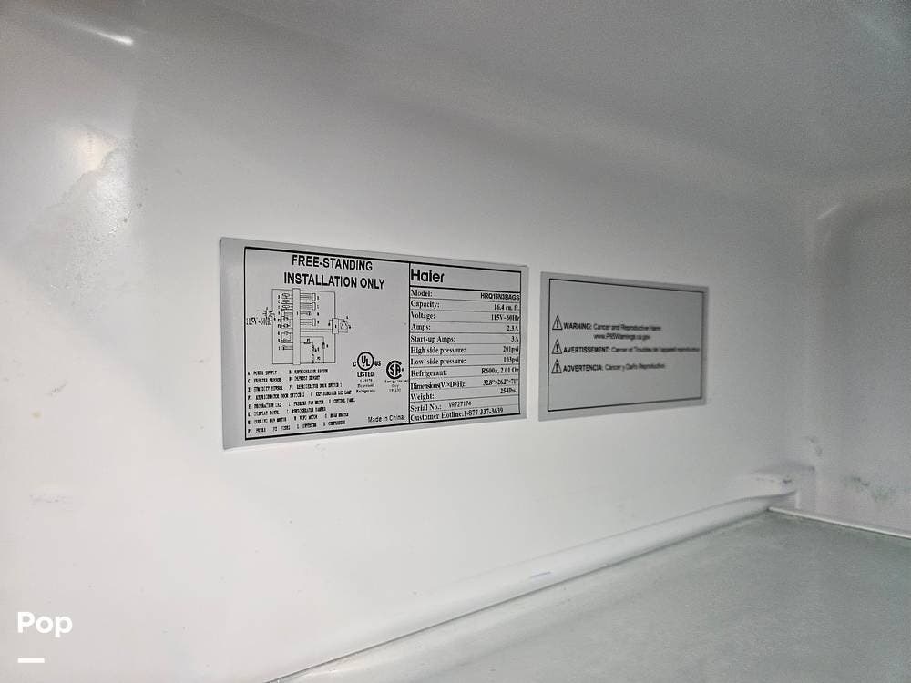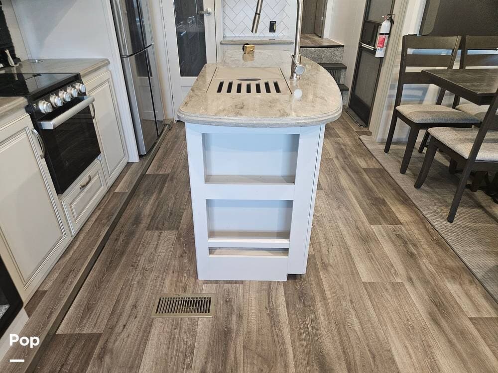 The main cabin is fully equipped with a kitchen island with a double sink, a 3-burner stovetop with oven, a microwave oven, a residential refrigerator/freezer, a large pantry, and plenty of kitchen storage.