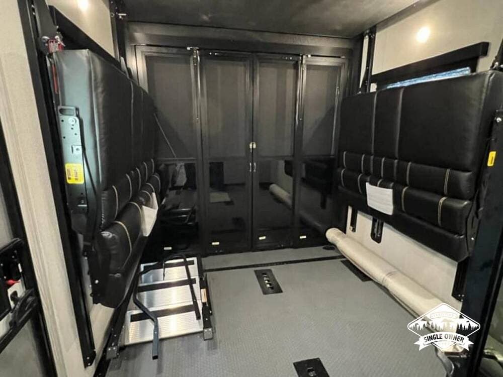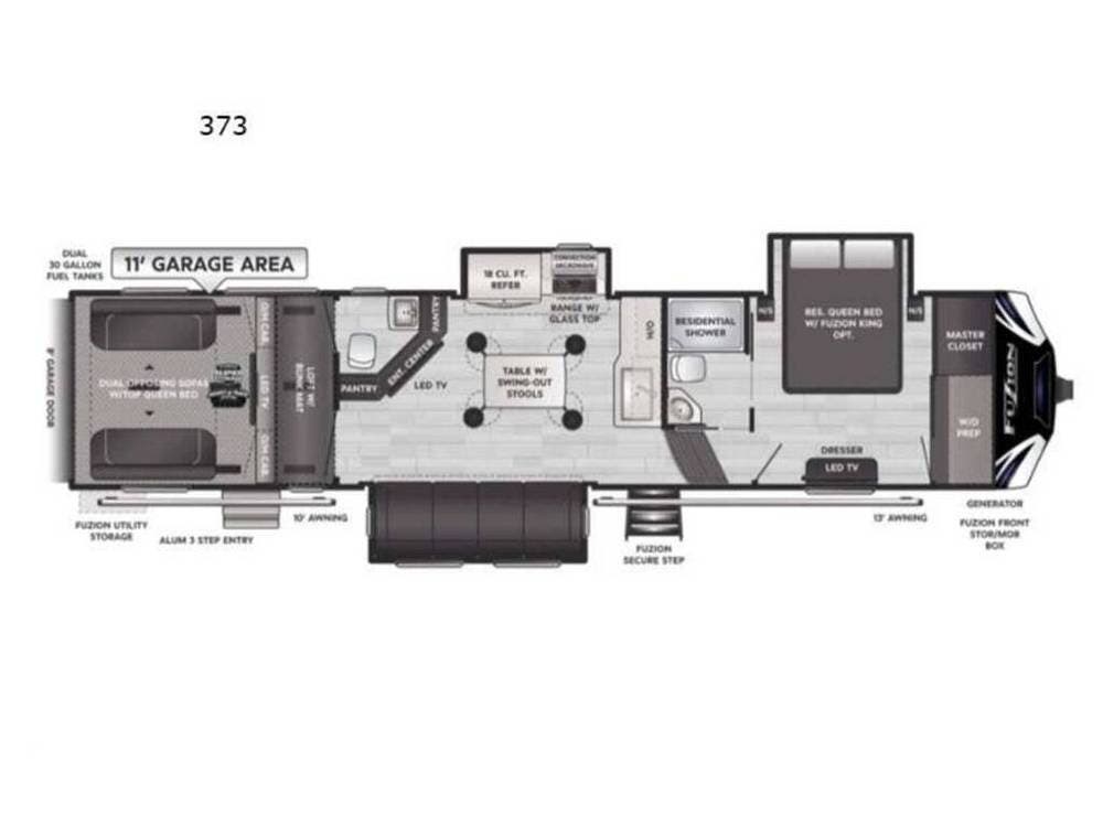 This 2022 Fuzion 373 toy hauler has options like a generator, washer and dryer, central vacuum, fueling station for the toys, fireplace, two side entry doors, and a bath and a half!