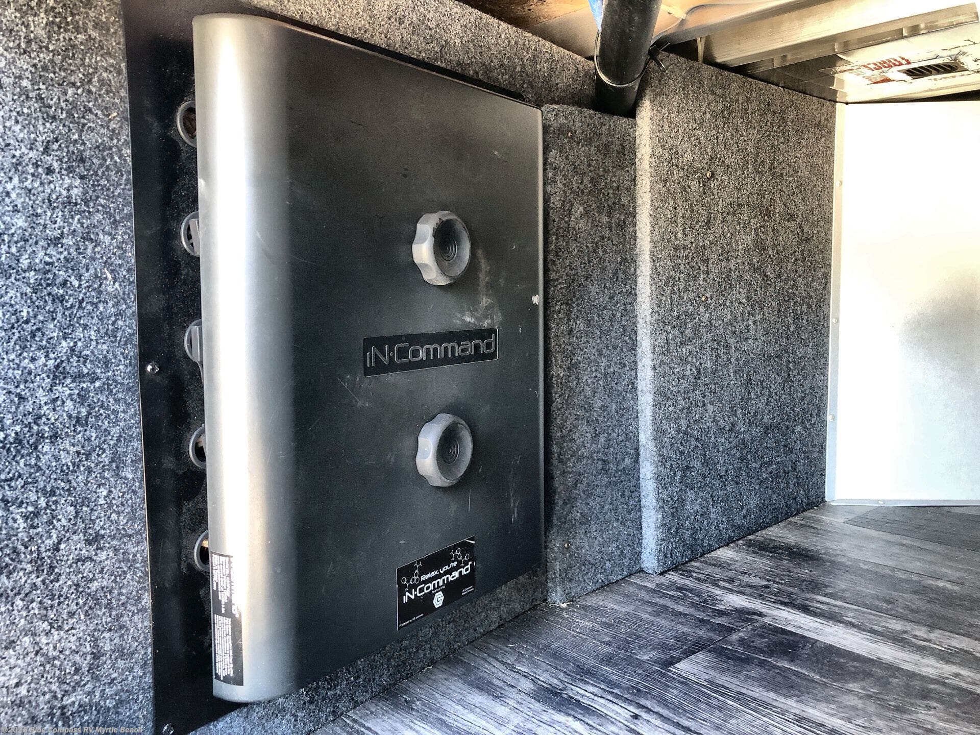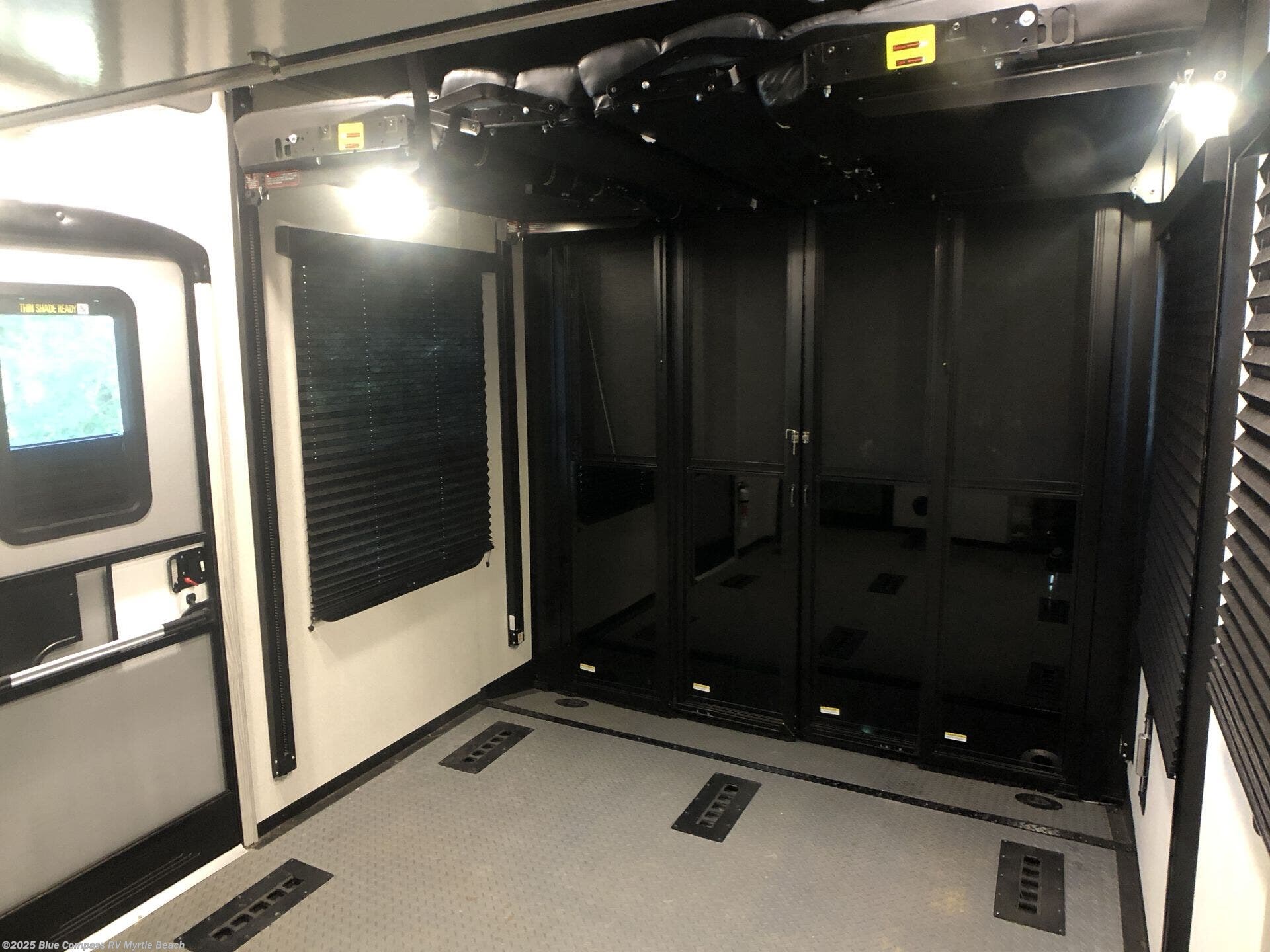 This toy hauler is packed with handy features! Starting with the 11' garage area that has dual opposing sofas with a queen bed above them, an LED TV, a loft with a bunk mat, a half bathroom, and one of the dual entrance doors to the unit. The kitchen slide not only opens up the living space, but also has a three burner range with a convection microwave above, a stainless steel refrigerator, and an entertainment center with an LED TV and fireplace all of which is across from the theater seating slide and a hide-a-bed sofa. There is even an outdoor entertainment center with an LED TV, a pull-out cooktop, and a refrigerator to keep your beverages cold while you watch the big game. When you're ready to wind down your nights, clean up in the dual entry bathroom with the residential shower with a seat then head directly into the front private bedroom to lay your head on the residential queen bed slide with USB ports on either side, plus there is a front master closet that is prepped to add an optional washer and dryer!