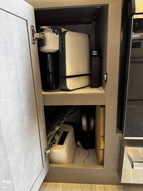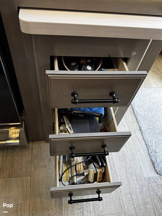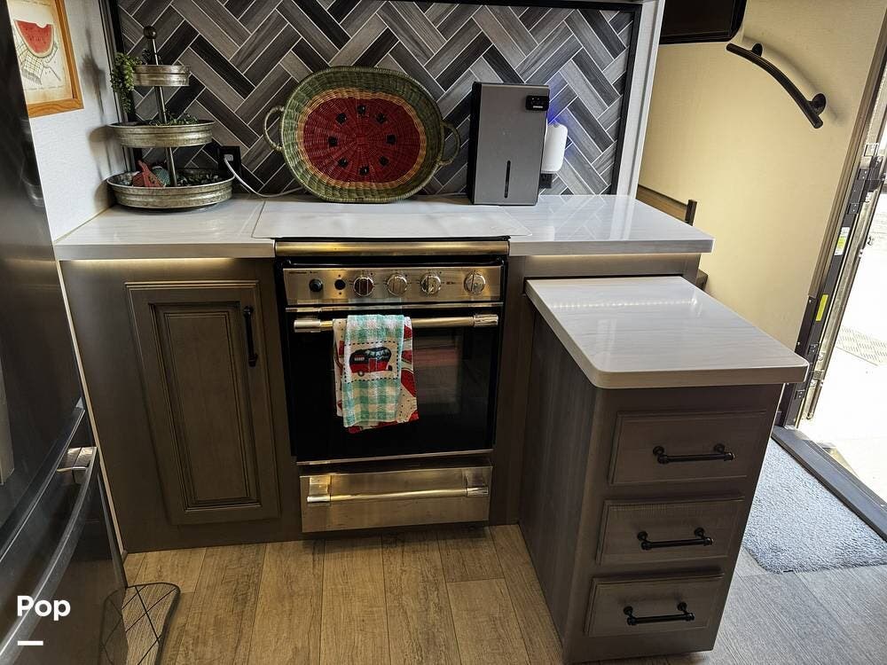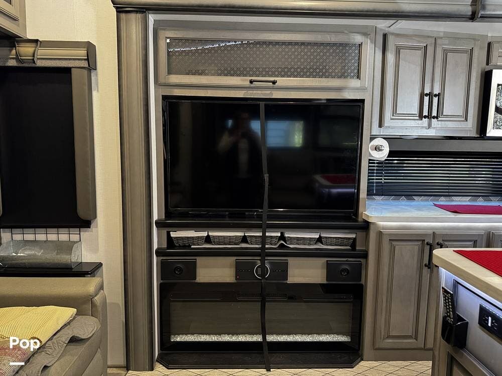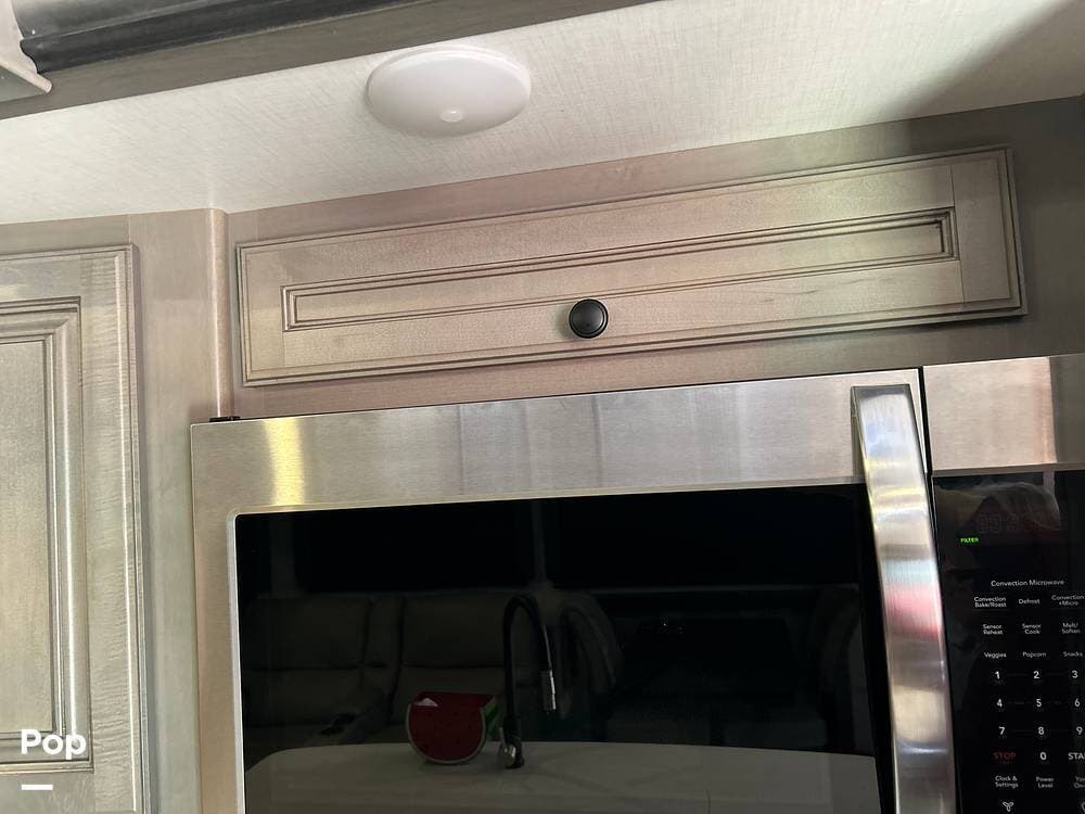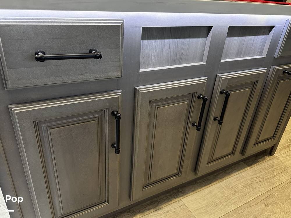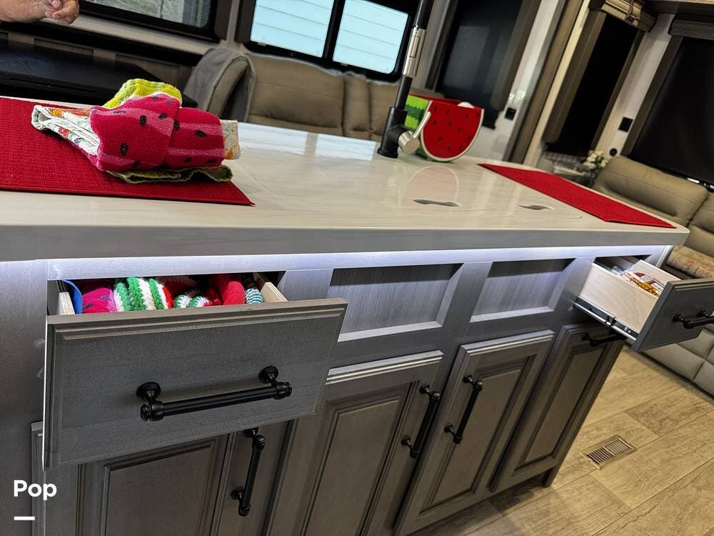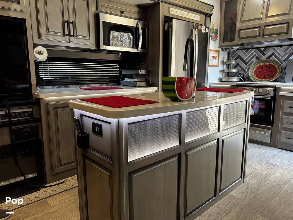 The fit and finish lean toward a true residential design, with hardwood cabinetry, solid-surface countertops, and upgraded entertainment features, including a premium sound system and a large television setup. The kitchen is positioned right in the center of the coach and offers an island workspace, a residential refrigerator, a convection microwave, and a three-burner cooktop, making it ideal for extended stays or full-time living.