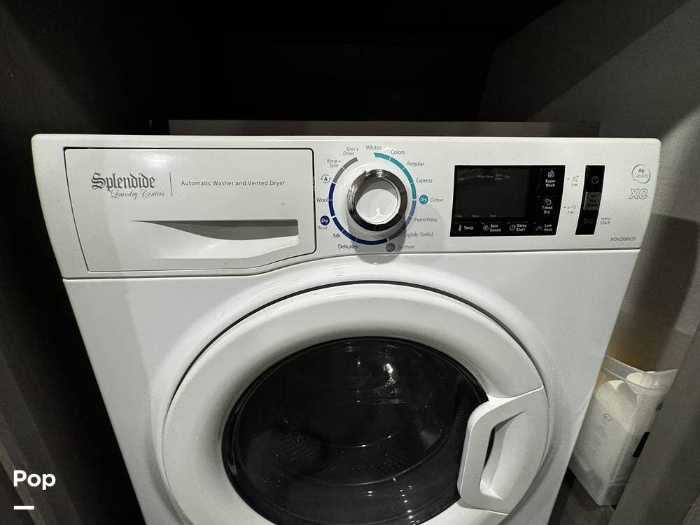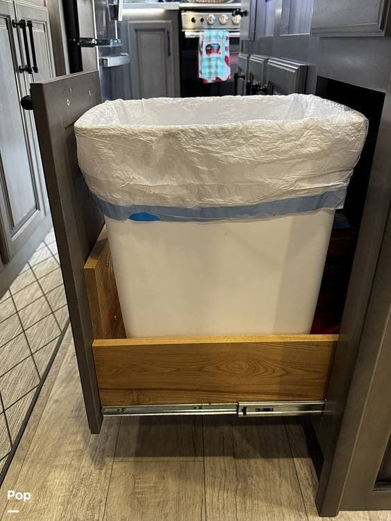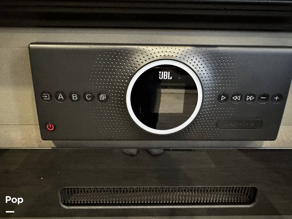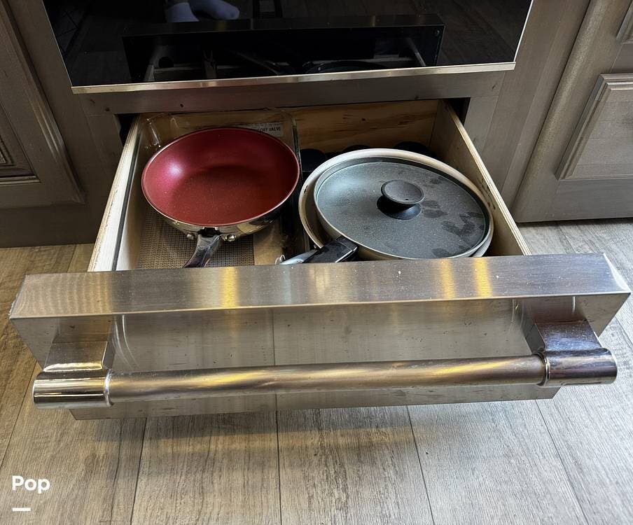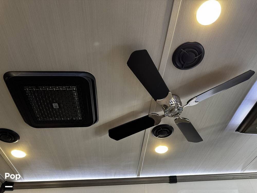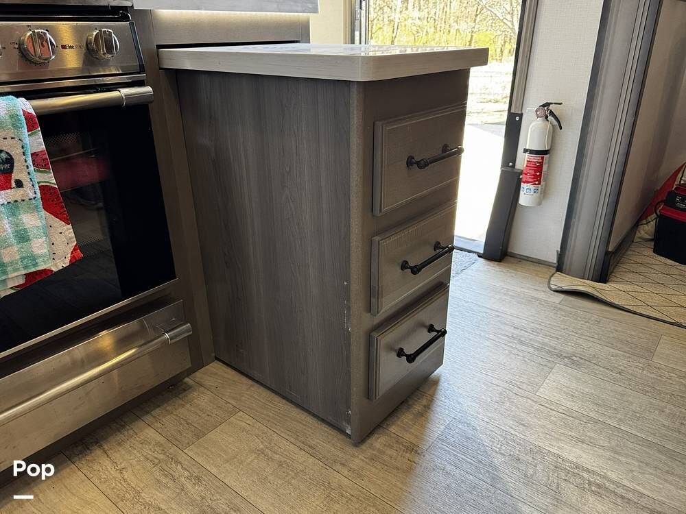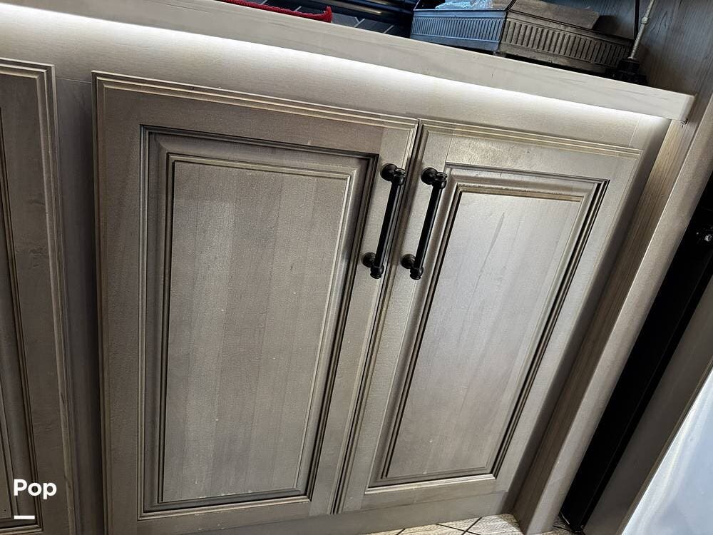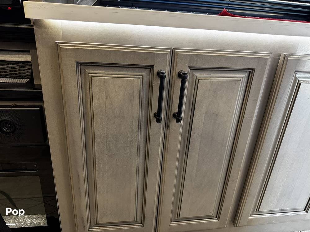 The fit and finish lean toward a true residential design, with hardwood cabinetry, solid-surface countertops, and upgraded entertainment features, including a premium sound system and a large television setup. The kitchen is positioned right in the center of the coach and offers an island workspace, a residential refrigerator, a convection microwave, and a three-burner cooktop, making it ideal for extended stays or full-time living.
