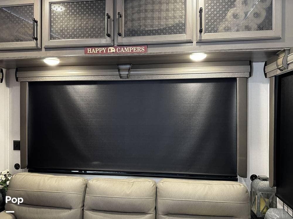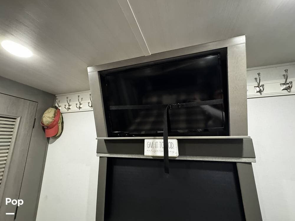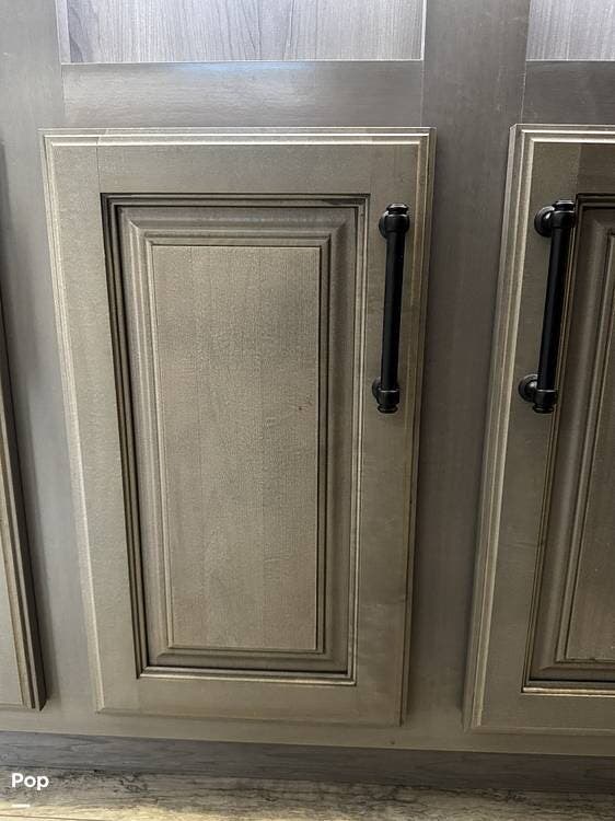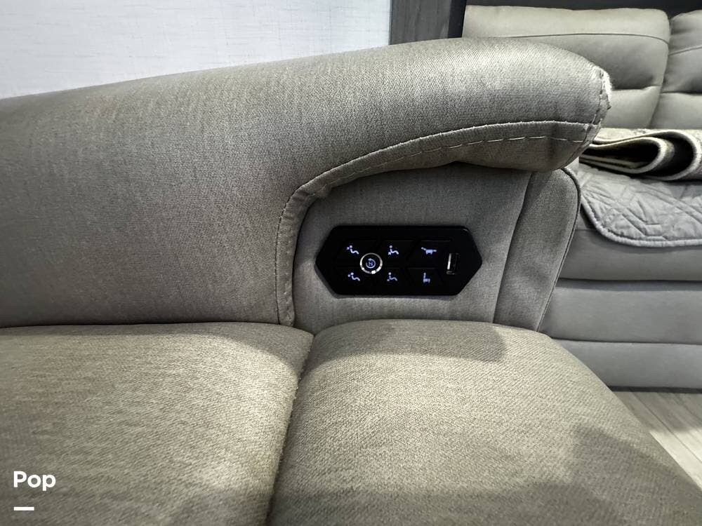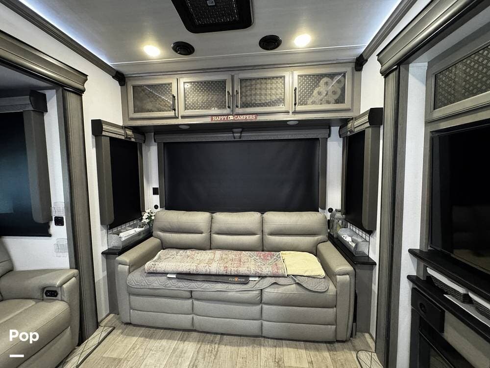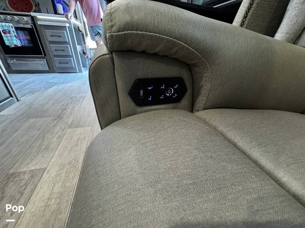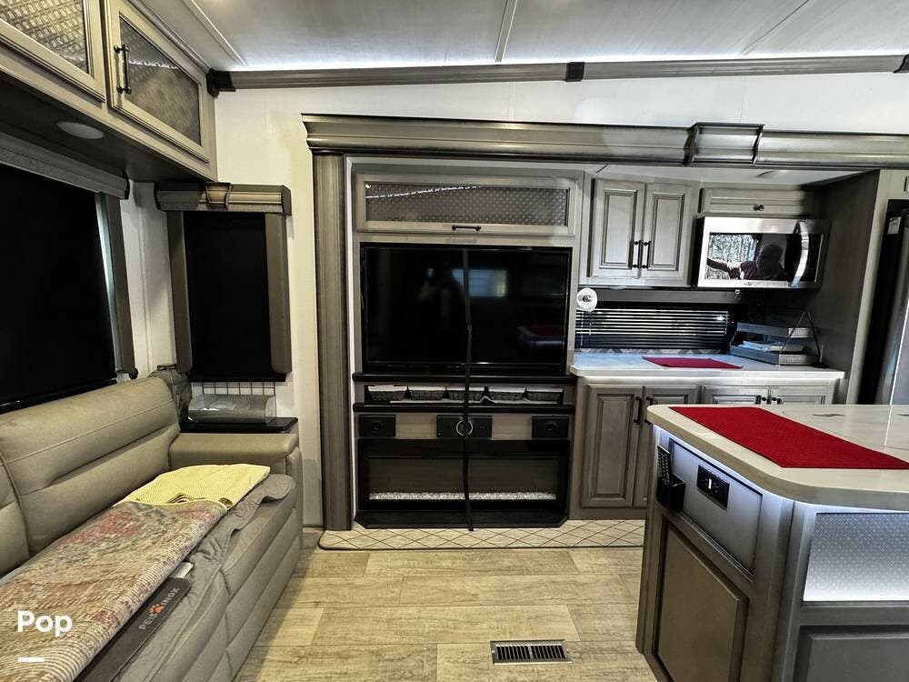 Walking into the 3231CK, the first thing you notice is how open and livable the space feels. The opposing slide-outs create a residential-style living room with theater seating, a large entertainment center, and ample cabinetry.