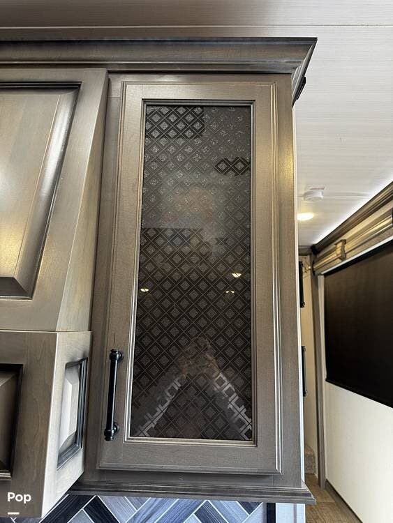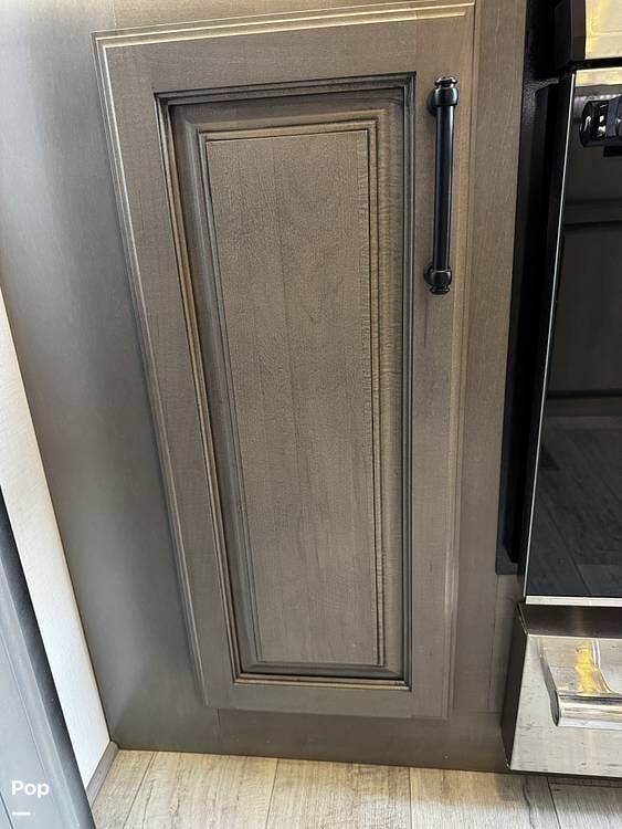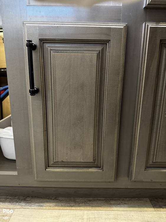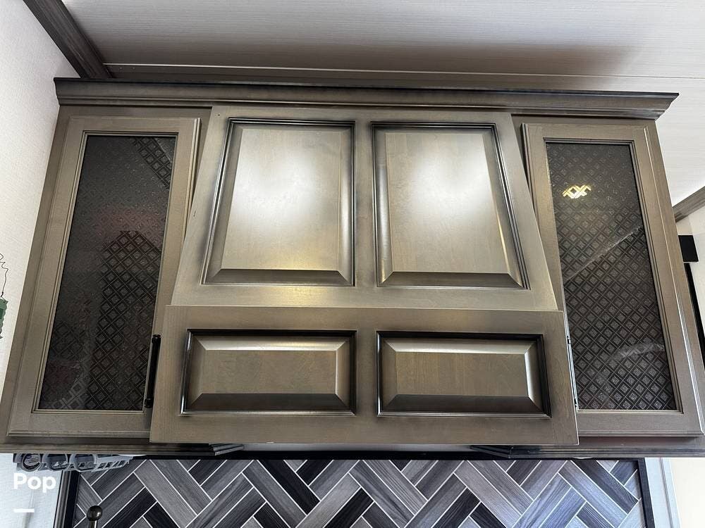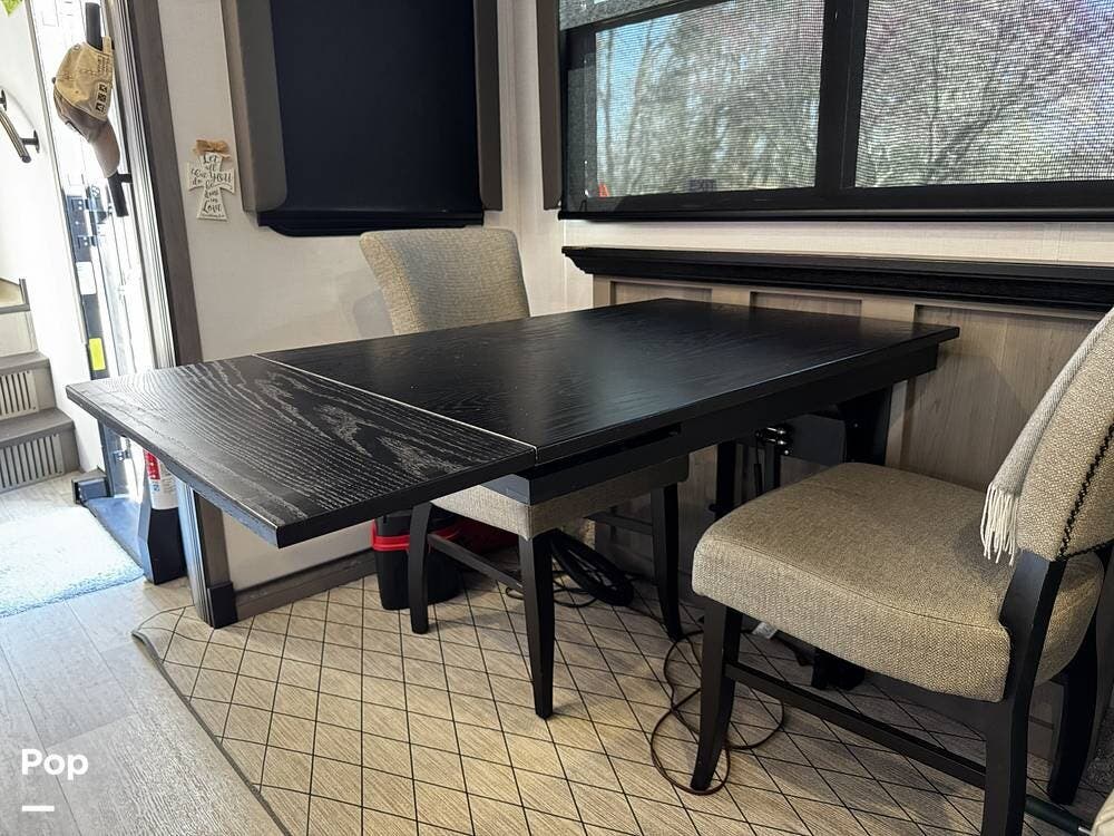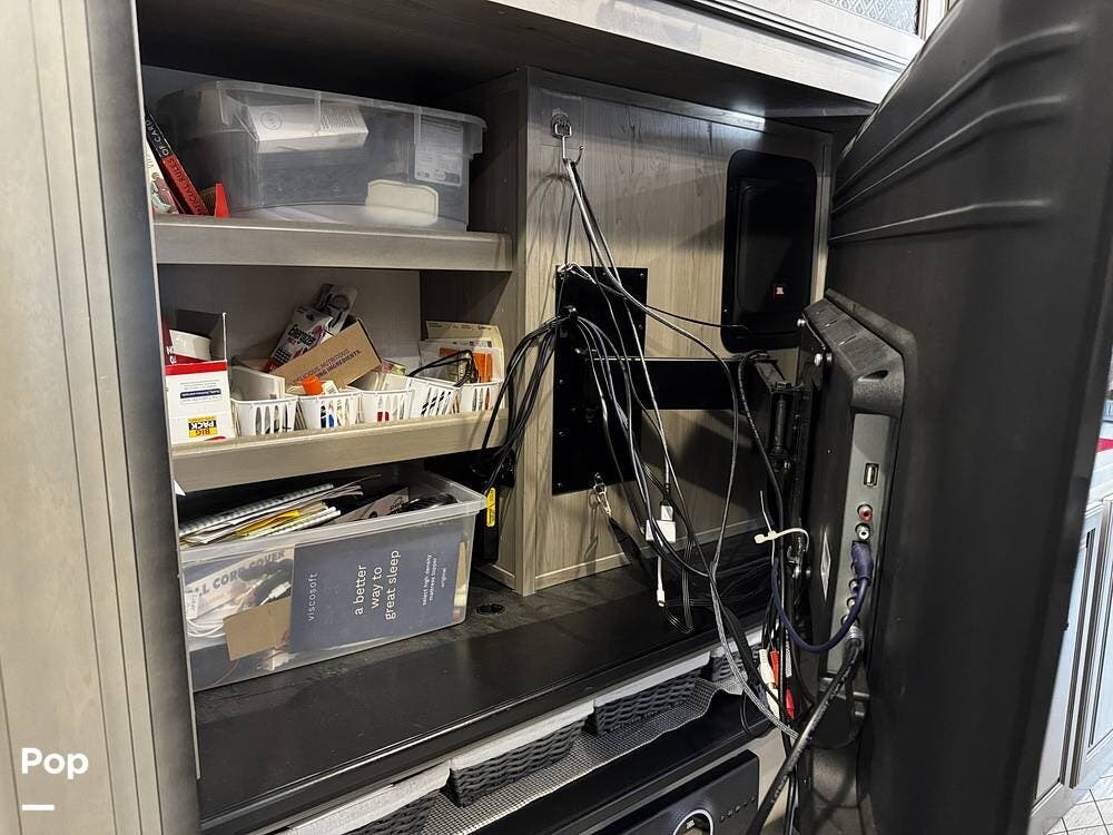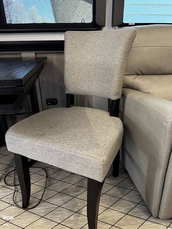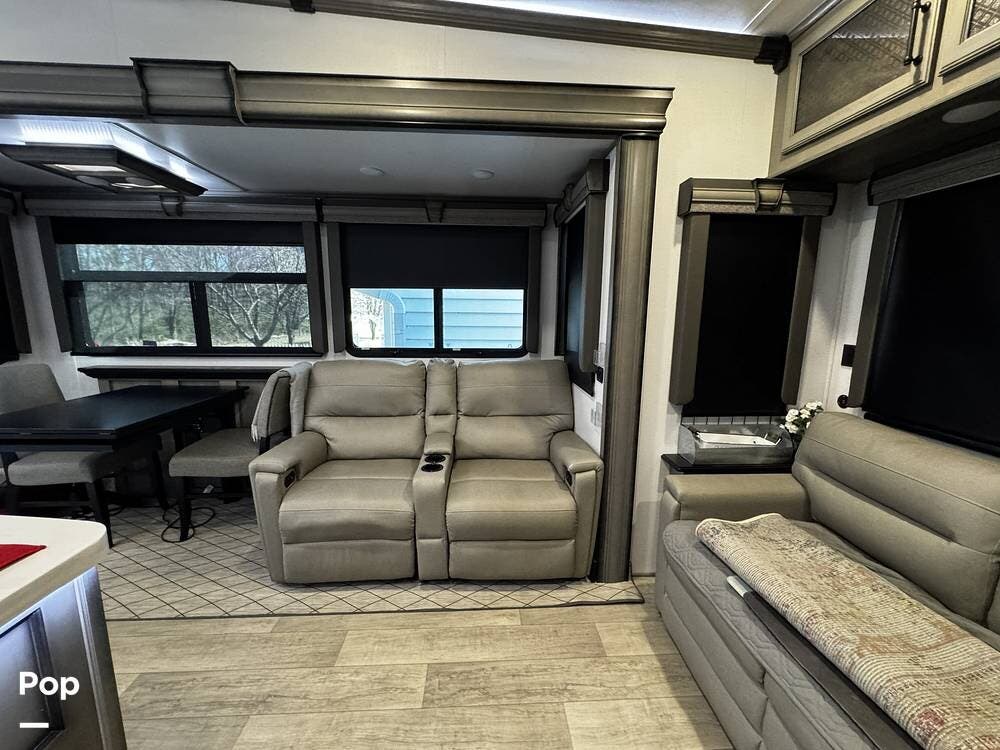 Walking into the 3231CK, the first thing you notice is how open and livable the space feels. The opposing slide-outs create a residential-style living room with theater seating, a large entertainment center, and ample cabinetry.