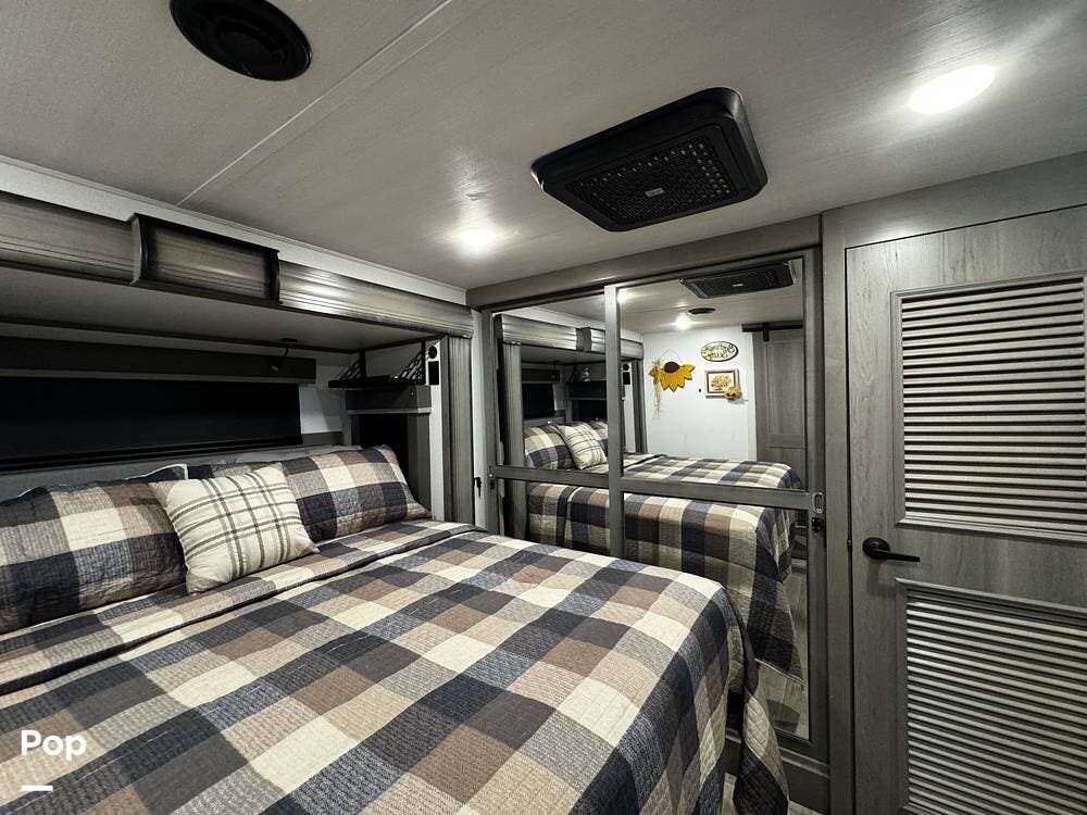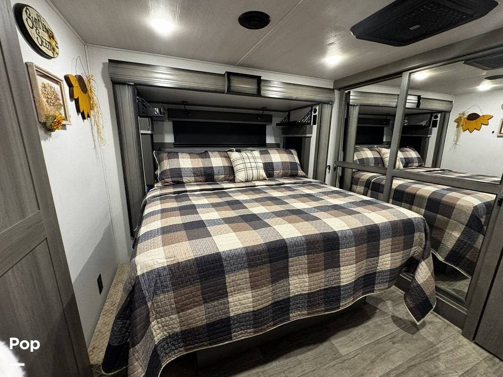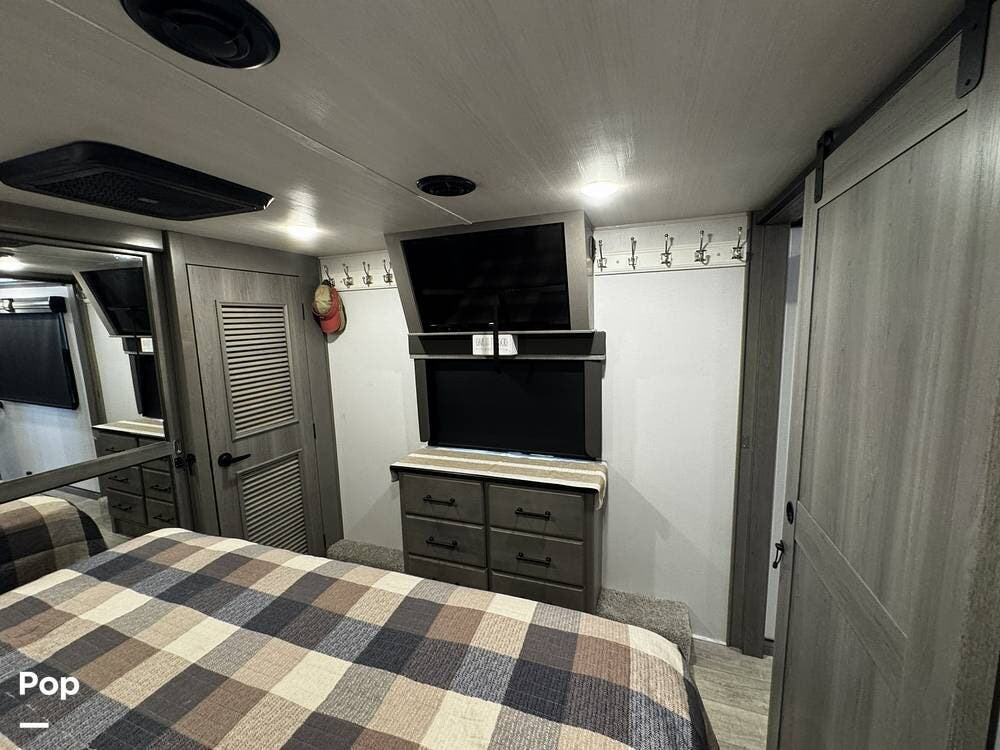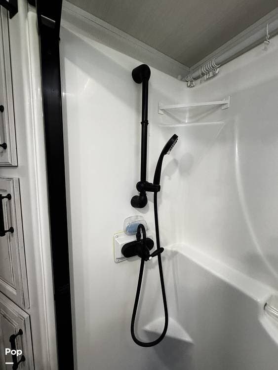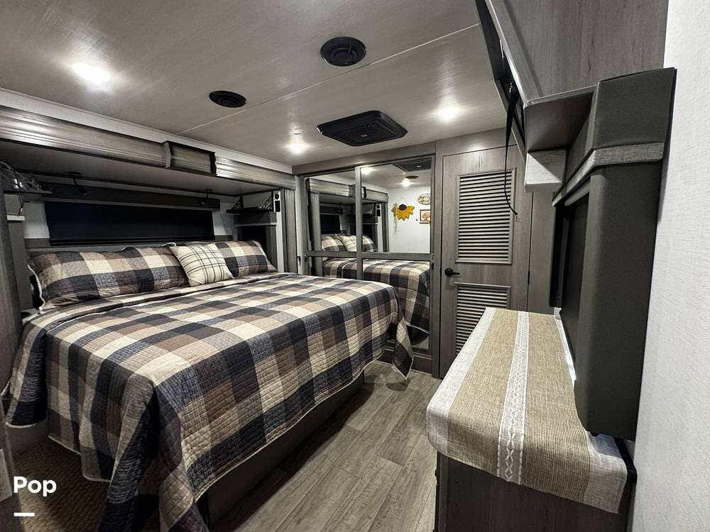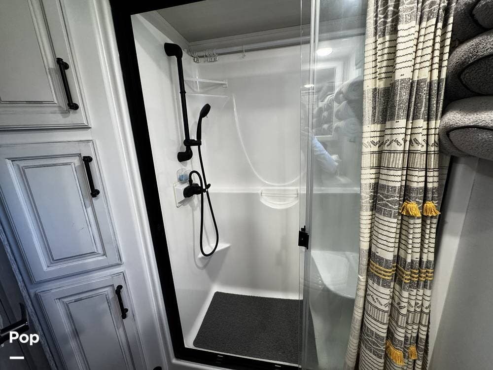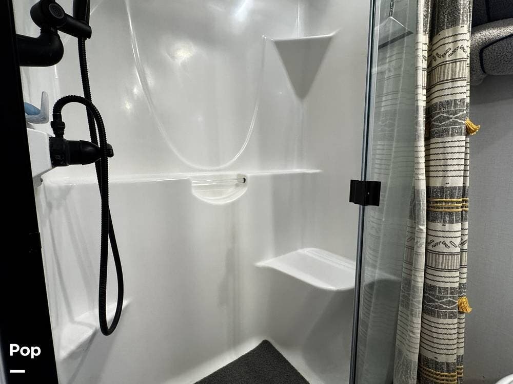 Moving forward, the bathroom and bedroom continue that residential feel with a spacious layout, quality finishes, and a front master suite that can accommodate a king-size bed. The unit is built for comfort in a variety of climates, equipped with dual air conditioners and a furnace, along with a gas and electric water heater, supporting longer showers and day-to-day living without compromise.