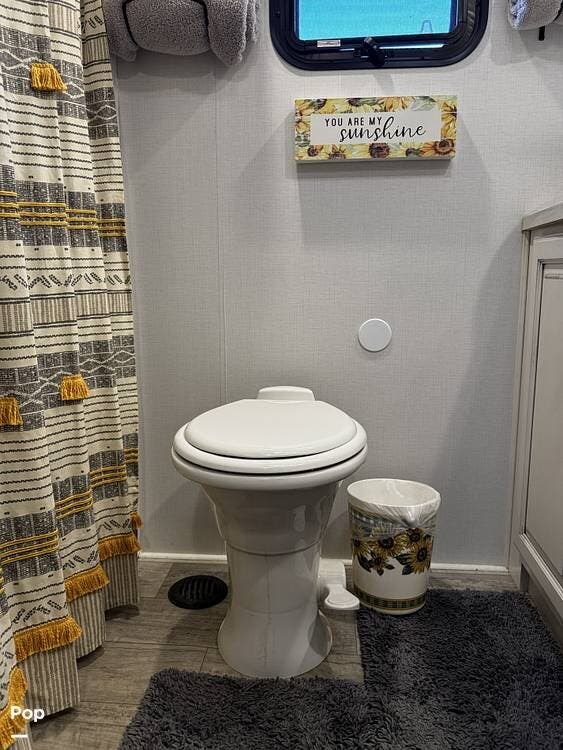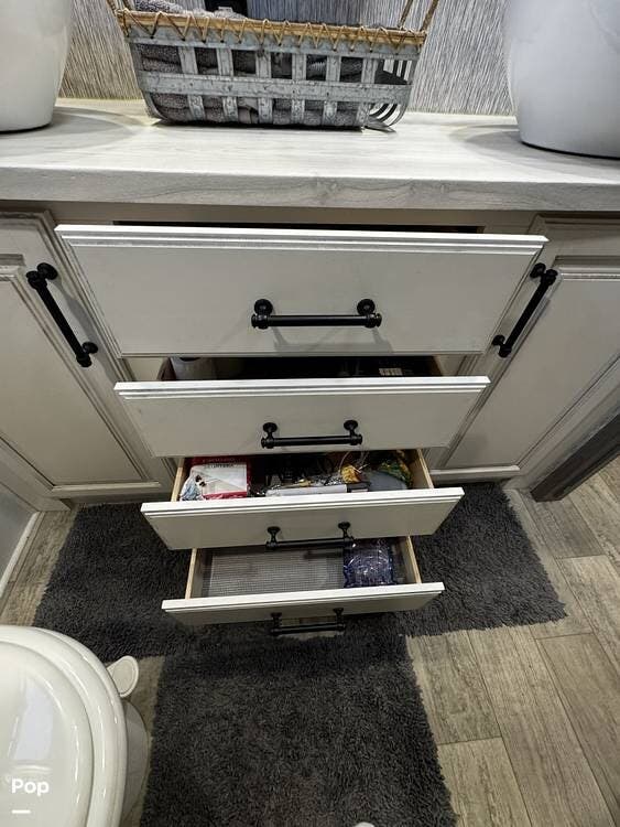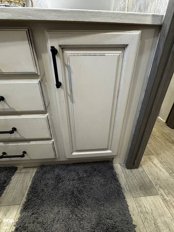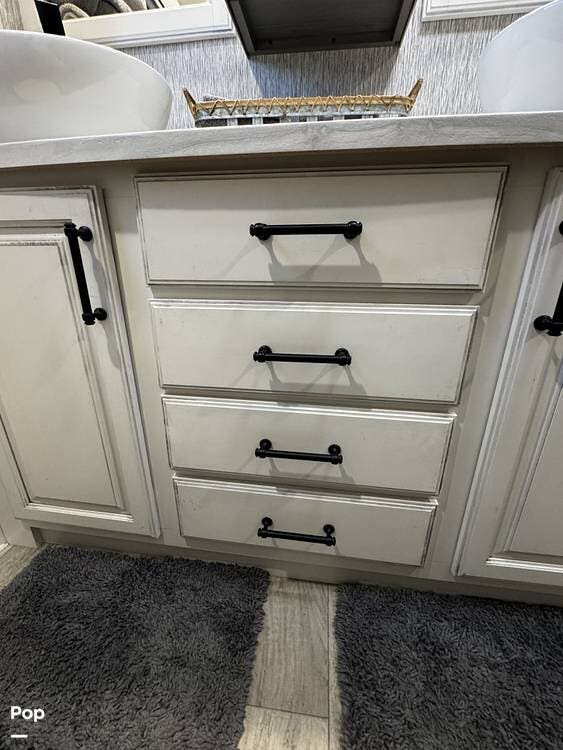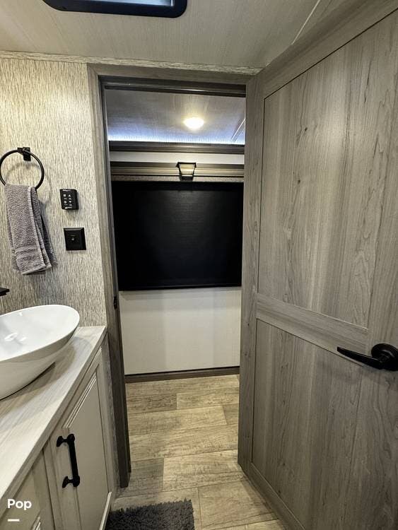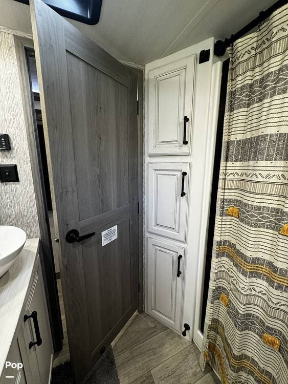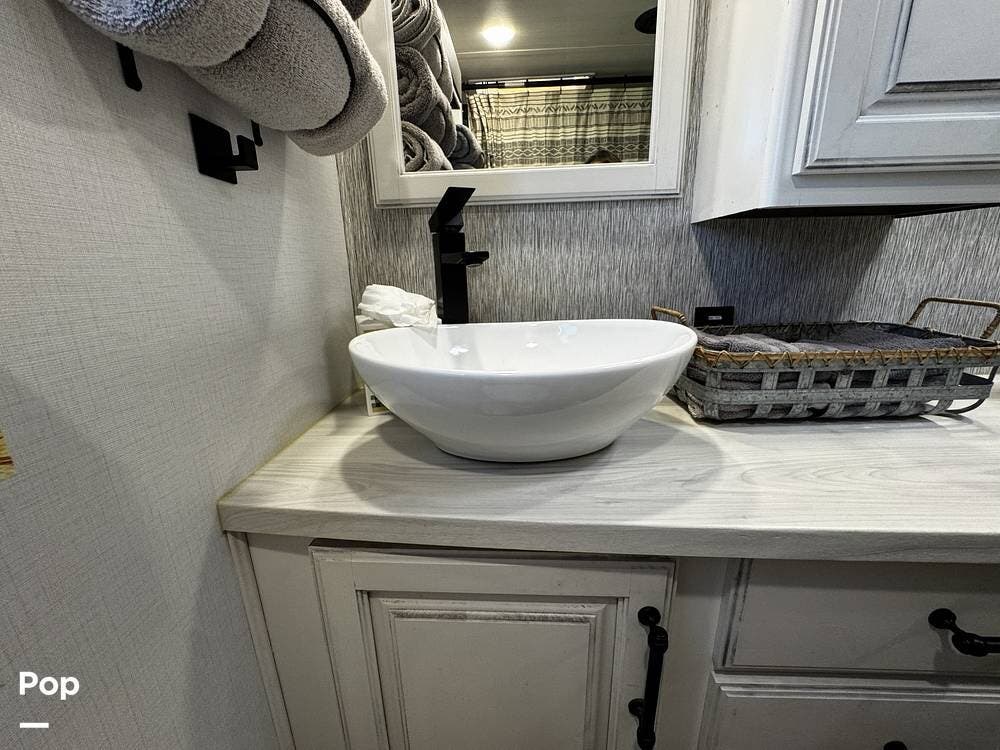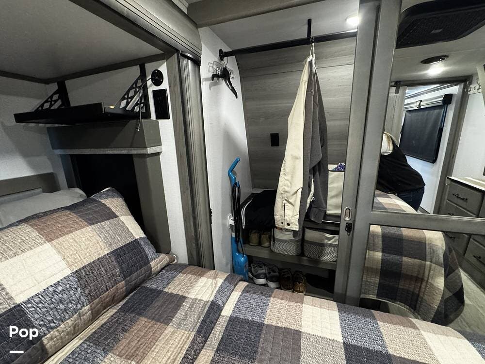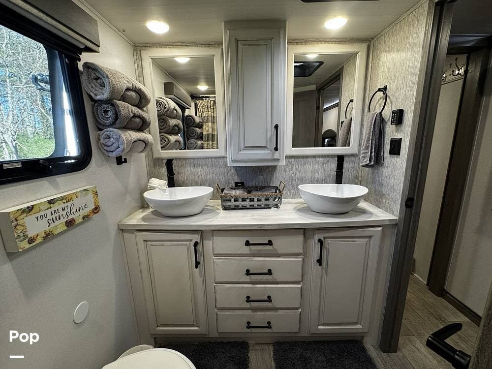 Moving forward, the bathroom and bedroom continue that residential feel with a spacious layout, quality finishes, and a front master suite that can accommodate a king-size bed. The unit is built for comfort in a variety of climates, equipped with dual air conditioners and a furnace, along with a gas and electric water heater, supporting longer showers and day-to-day living without compromise.