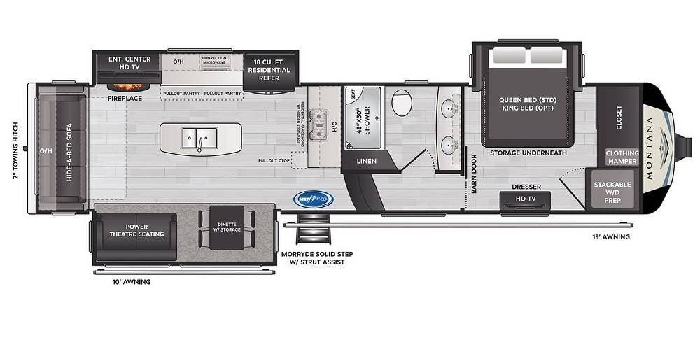 From a construction standpoint, the Montana is built on a heavy-duty frame with upgraded axles and suspension, along with a fully walkable roof and insulated underbelly designed for four-season capability. Features like frameless windows, hydraulic leveling, and high-capacity holding tanks further reinforce its position as a long-term living platform rather than just a weekend camper.