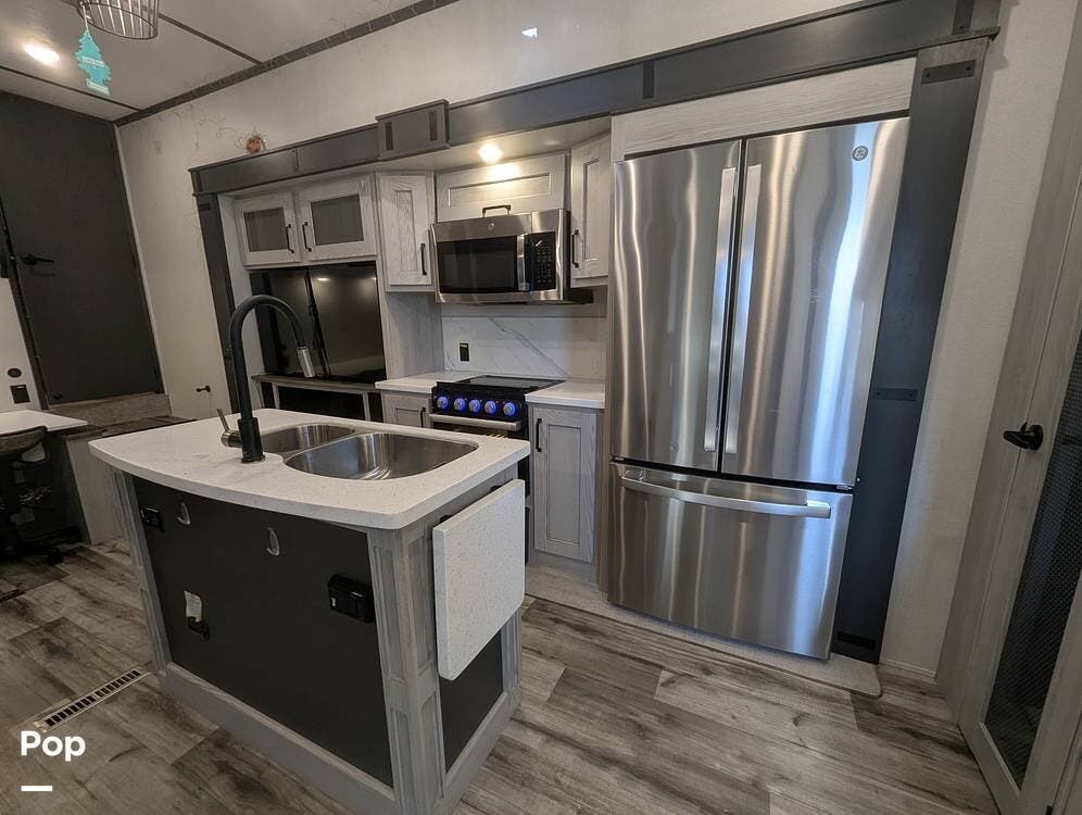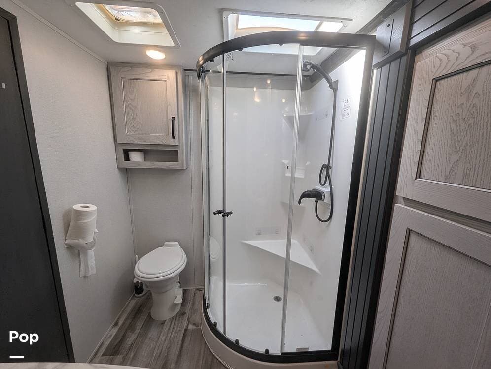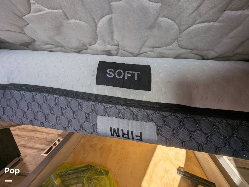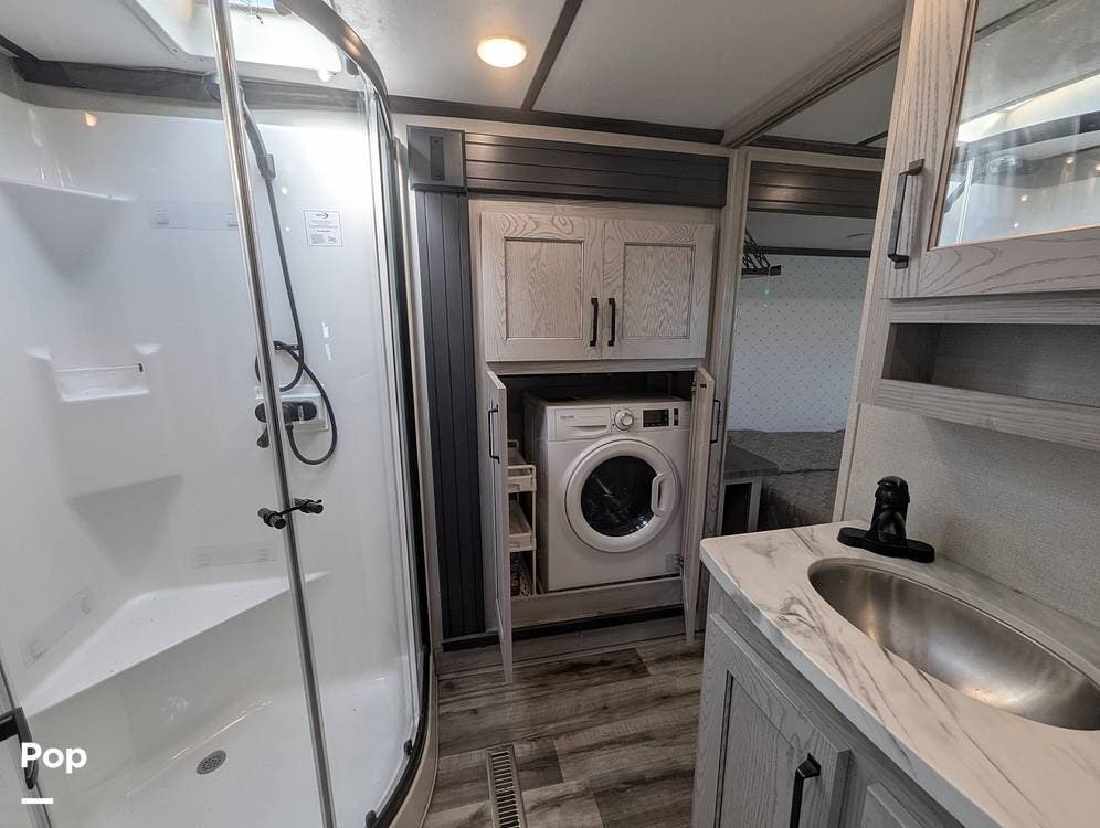 The master bedroom has a king bed, and there is a washer-dryer combo neatly tucked in the bathroom cabinet. The two soft-start AC units cool this RV nicely.