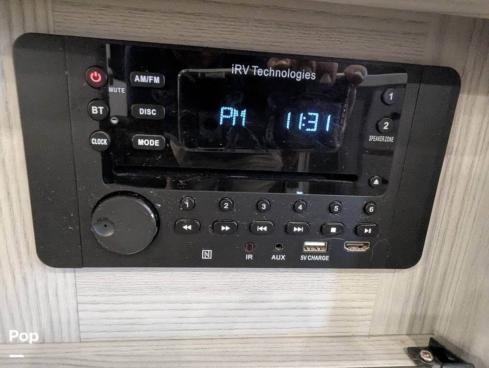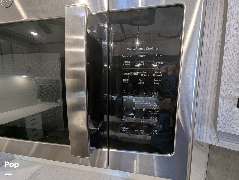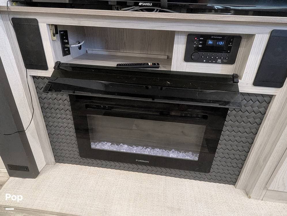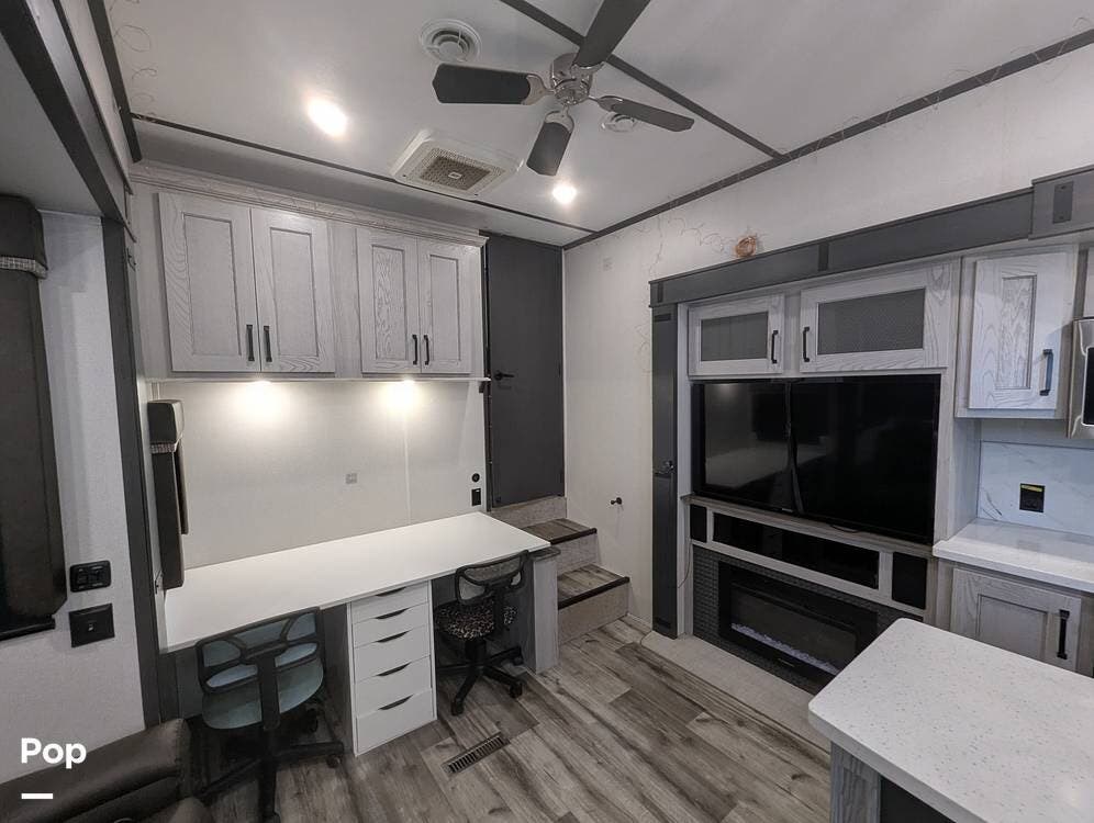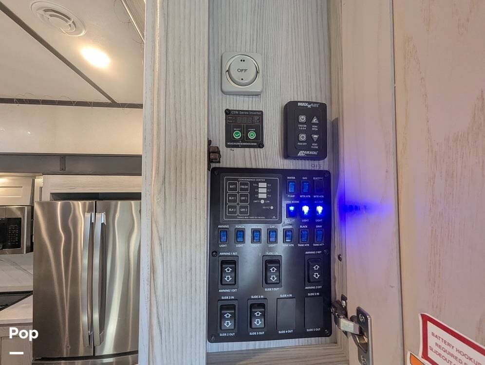 The master bedroom has a king bed, and there is a washer-dryer combo neatly tucked in the bathroom cabinet. The two soft-start AC units cool this RV nicely.