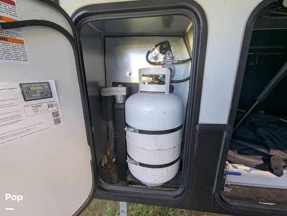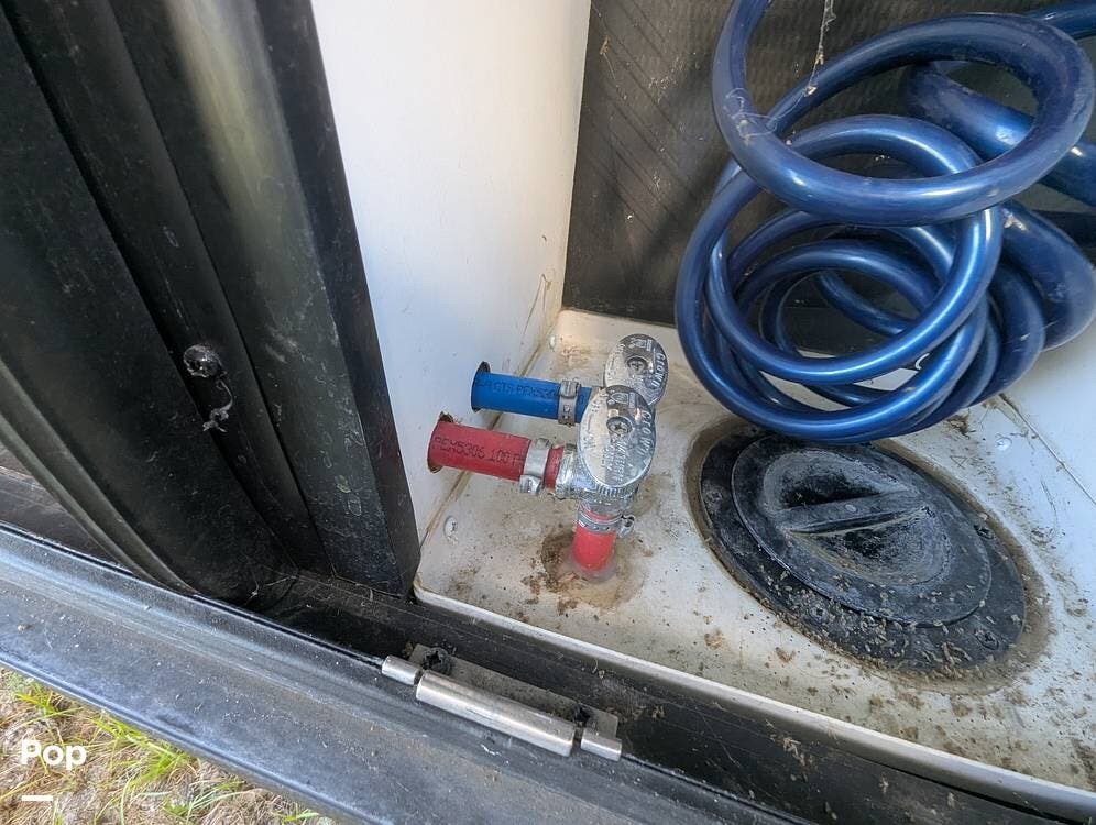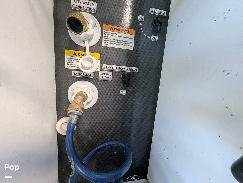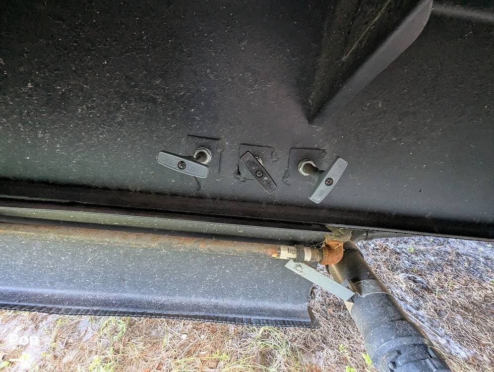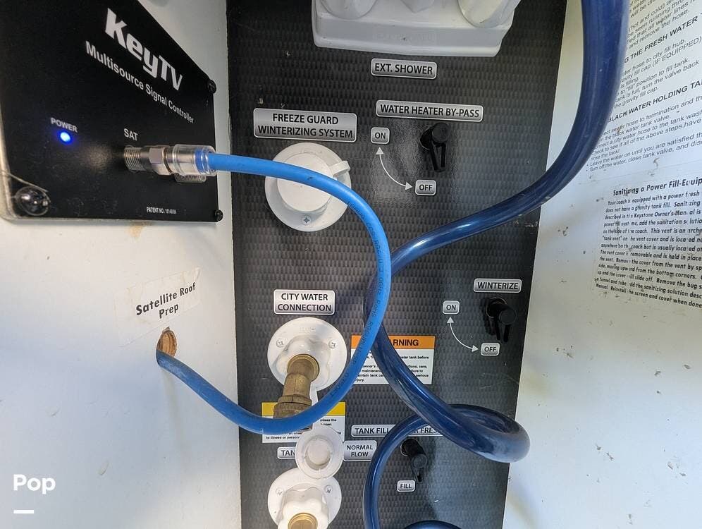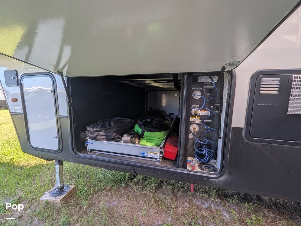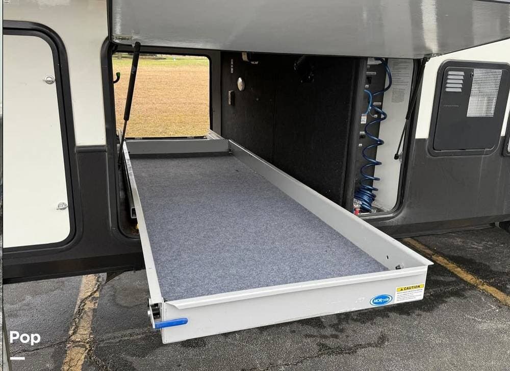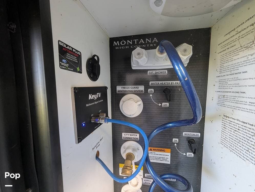 Outside, the RV has an outdoor refrigerator and has a large pass-through basement compartment with an easy slide tray in both directions. The rear of the camper has a nice, large storage compartment as well. This Montana has leveling jacks. Also includes a freshwater pump setup and macerator pump for the portable tanks (Freshwater 60 gal, grey 87 gallons).