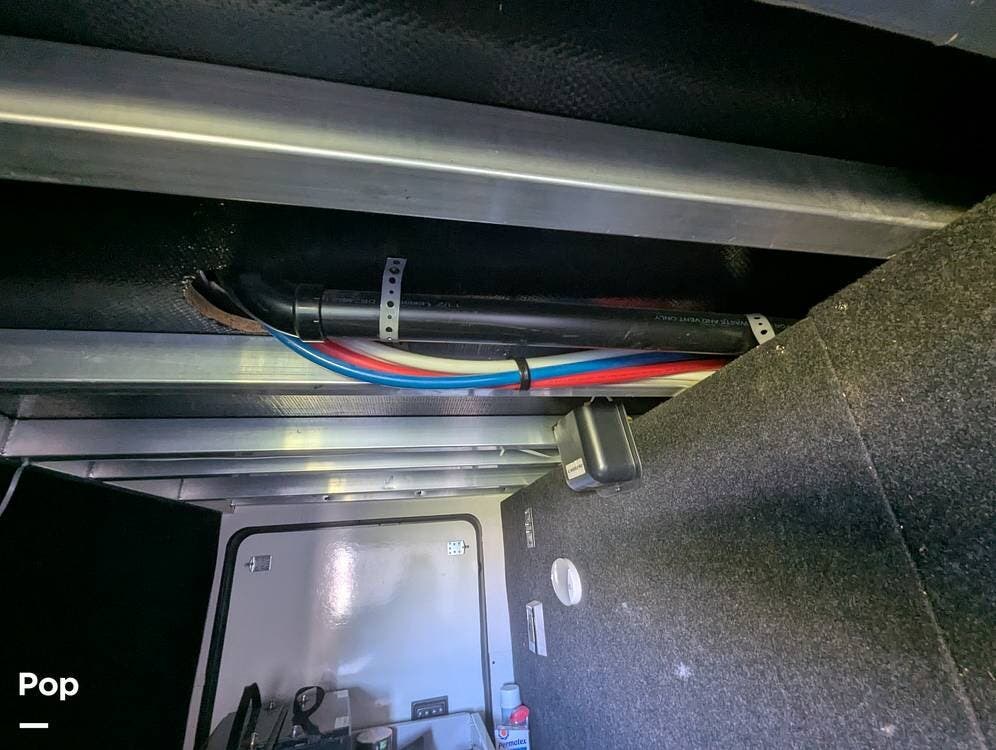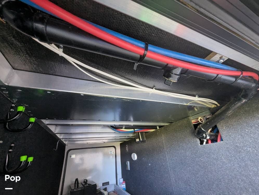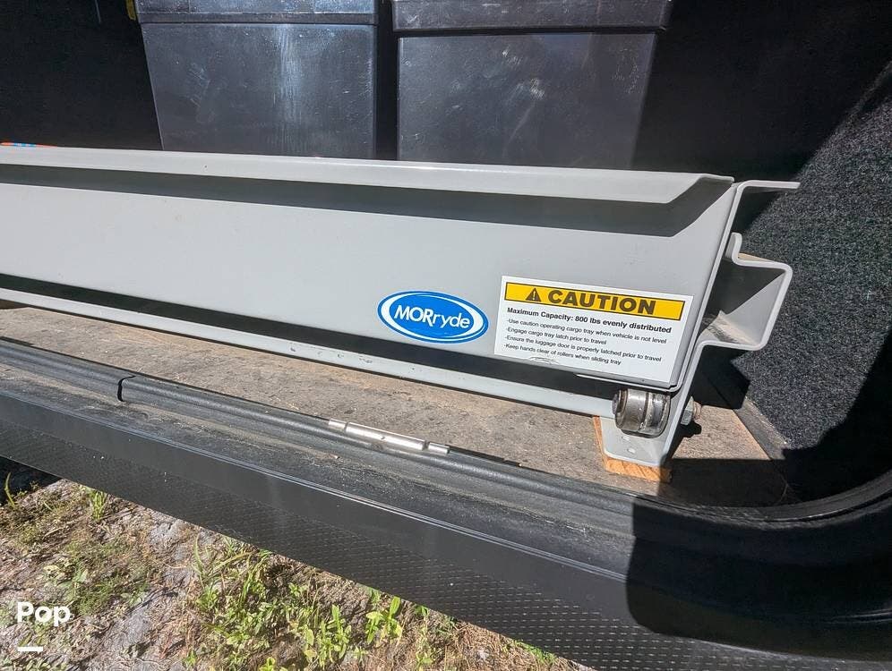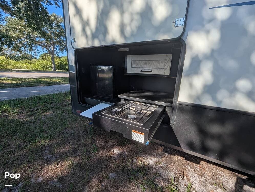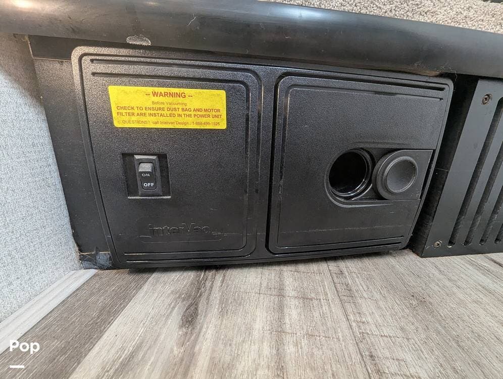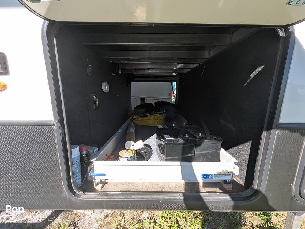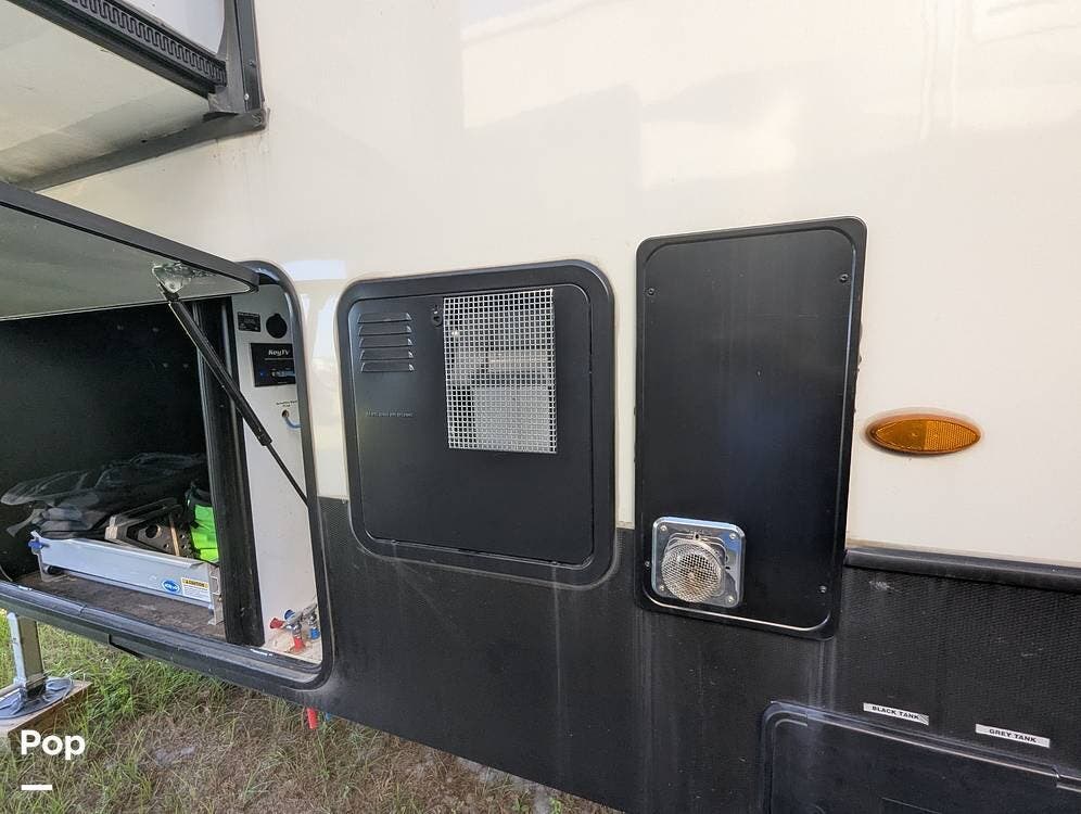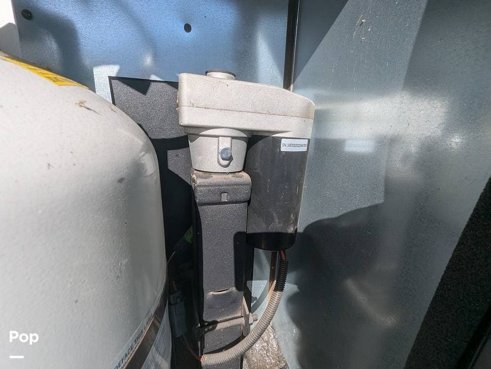 Outside, the RV has an outdoor refrigerator and has a large pass-through basement compartment with an easy slide tray in both directions. The rear of the camper has a nice, large storage compartment as well. This Montana has leveling jacks. Also includes a freshwater pump setup and macerator pump for the portable tanks (Freshwater 60 gal, grey 87 gallons).