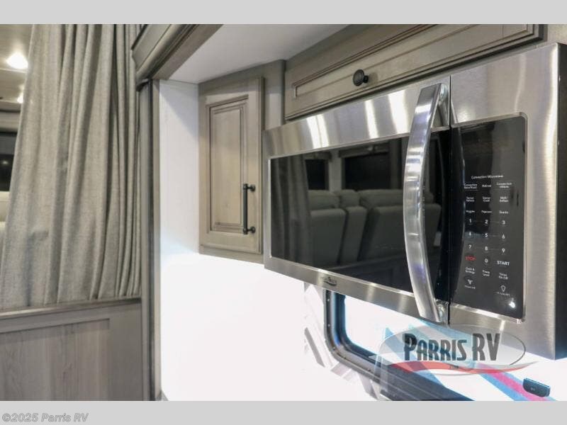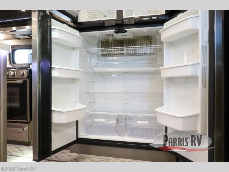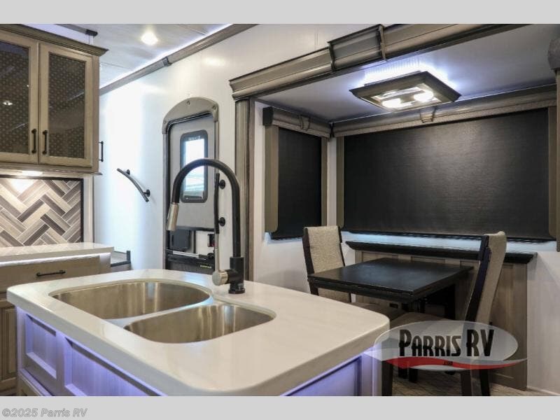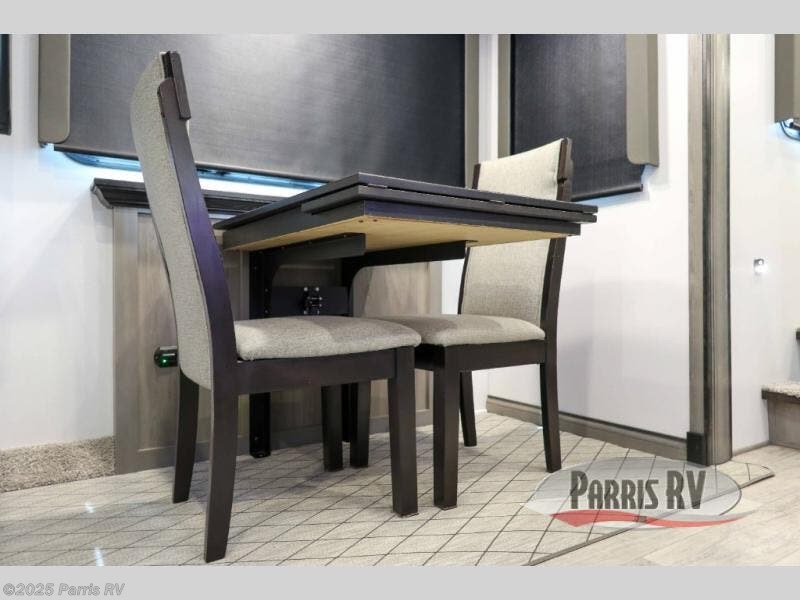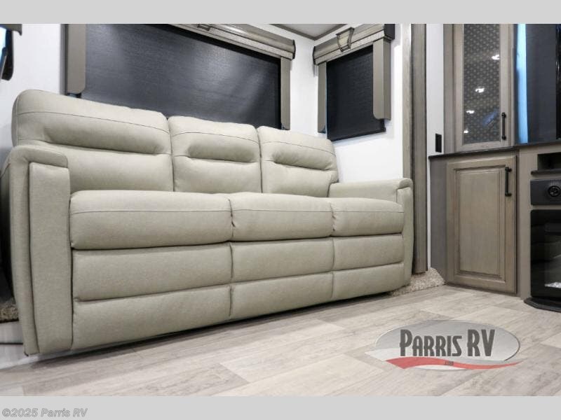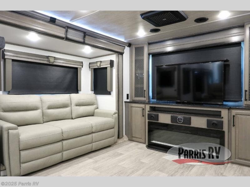 The coffee lover will enjoy camping in this fifth wheel with the coffee station in the kitchen! The kitchen also has an island, a large pantry, a glass top range with convection microwave and range hood that has a pull-down spice rack, a 18 cu. ft. residential refrigerator, and floor cabinets for your storage needs. Eat your meals and play card games at the free standing legless dinette with 110V outlets to charge your electronics. The separated living area has opposing hide-a-bed sofas and power Thomas Payne theater seating across from a rear entertainment center with a telescoping 50" LCD HDTV and a 5,000 BTU decorative fireplace heater with storage on either side. When you're ready to wind down your nights, head to the front private bedroom to enjoy a good night's rest on the king bed slide with storage underneath and there is a front closet with a clothing hamper and an area to add the optional stackable washer and dryer to have clean clothes for your longer trips!